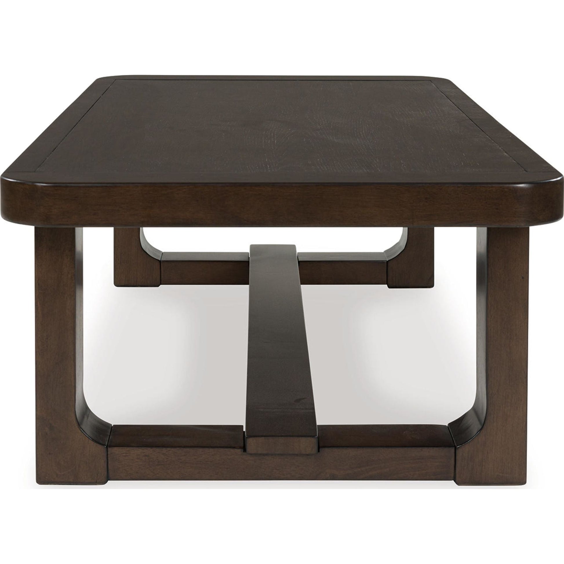 If casual contemporary style is your thing, then you'll love this coffee table. Its thick solid wood edge, softly rounded corners and dark wood-tone finish lend a soothing sensibility. Sleek and stylish, this piece is a fresh take on cool for the modern home.