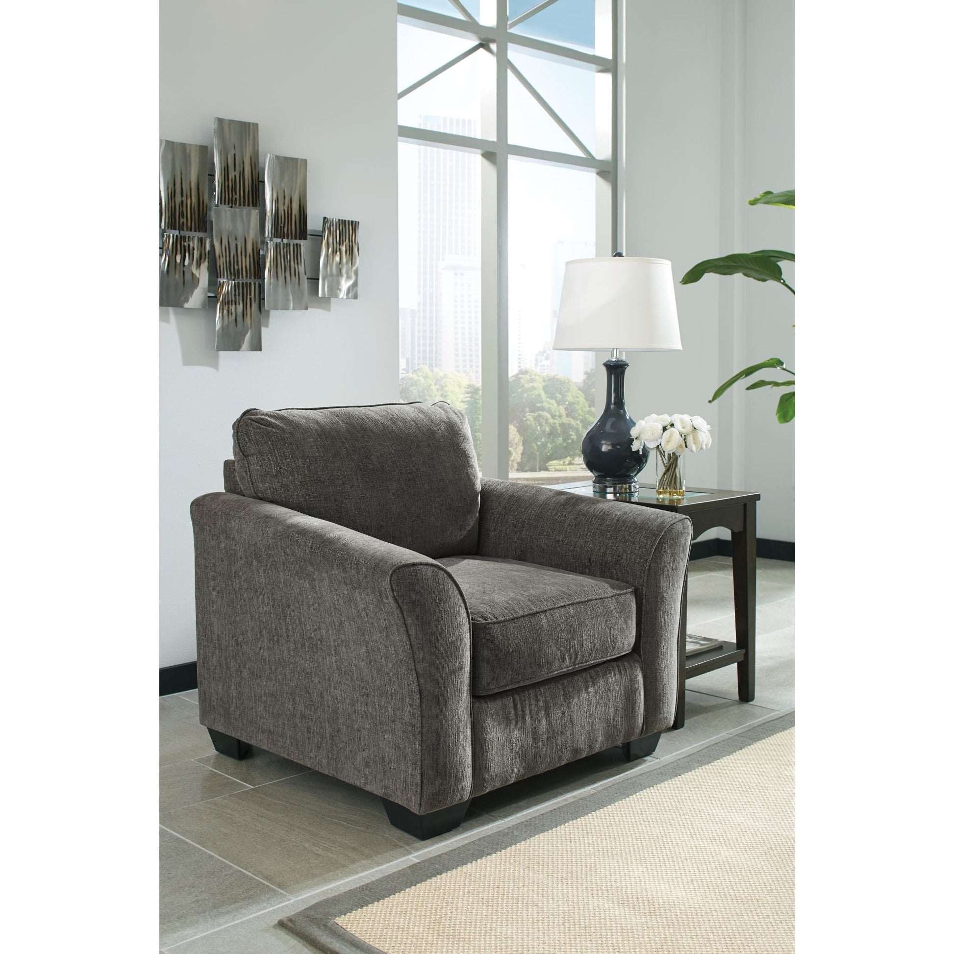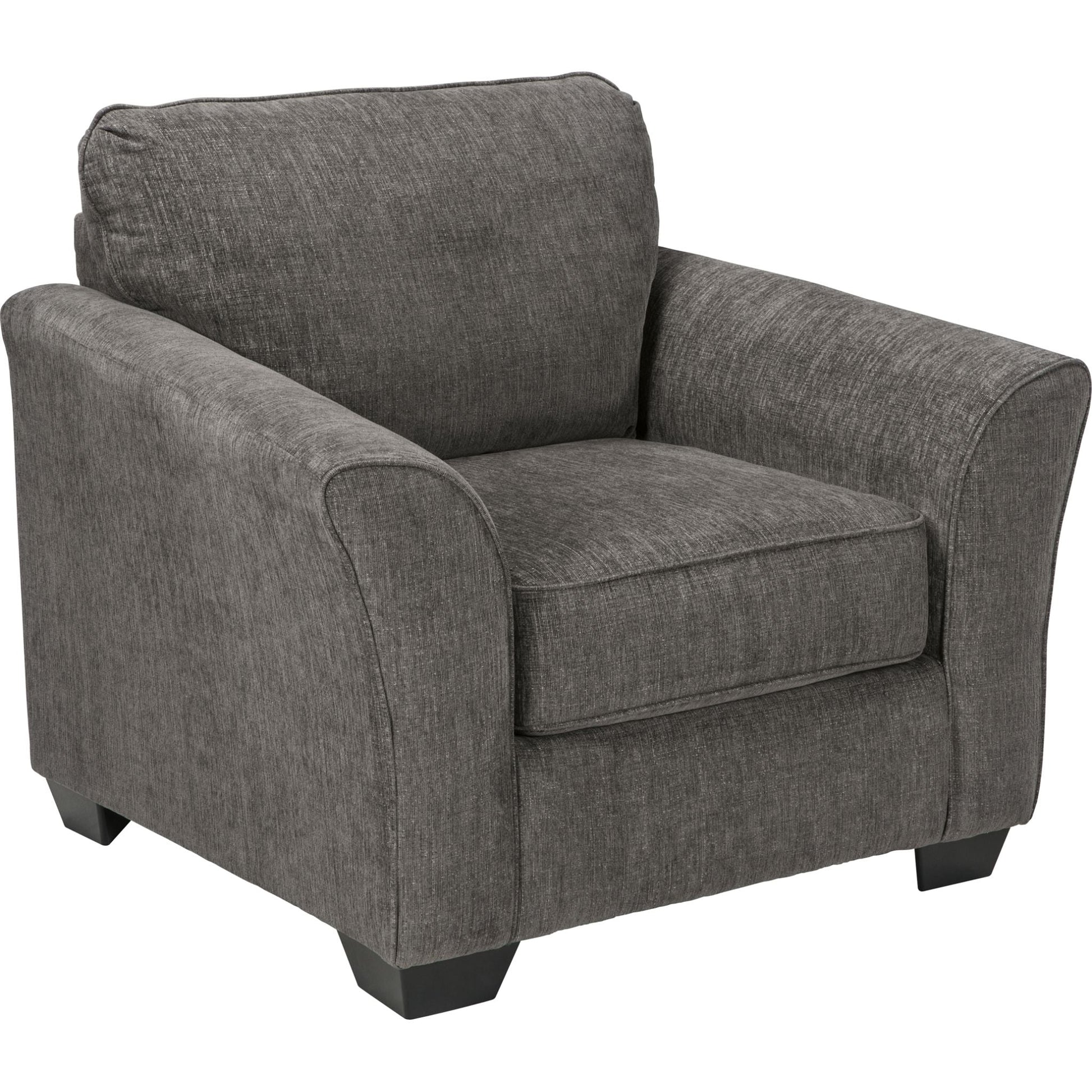 Slate colored menswear chenille makes this chair a show stopping sight and comfortable resting place. Flared arms soften the look and invite you to take a seat. Plush and roomy, this is the perfect neutral chair.