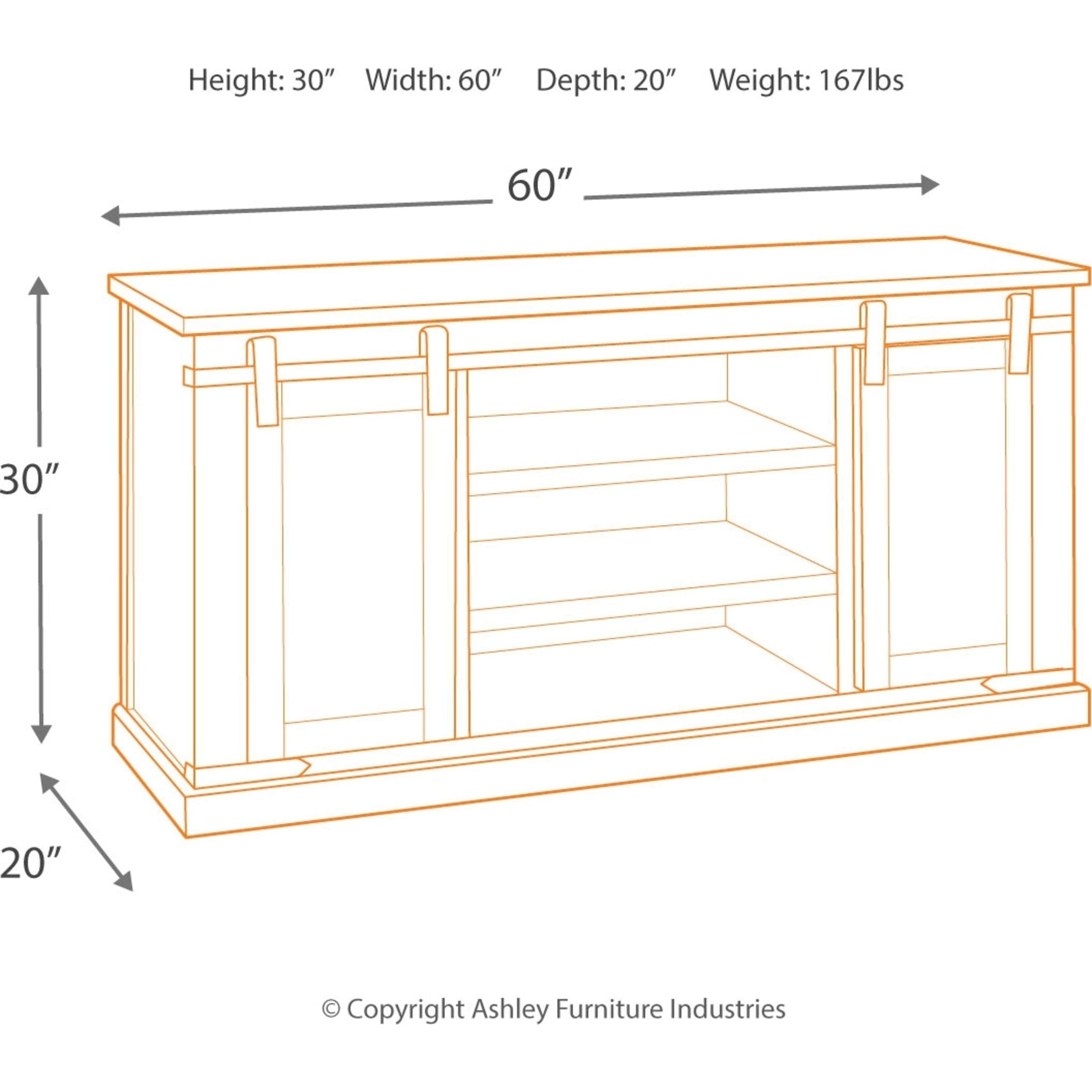 Add a touch of country style to your living area with this 60' TV stand. It’s visually appealing with the flexibility you need. Adjustable end shelves offer lots of storage, while the two stationary middle shelves are roomy for TV components. Two sliding barn doors can easily be positioned as you desire. For an uncluttered look, slide the doors over the two ends and use those areas for hidden storage—what a deal.