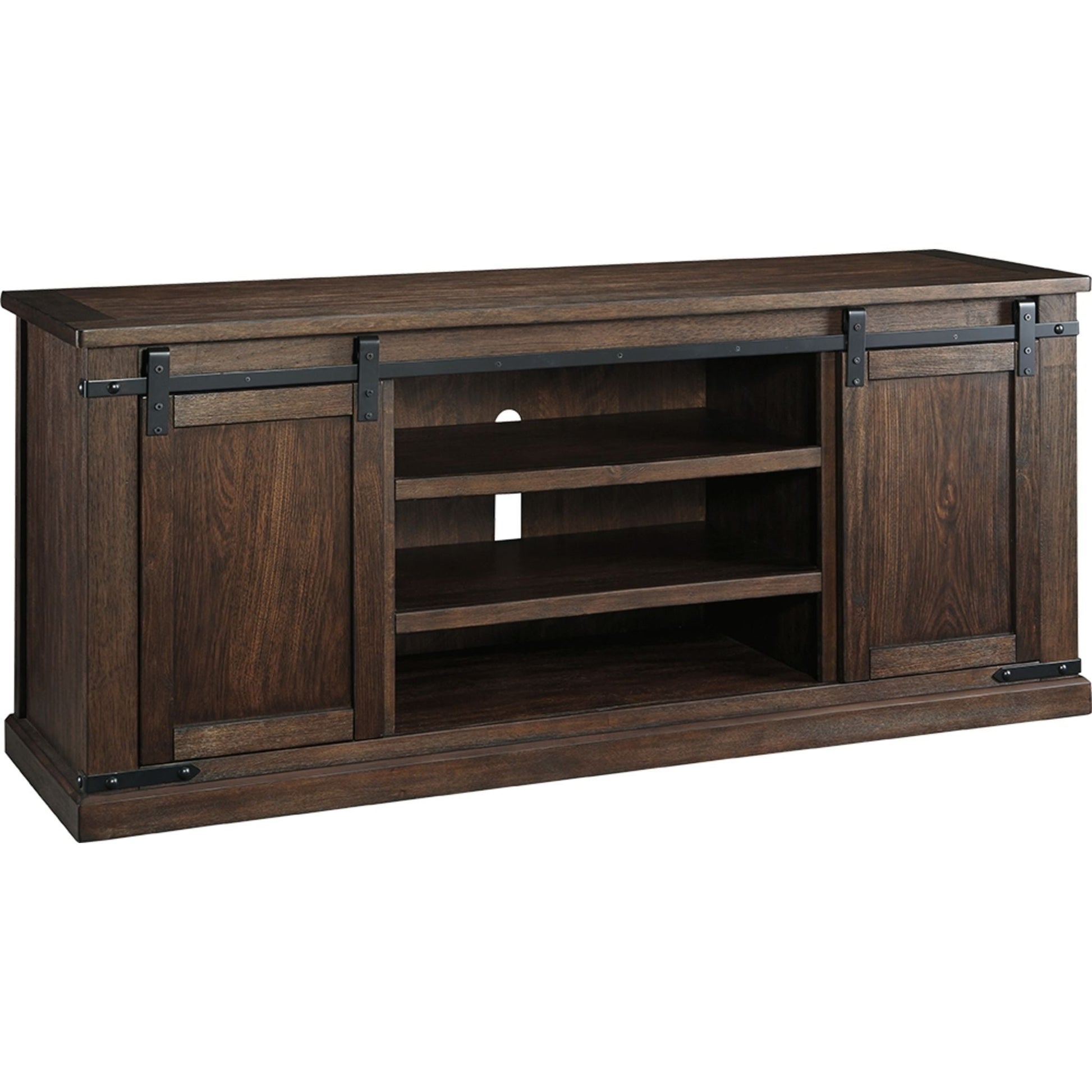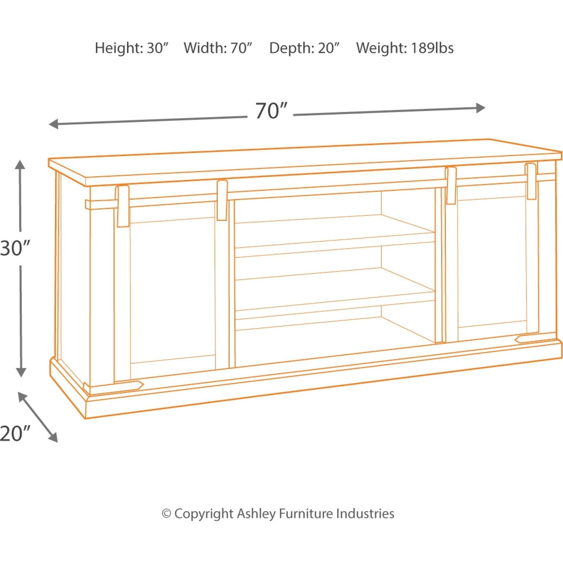 Add a big touch of country style to your living area with this extra large 70' TV stand. It’s visually appealing with the flexibility you need. Adjustable end shelves offer lots of storage, while the two stationary middle shelves are roomy for housing media equipment. Two sliding barn doors can easily be positioned as you desire. For an uncluttered look, slide the doors over the two ends and use those areas for hidden storage—what a deal.