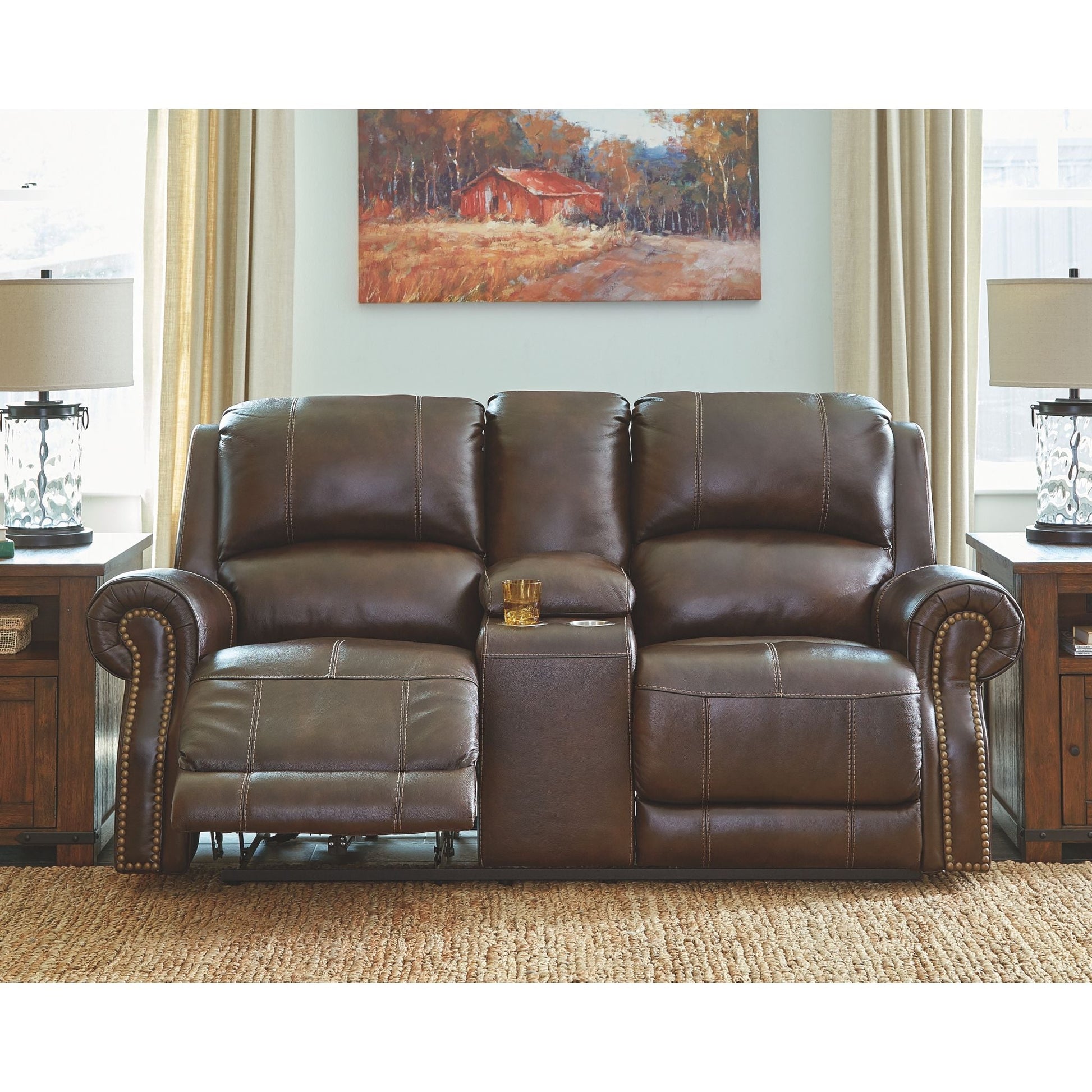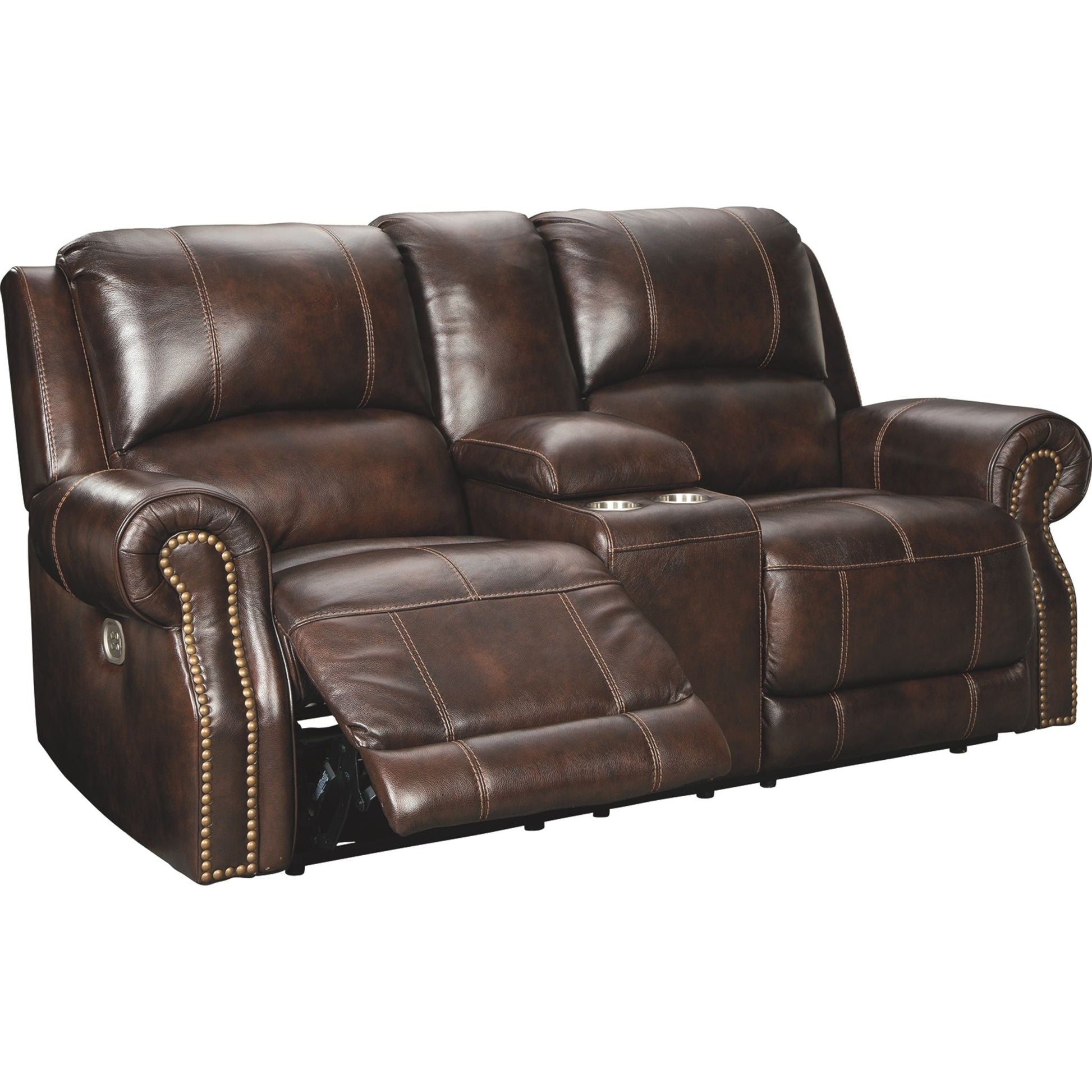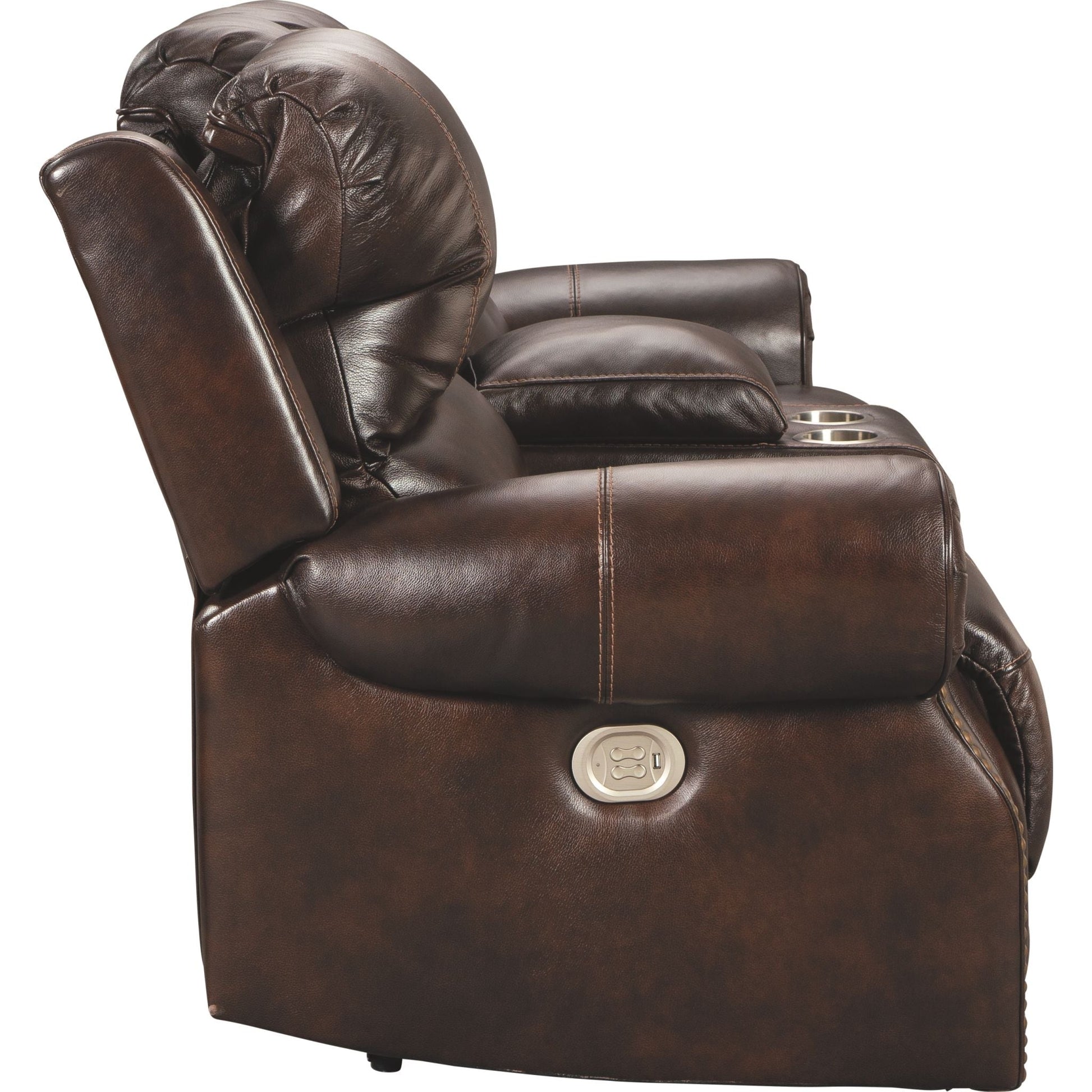 Recline in the modern luxury and convenience of this power reclining loveseat with Easy View™ power adjustable headrest. With the touch of a button, you can easily position the recliner and its headrest for maximum comfort. Plus, with the convenient USB charging ports, electronics can be charged without having to get up. The genuine leather upholstery is paired with expertly matched faux leather for affordability. The center console tops off convenience with hidden storage under center armrest—perfect for tucking away remotes. You'll love keeping a drink at your side with the handy stainless steel cup holder.