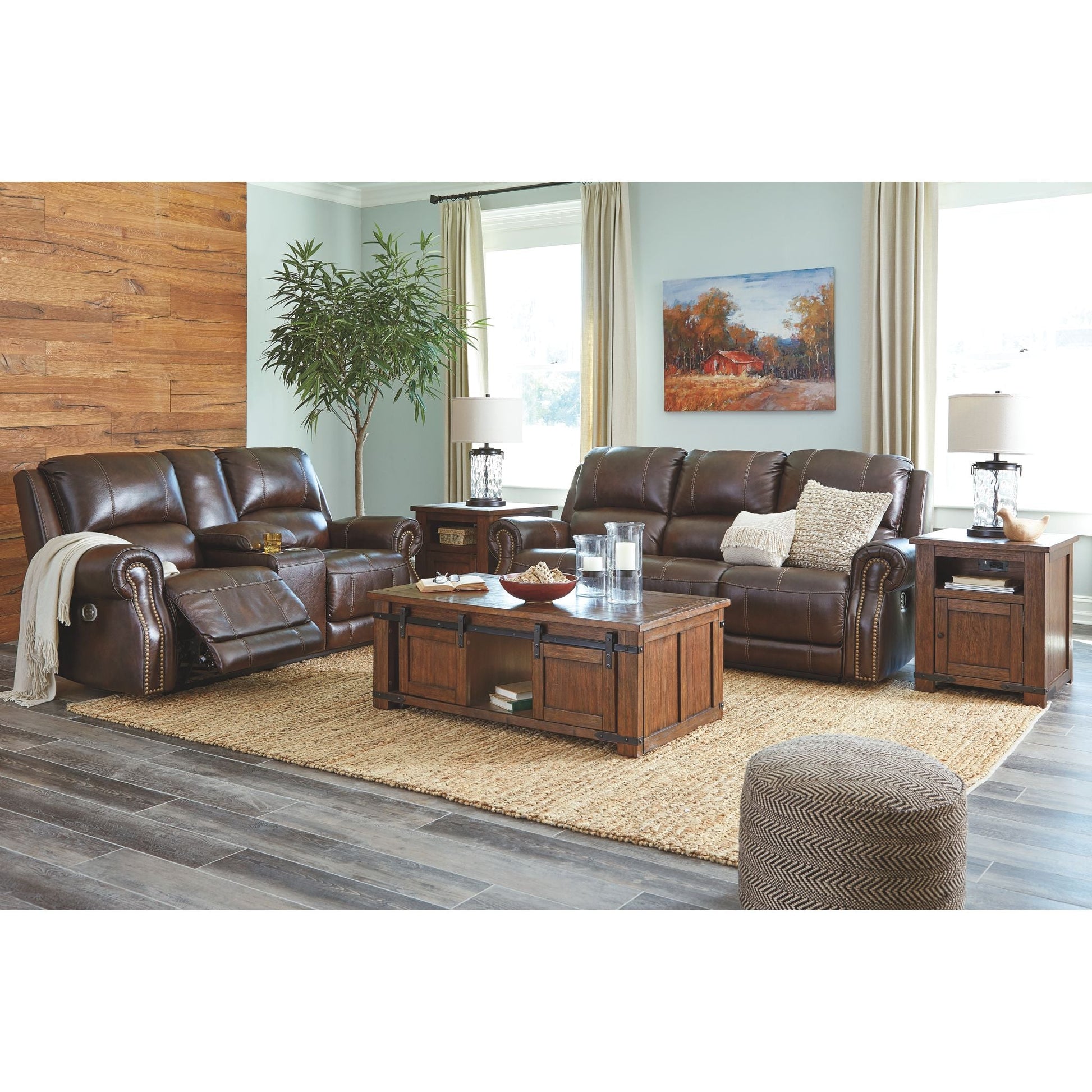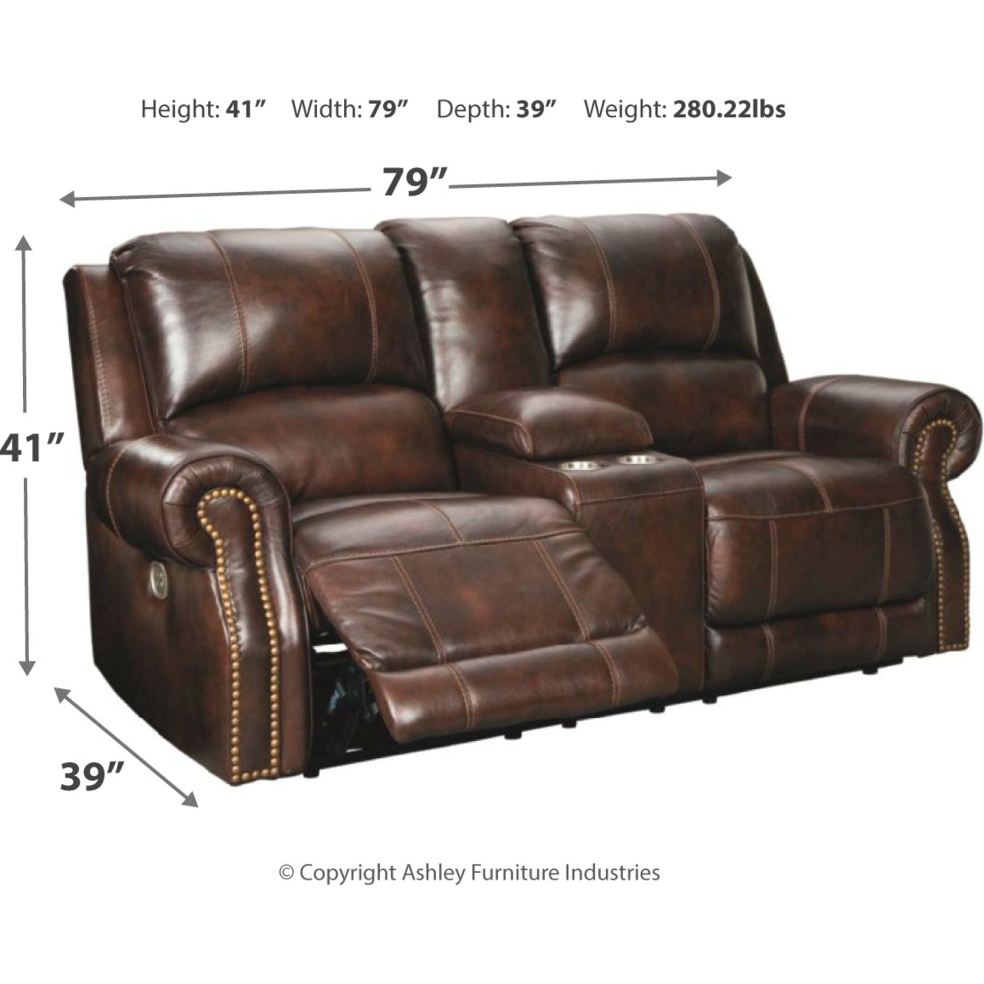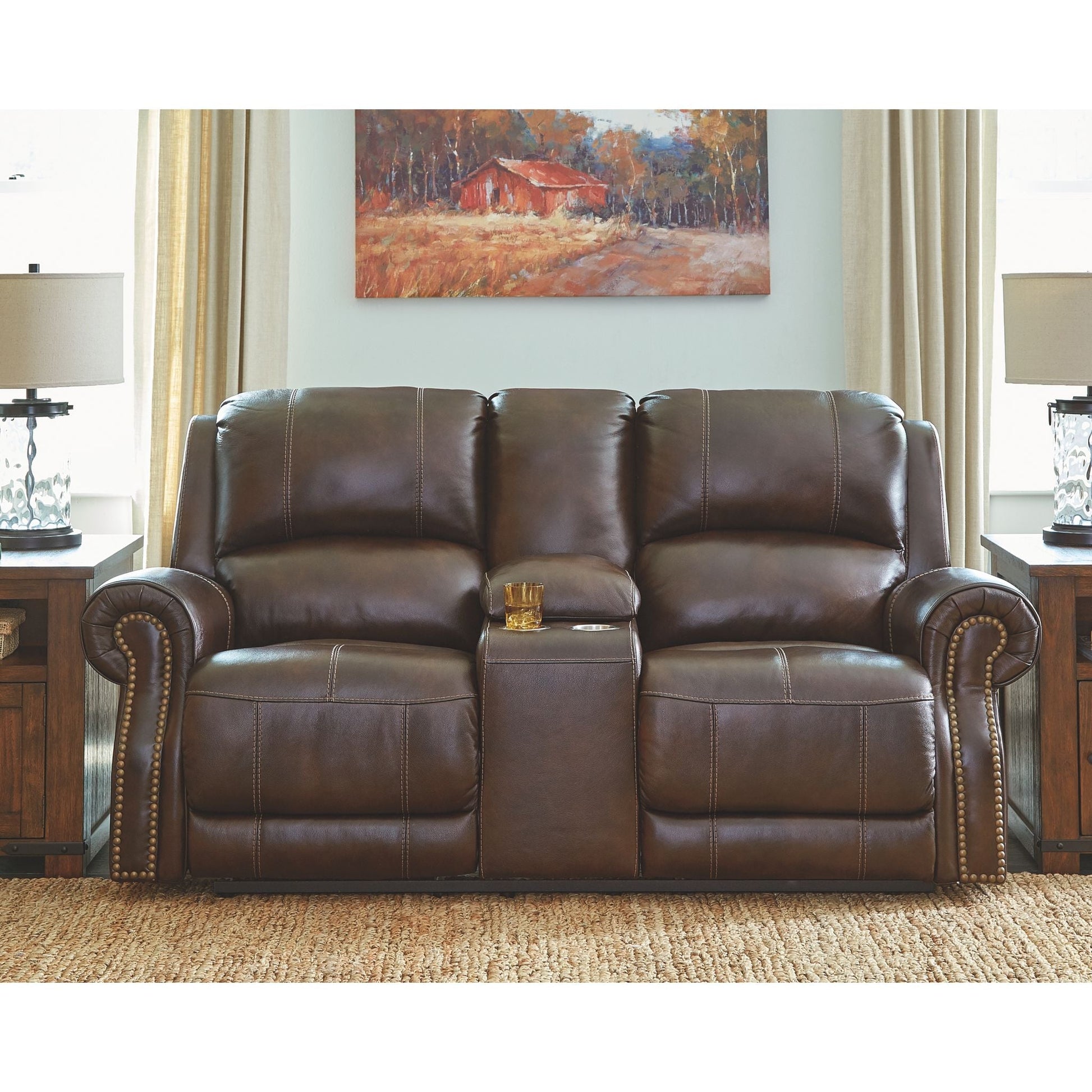 Recline in the modern luxury and convenience of this power reclining loveseat with Easy View™ power adjustable headrest. With the touch of a button, you can easily position the recliner and its headrest for maximum comfort. Plus, with the convenient USB charging ports, electronics can be charged without having to get up. The genuine leather upholstery is paired with expertly matched faux leather for affordability. The center console tops off convenience with hidden storage under center armrest—perfect for tucking away remotes. You'll love keeping a drink at your side with the handy stainless steel cup holder.