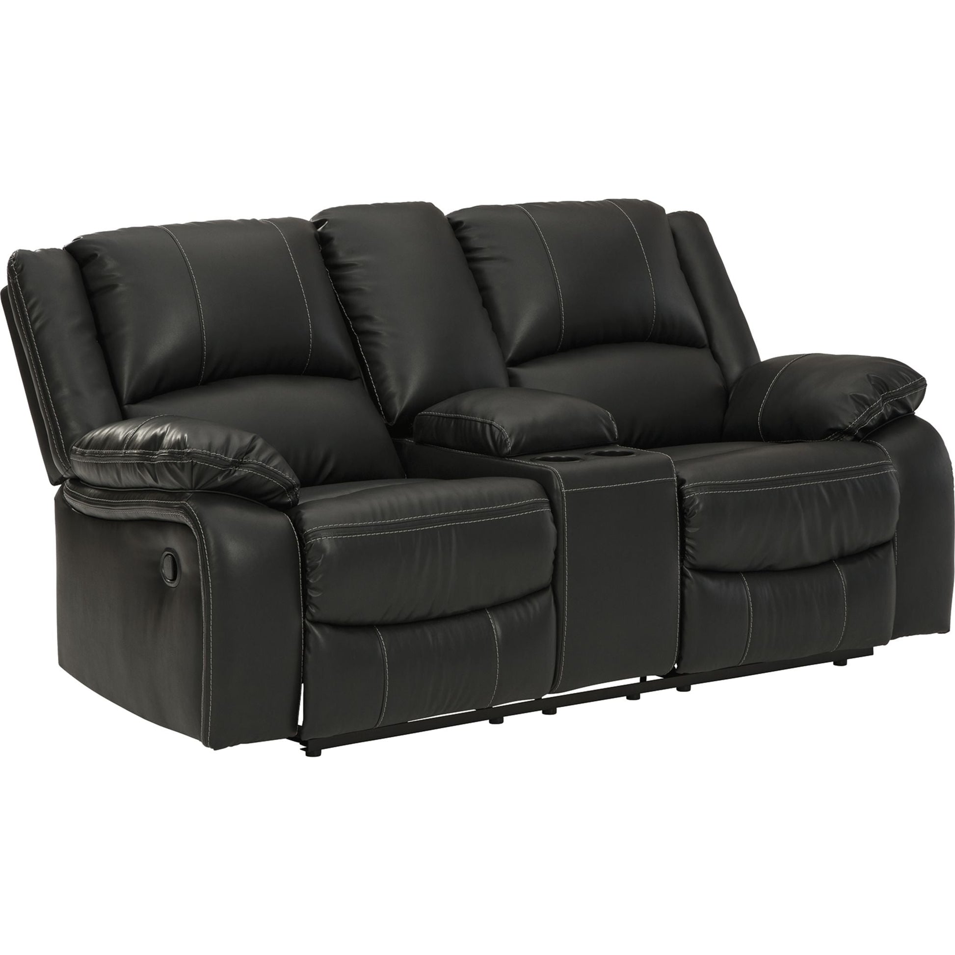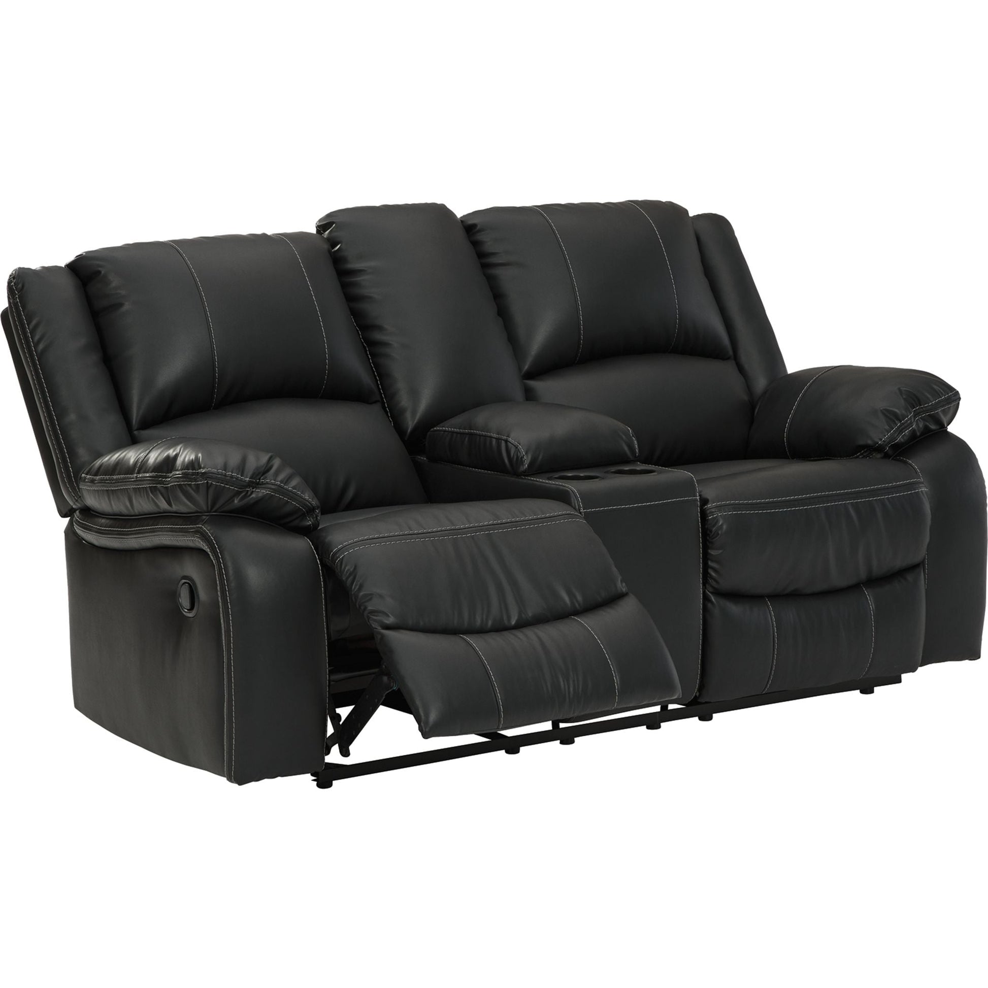 Sleek and streamlined, this reclining loveseat with center console draws out your leisure time with its bustle back construction and thickly cushioned armrests. The super soft faux leather gets a high-end tweak with jumbo contrast stitching so you don’t have to sacrifice style for comfort. Sink into the comfortably supportive cushions and stretch your evening as long as you can with the added convenience of a center console at your fingertips.