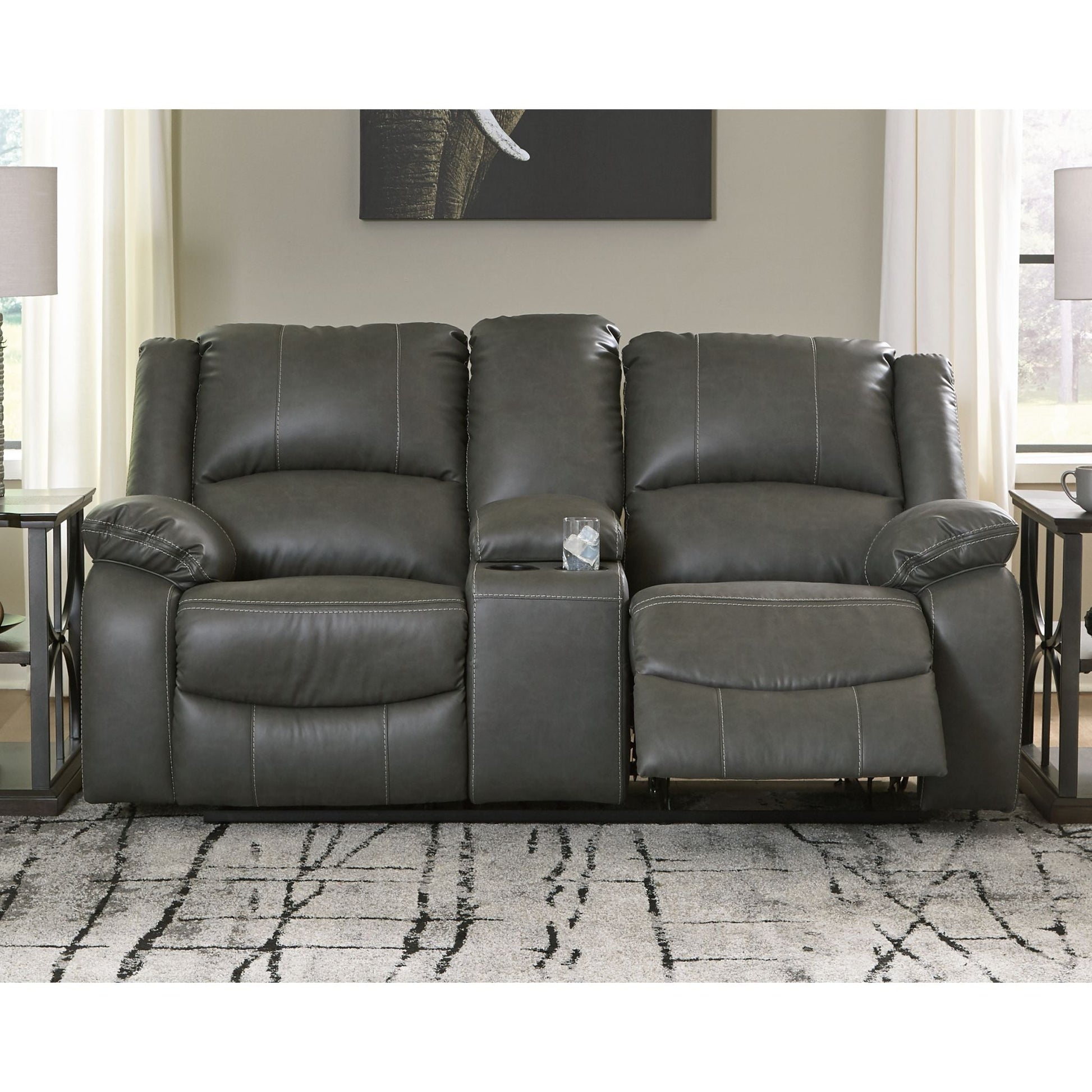 Sleek and streamlined, this reclining loveseat with center console draws out your leisure time with its bustle back construction and thickly cushioned armrests. The super soft faux leather gets a high-end tweak with jumbo contrast stitching so you don’t have to sacrifice style for comfort. Sink into the comfortably supportive cushions and stretch your evening as long as you can with the added convenience of a center console at your fingertips.
