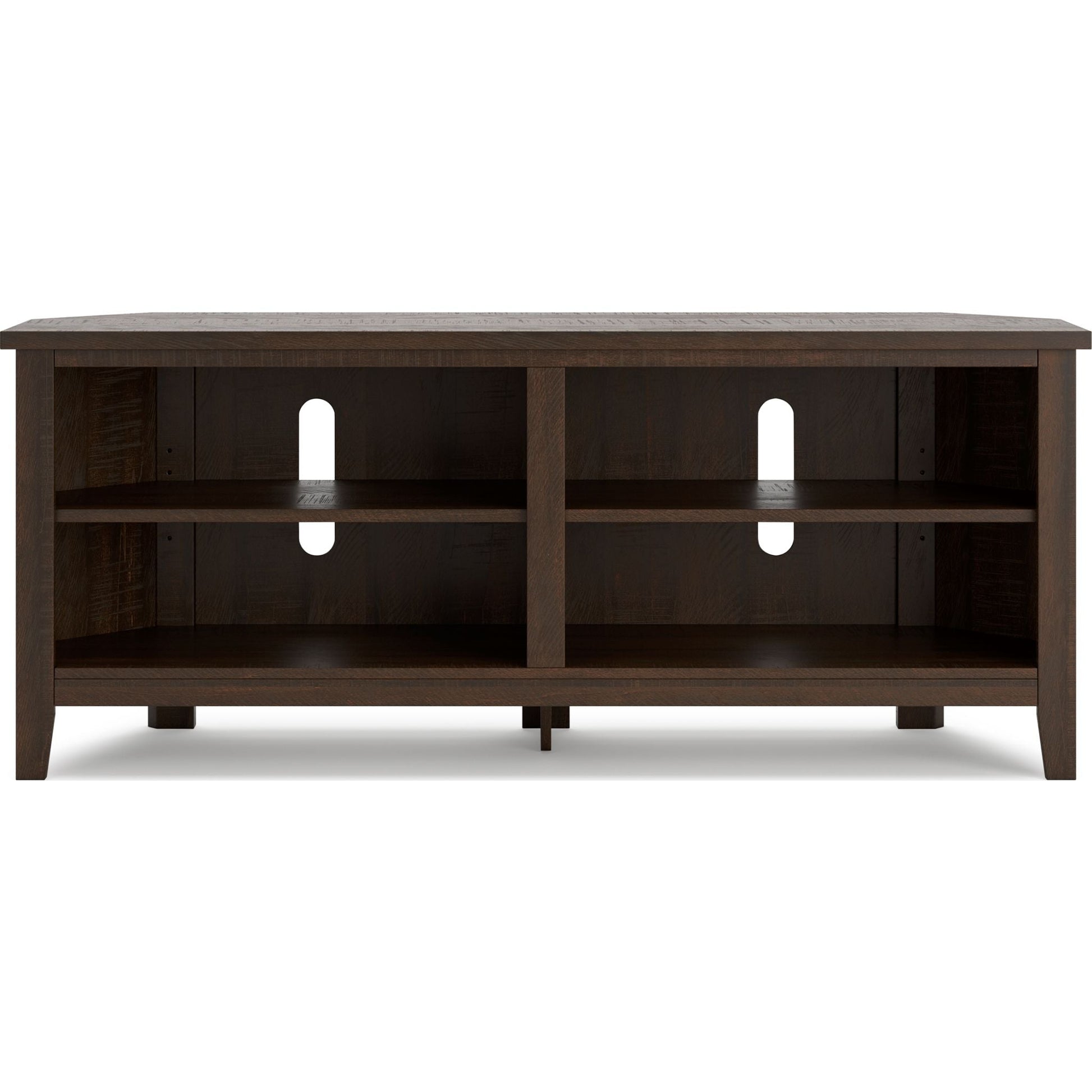 With its replicated burnt umber rustic wood grain and minimalist charm, this corner TV stand is right in tune with your relaxed approach to high style. Beautifully shaped to nestle into any corner, it’s well equipped with a flexible open-concept design and cutouts for wire management that enhance the clean-lined aesthetic. The look is ideal for modern farmhouse and contemporary settings.