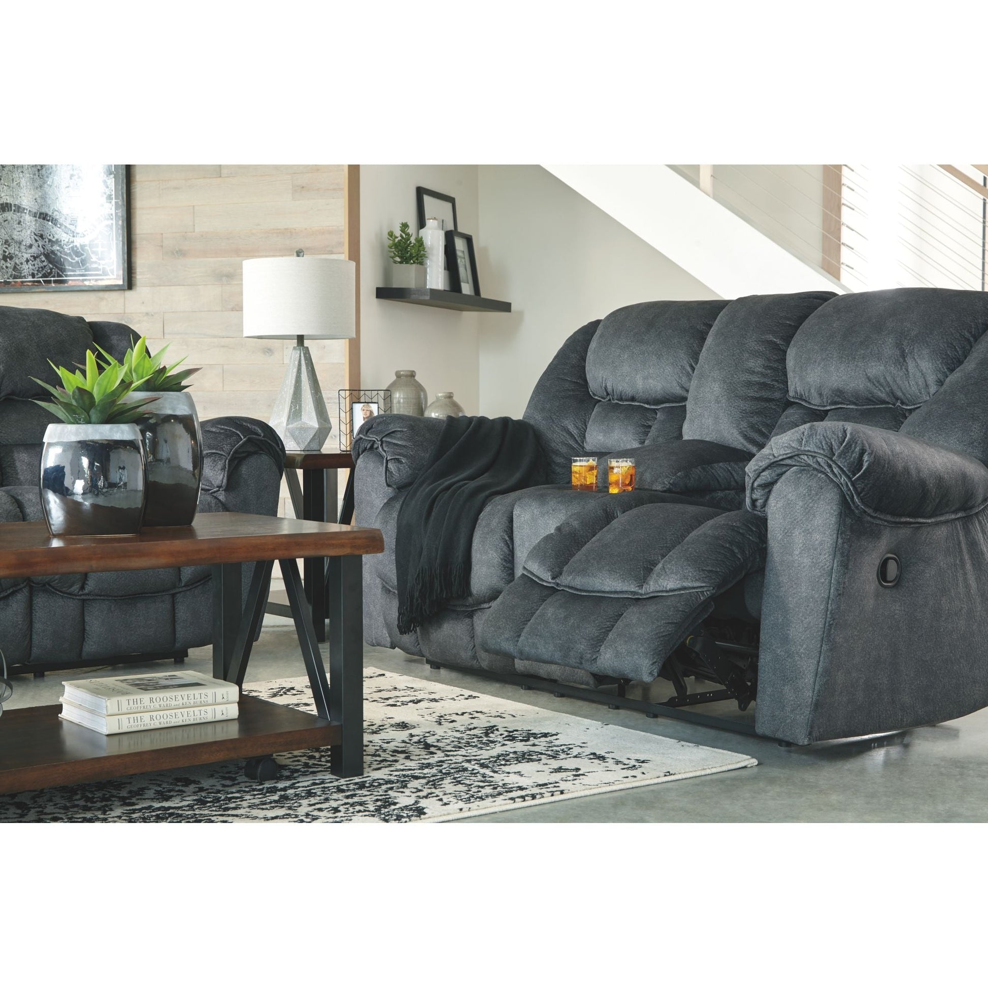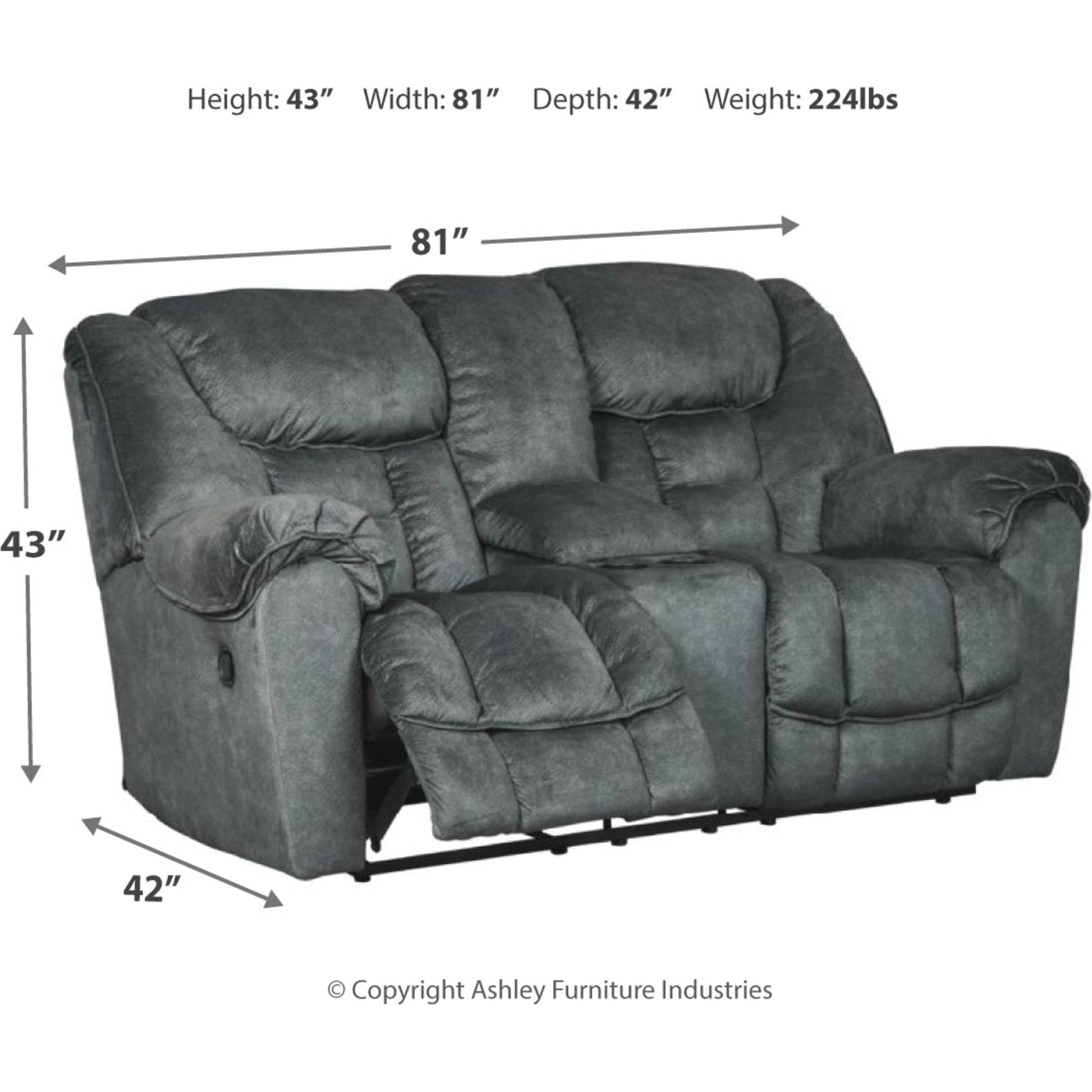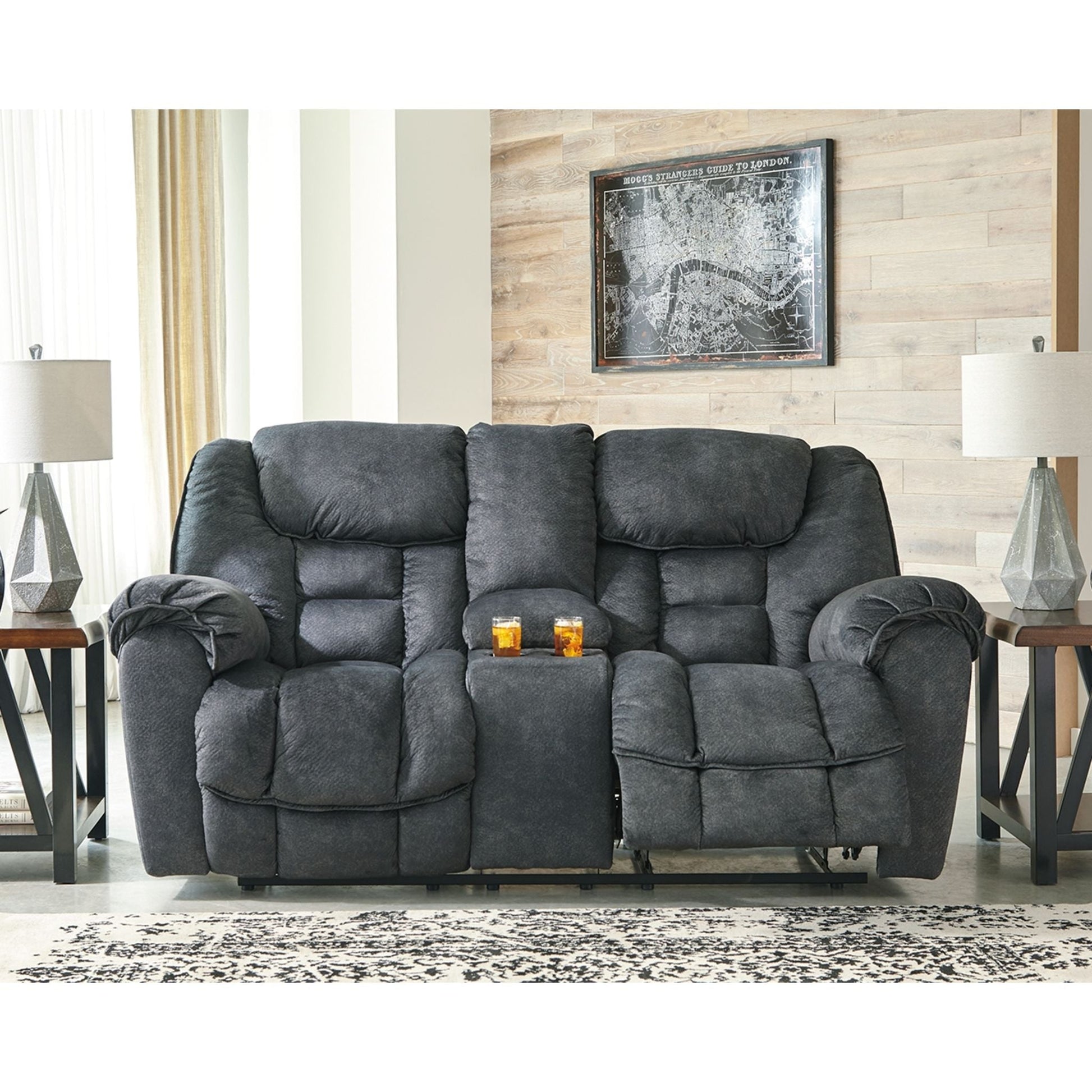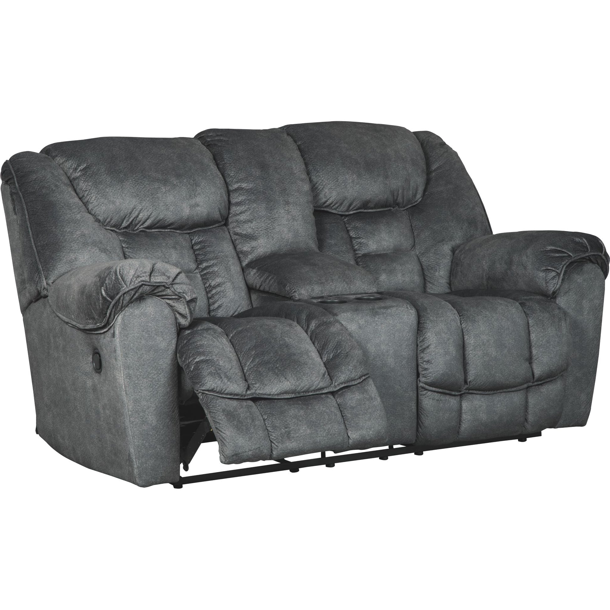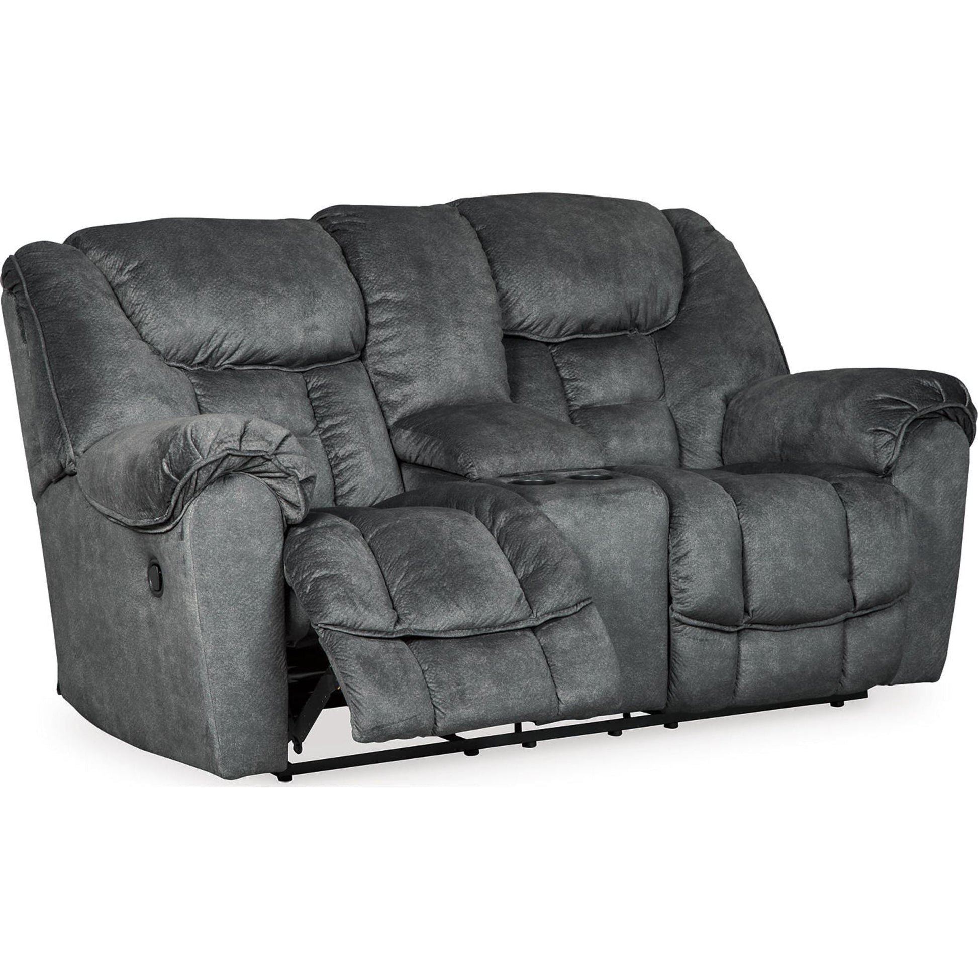 Sometimes seeing is believing. Rest assured this reclining loveseat with console is every bit as indulgent as it looks. Designed to put you in the lap of luxury, this generously scaled reclining sofa—wrapped in a wonderfully plush and practical granite gray upholstery—sports scooped pillow wrapped armrests and curvaceously cushioned head-neck support for feel-good flair.