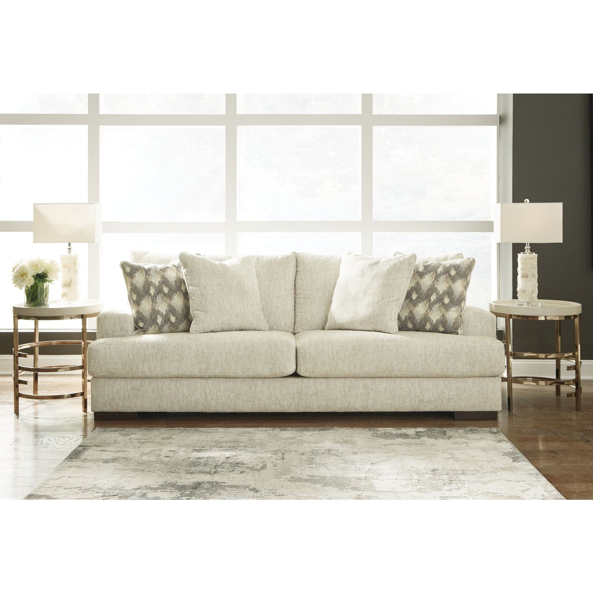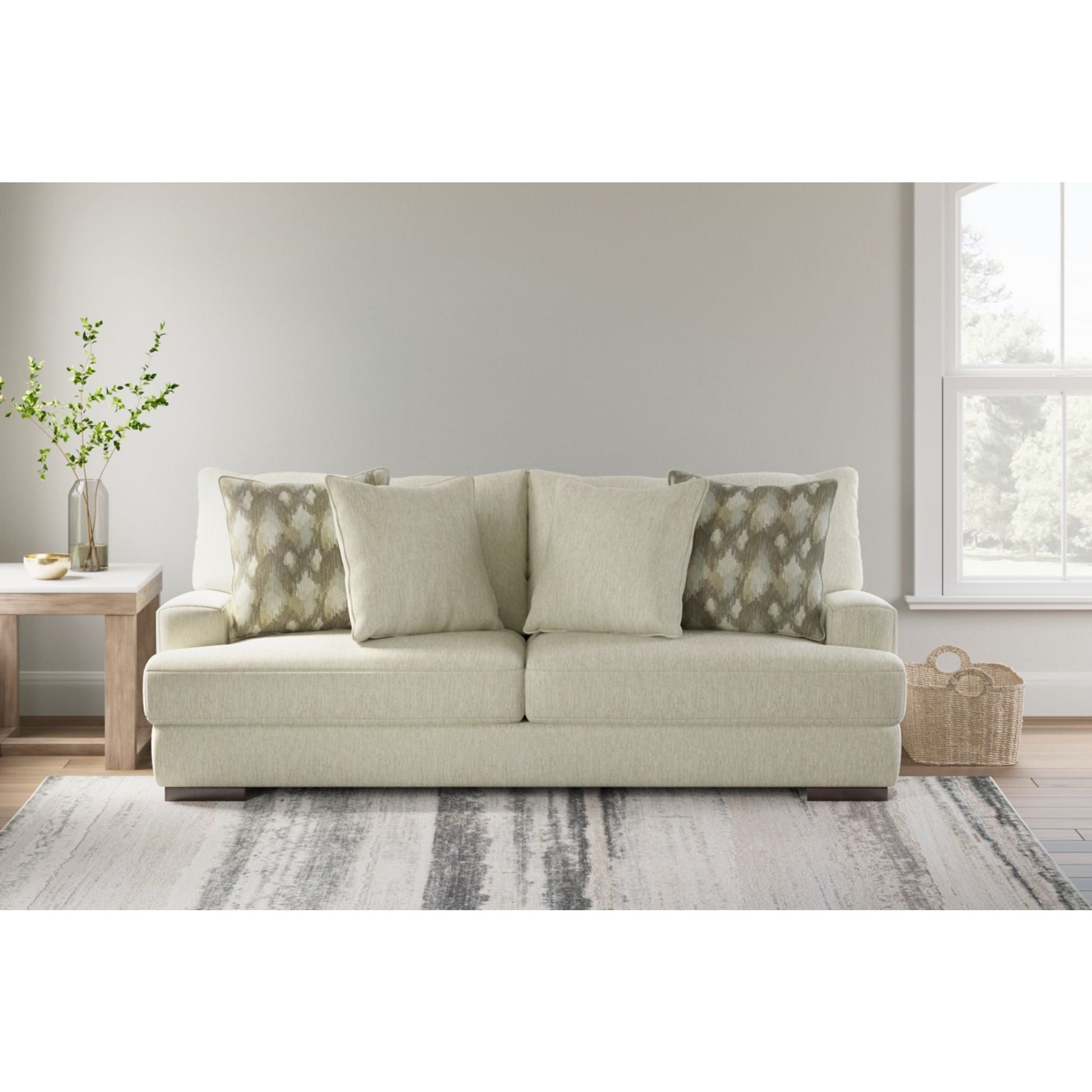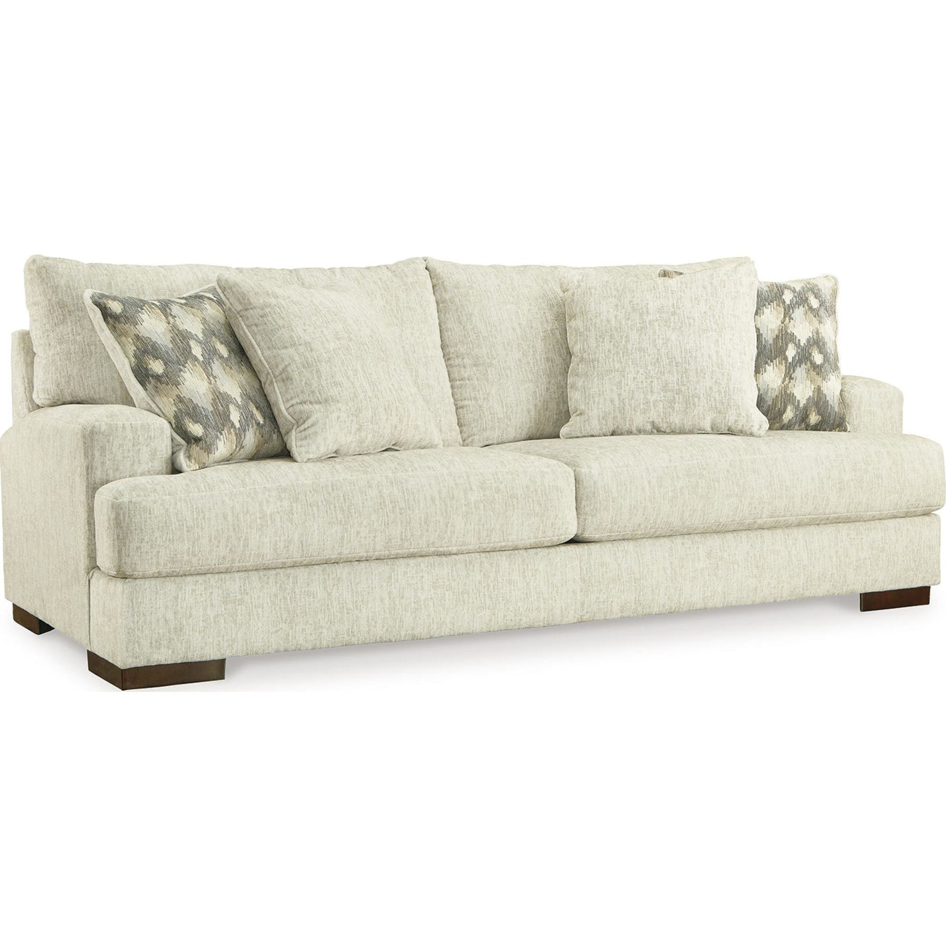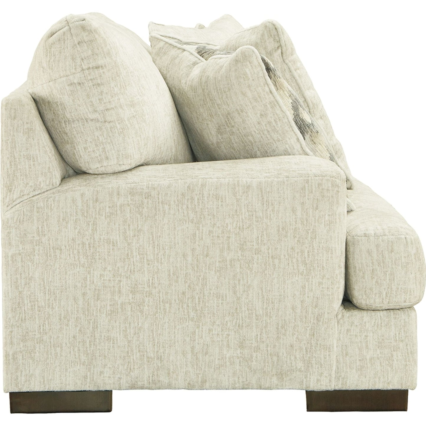 Easy on the eyes and irresistibly comfortable, this sofa is covered in luxurious chenille microfiber in a light, neutral hue that blends beautifully in a room. Wide track arms have a contemporary look and plush cushions cradle you comfortably. Textured accent pillows in complementary colors add subtle contrast.