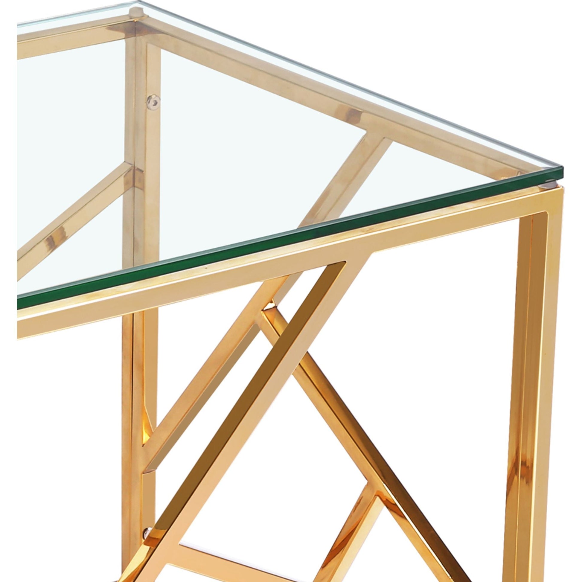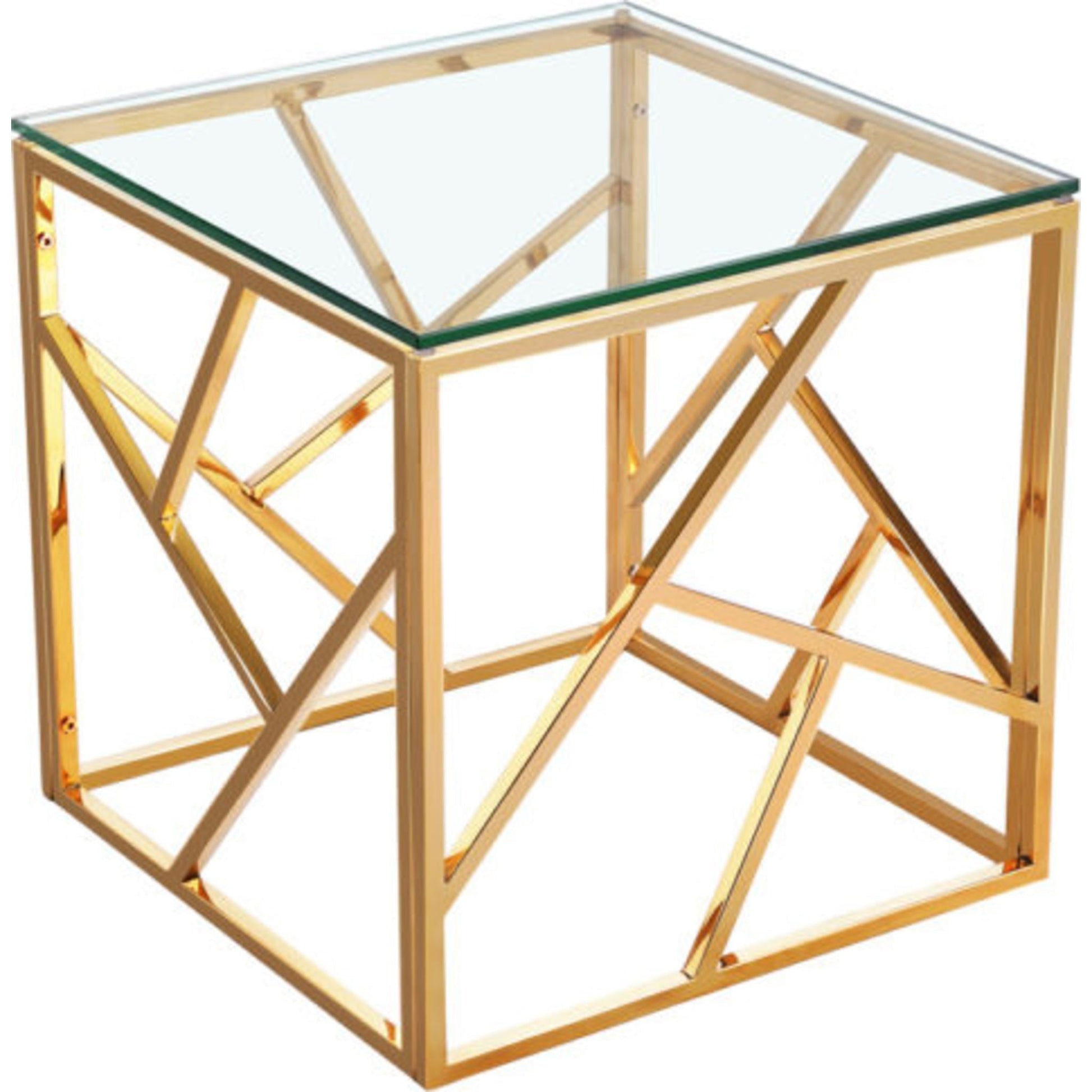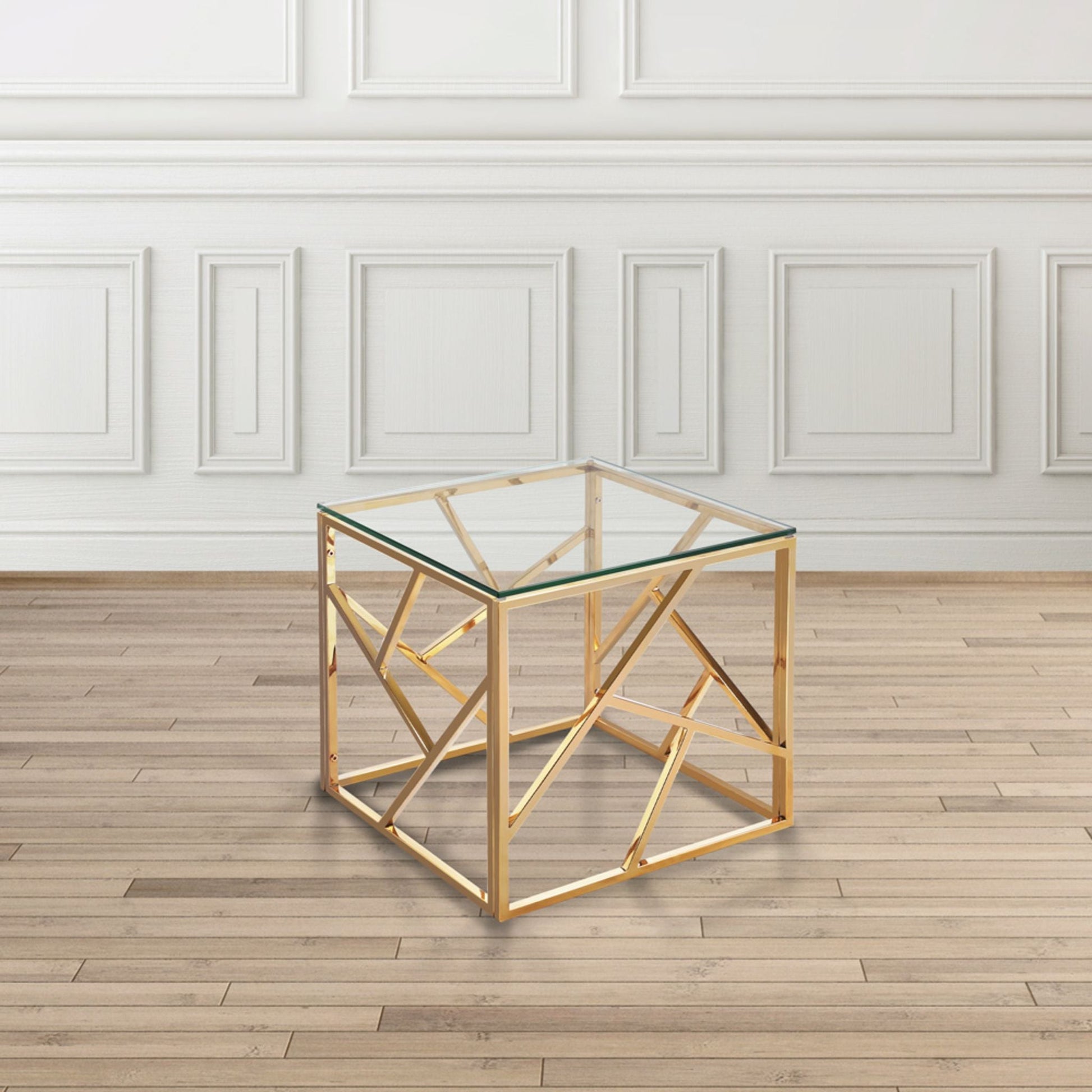 Accent Your Space With the Carole End Table Featuring an open geometric pattern, the Carole end table has a sleek and stylish finish. Rectangular-shaped tempered glass sits atop a gold-hued metal base, blending two materials into one fashionable unit. The interplay of glass and metal gives this Carole gold end table a contemporary look. It's ideal to round off your living room decor or anchoring any seating space in the TV or entertainment room. Pair this rectangular end table with plush furniture in neutral or dark colors and a soft rug. Blend in accessories with a hint of metal and sparkle, such as a wall painting with gold leaf accents, for a glam, modern-style space that's filled with texture and charm. Tempered glass is sturdy and safe to use. Simply clean it with a soft damp cloth and then wipe dry for a spotless surface. The Carole end table features a gold metal base The metal base has a geometric pattern Tempered glass tabletop accentuates the sleek design