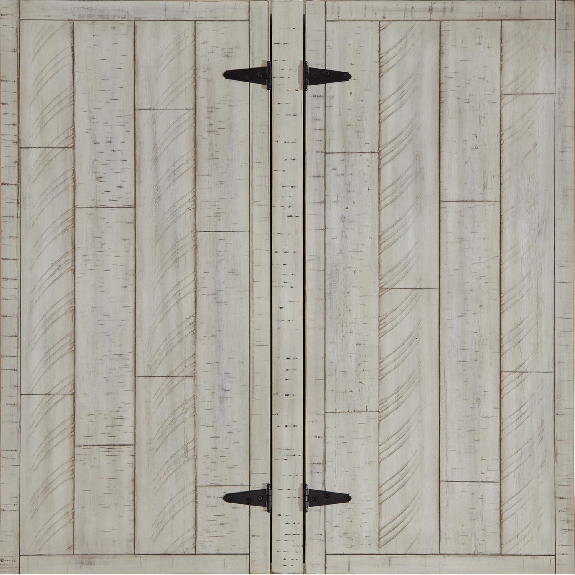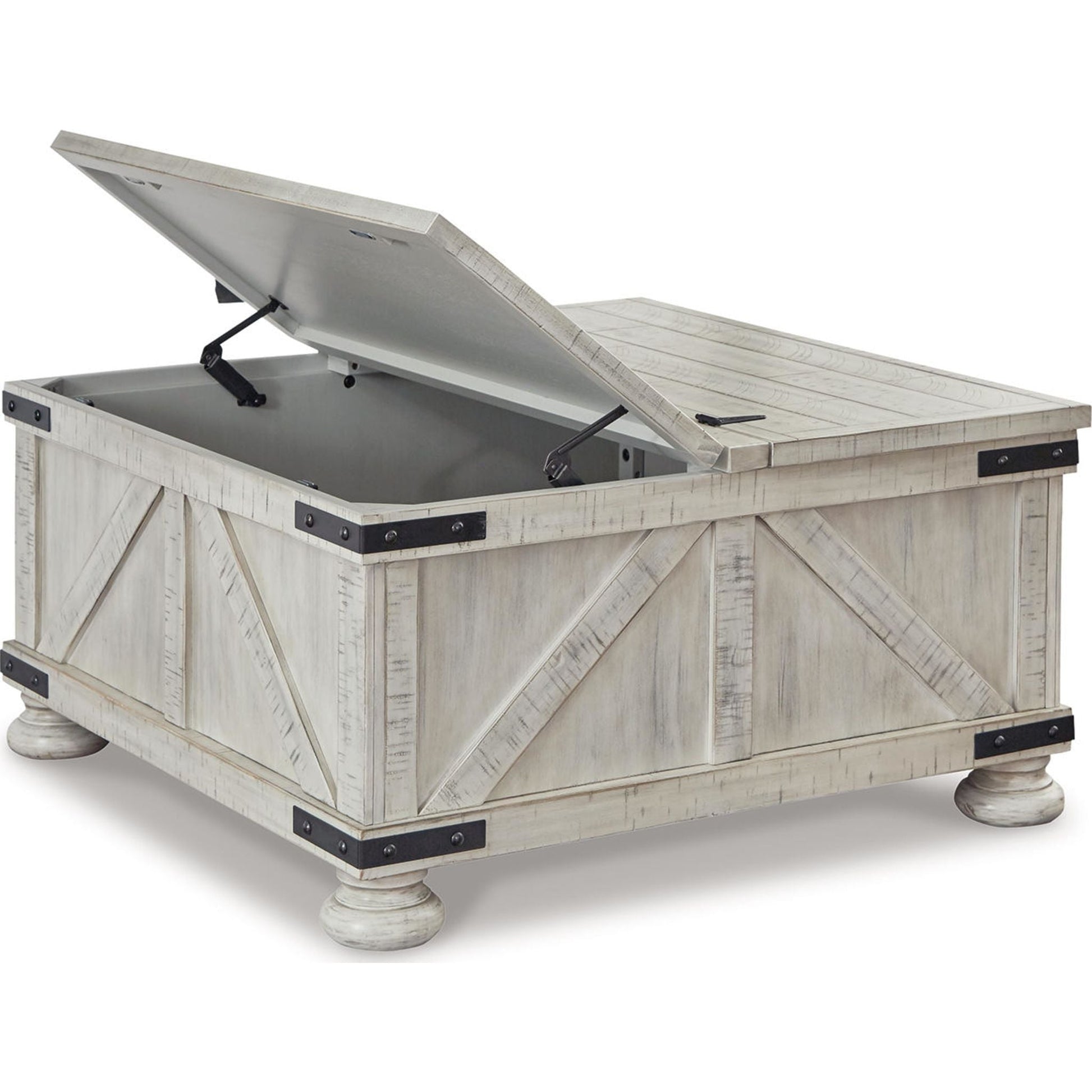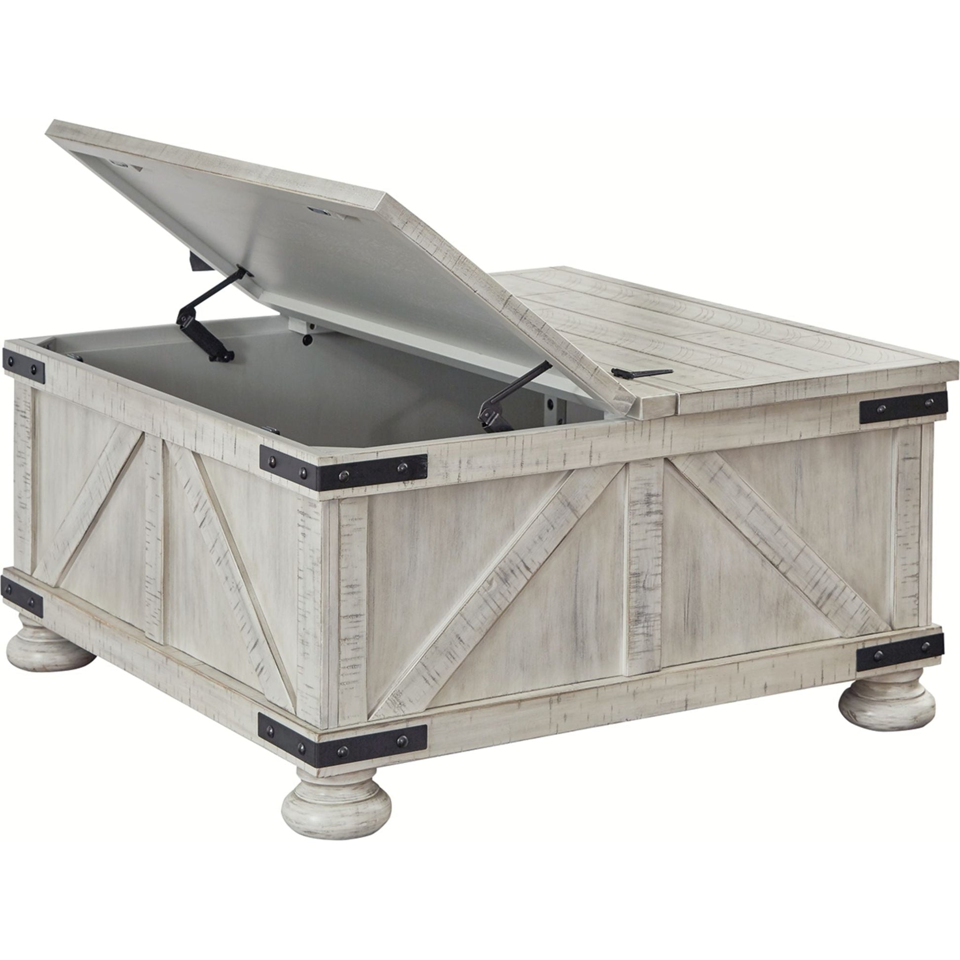 Double up on form and function with this square coffee table with storage. Its dual-lid tabletop provides easy access to the roomy storage space. Crafted with a distressed whitewash finish, crossbuck detailing and metal bracket appliques, this generously scaled coffee table is rustic farmhouse living at its best.