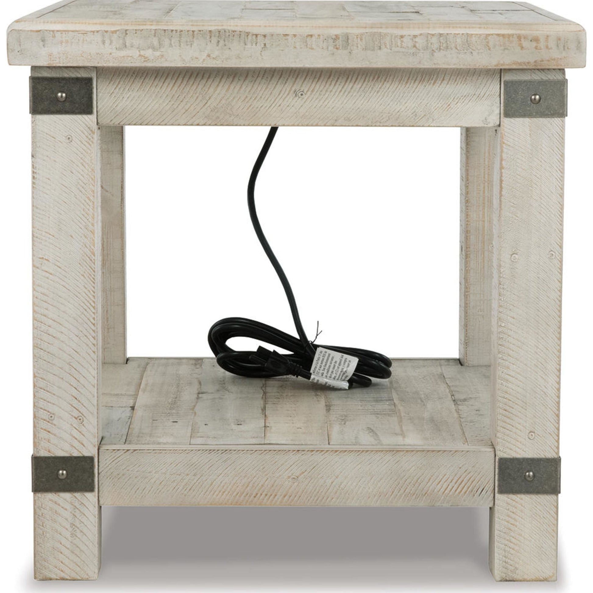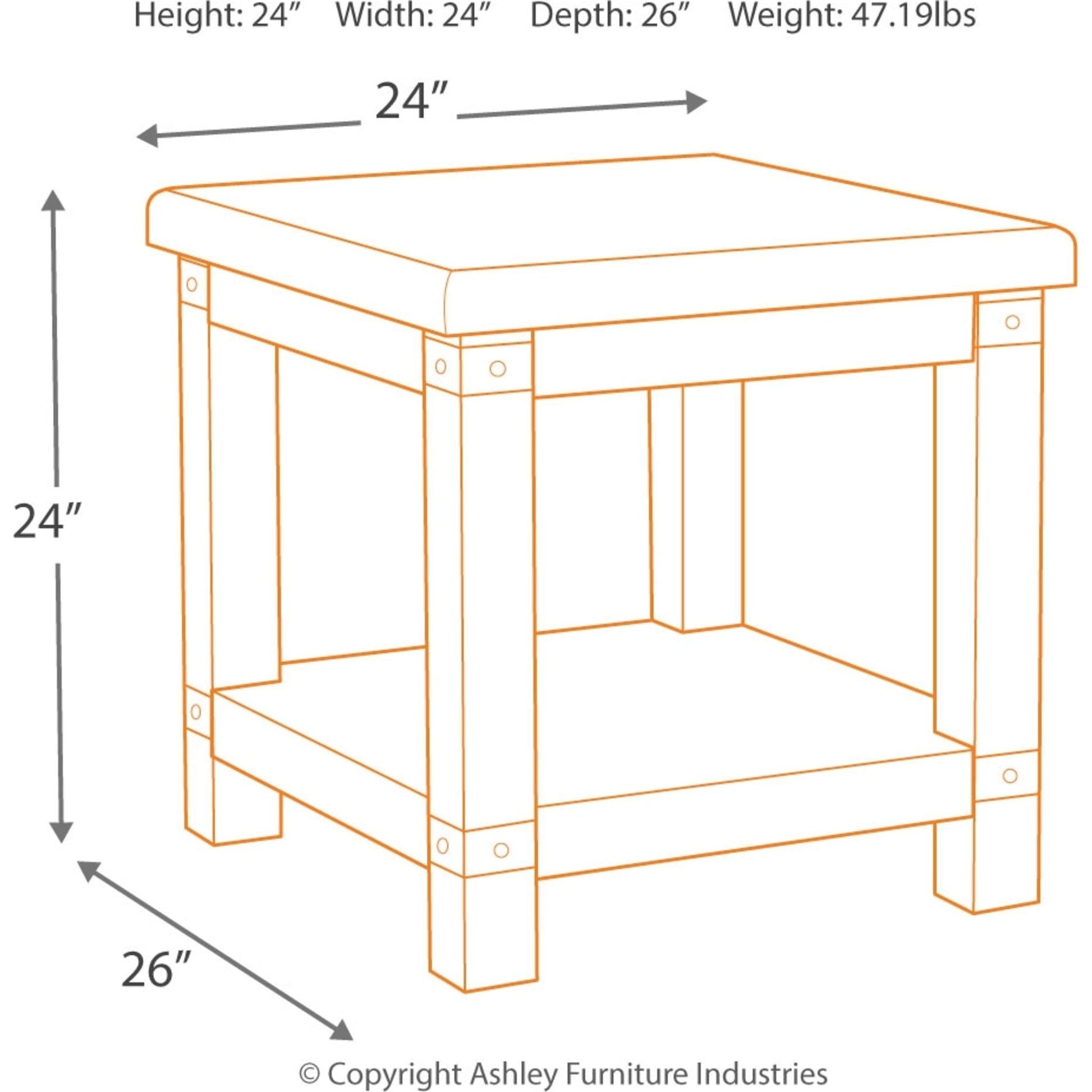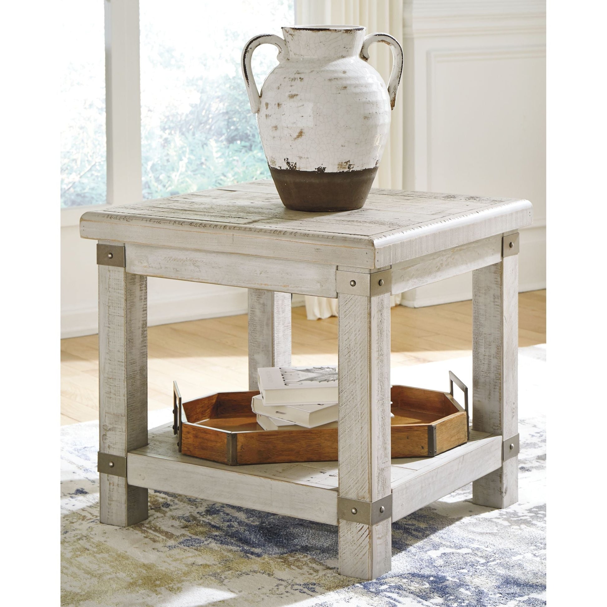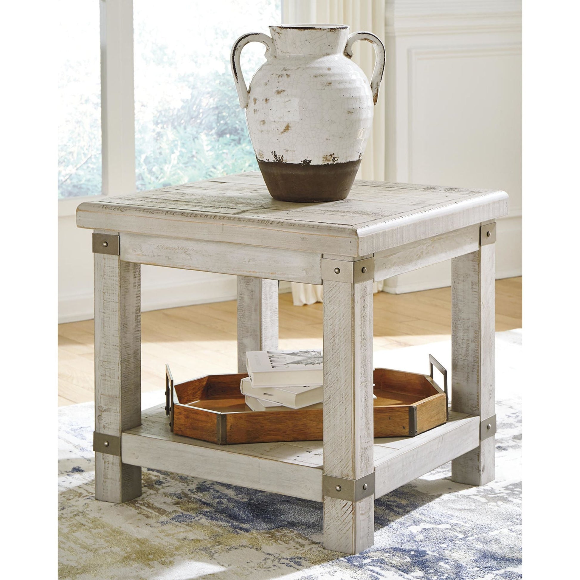 Add a quaint touch of farmhouse style to your living area with this end table. Its beautifully distressed light gray finish enhances the reclaimed wood's natural grain, which delivers a naturally aged feel straight from the countryside. You'll love its generous scale, offering a roomy table top and base shelf that are ideal for displaying accents and more. Large legs, metal accents and the planked effect dress up its country charm.