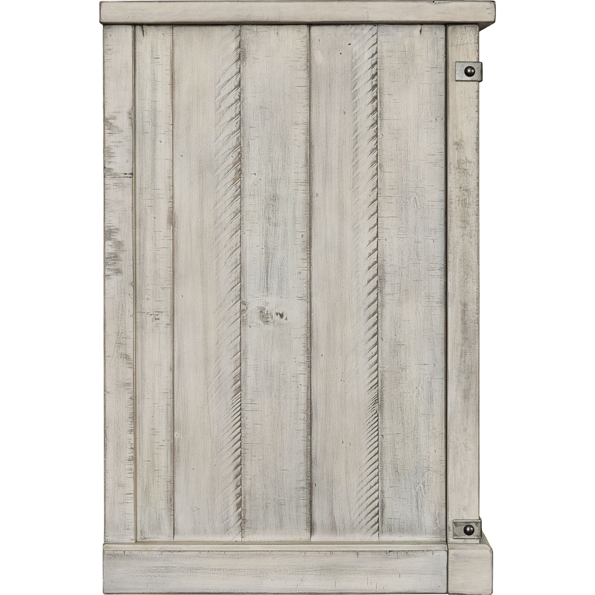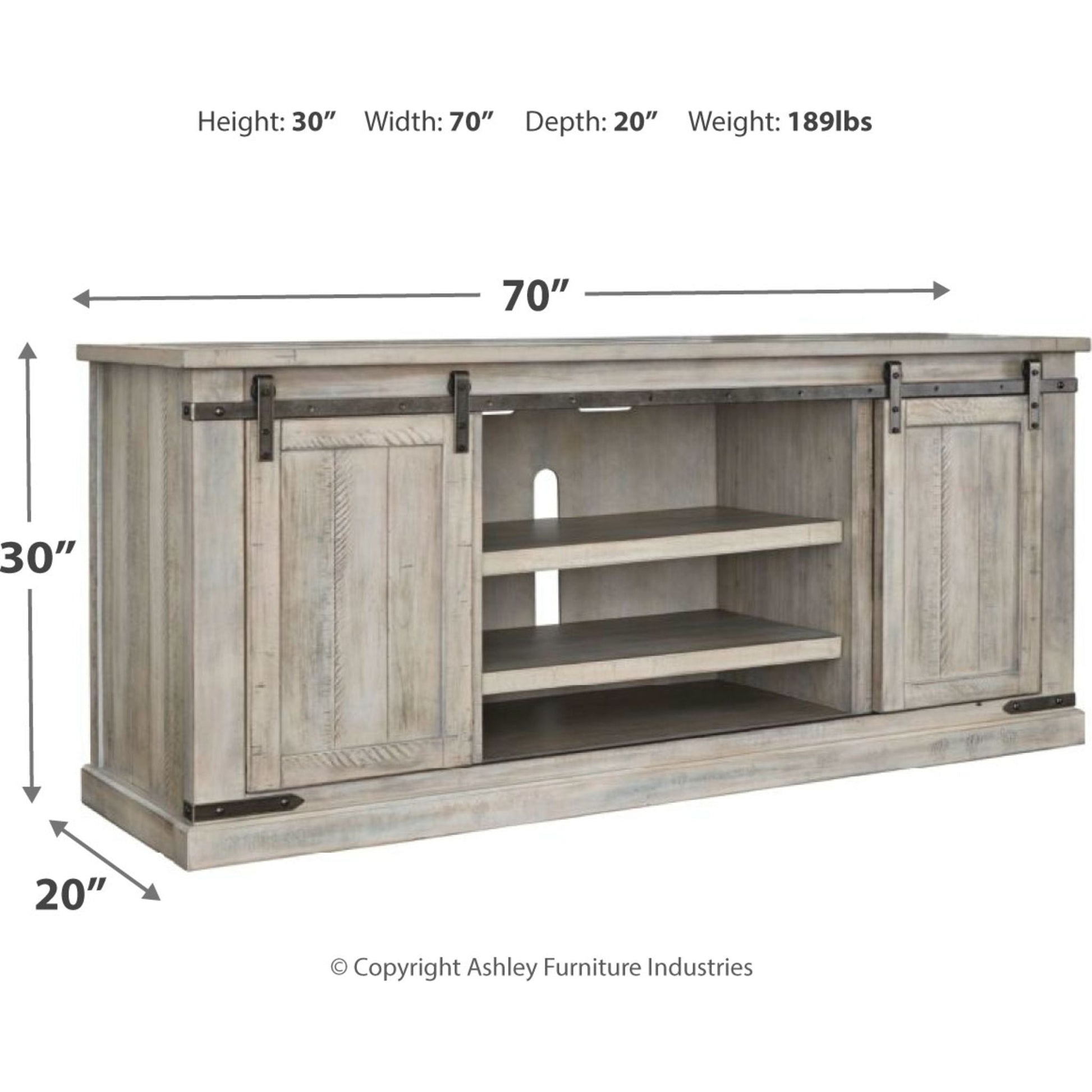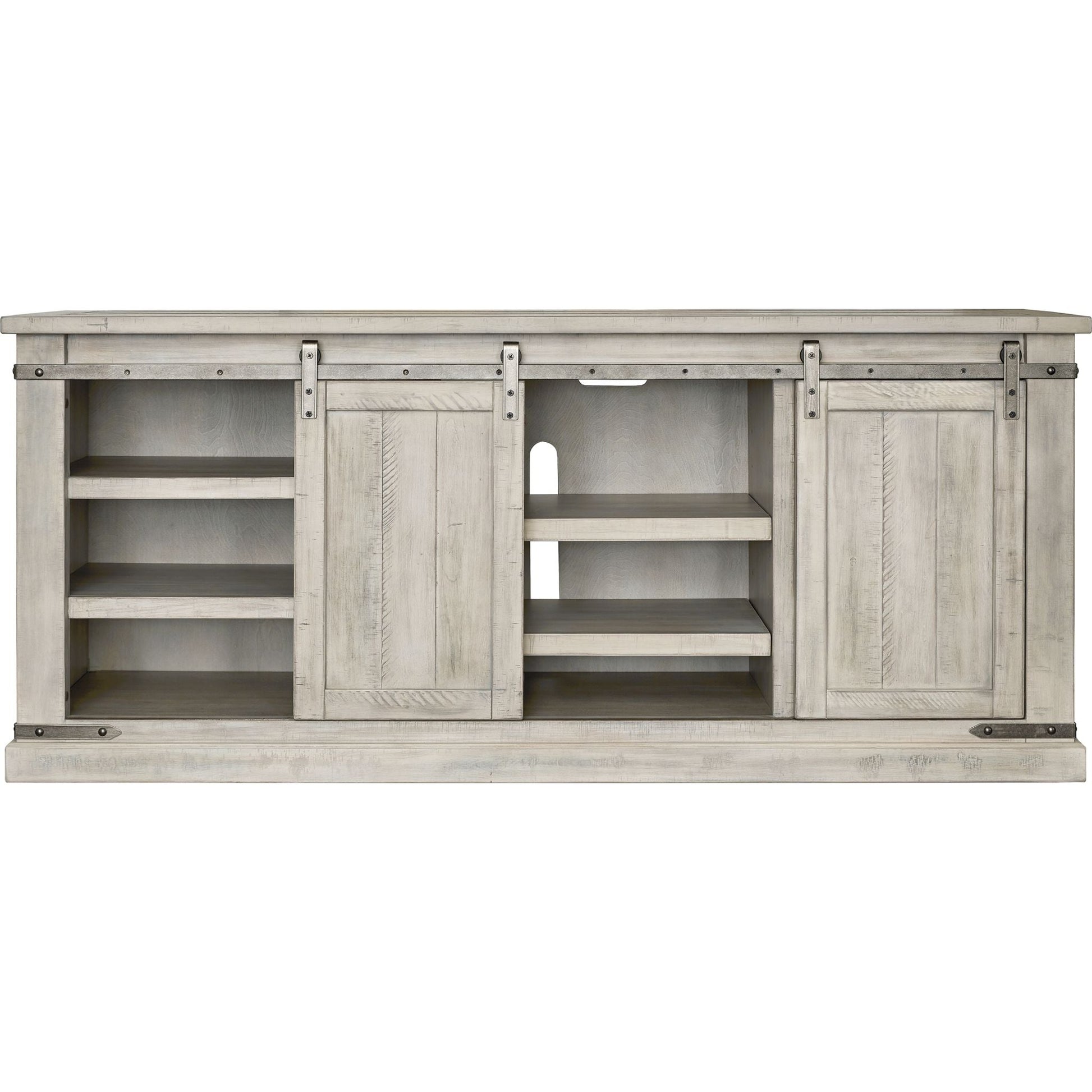 A brilliant rendition of modern farmhouse style (sliding barn doors and all), this TV stand is right in tune with your richly relaxed sense of style. The TV stand’s clean yet hearty profile is enhanced with a complex whitewash finish with charming distressing and plank-effect styling. Antiqued gray metal hardware is a sophisticated complement.