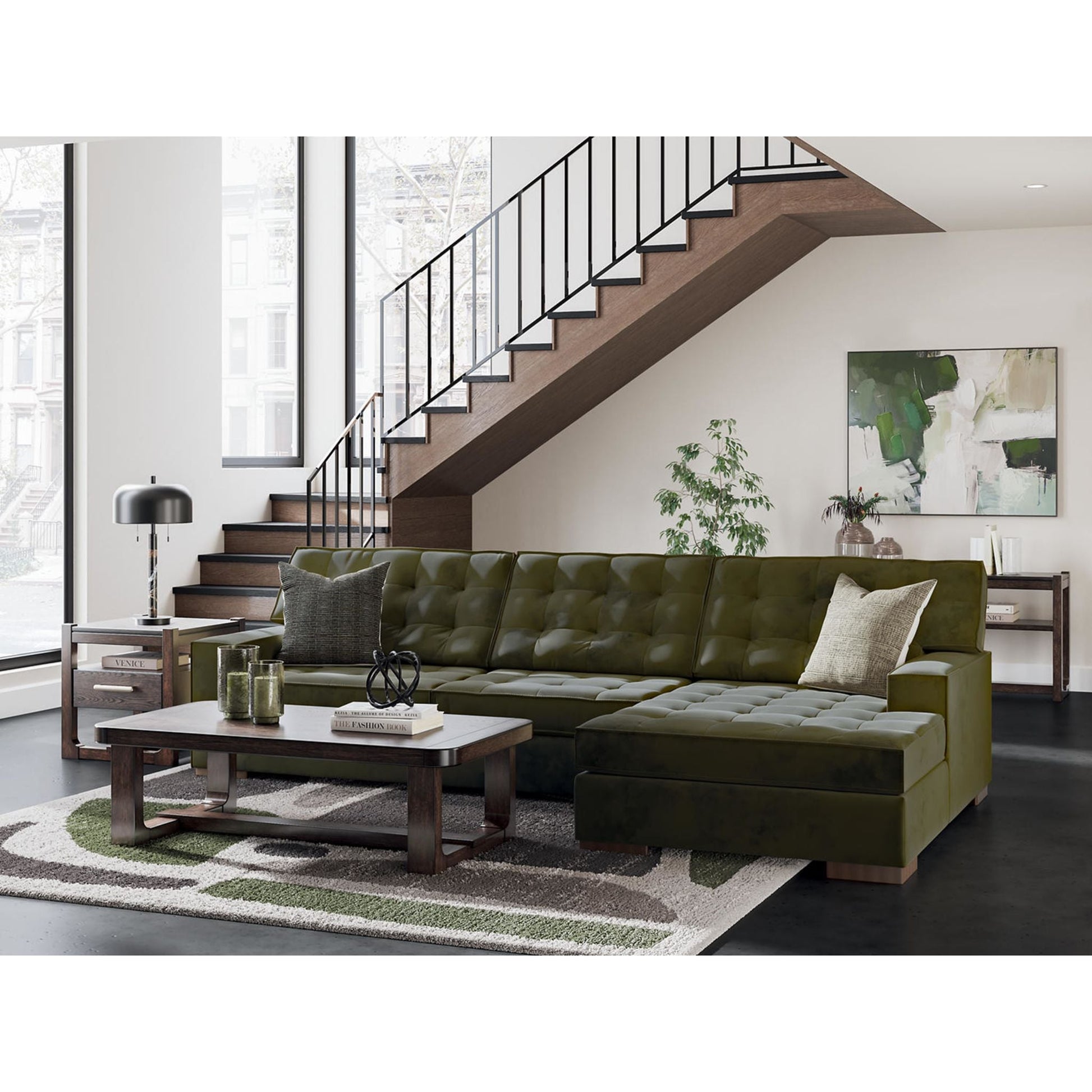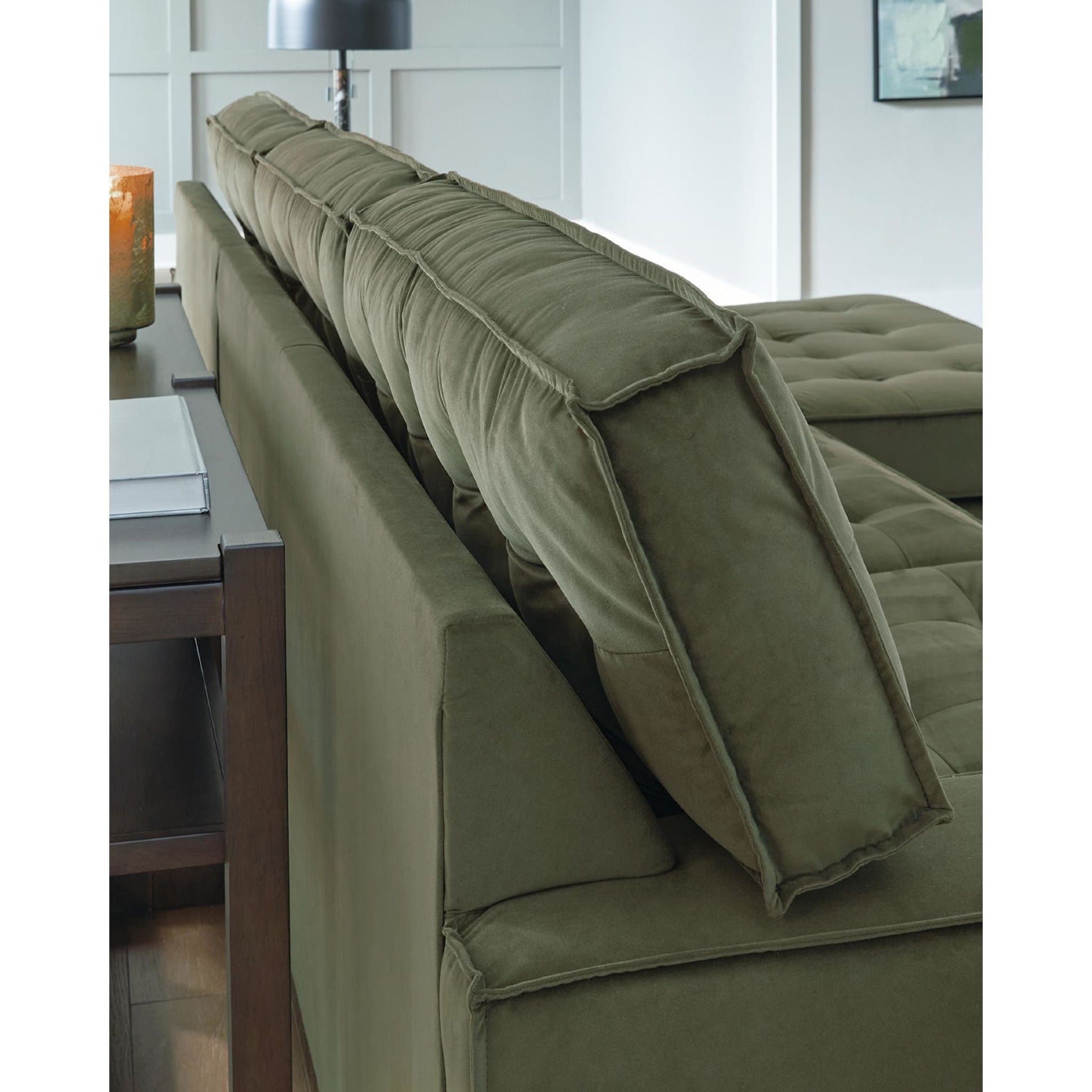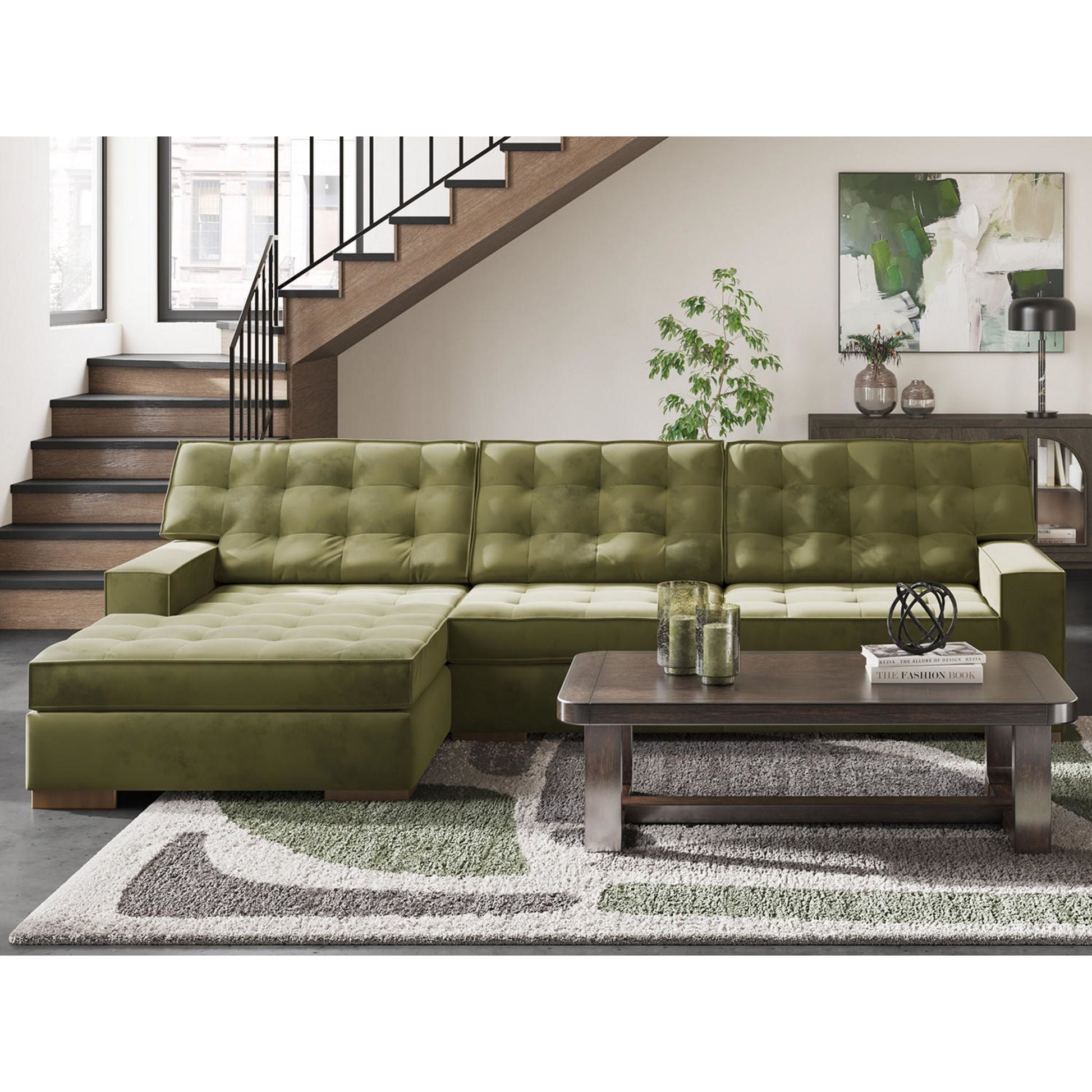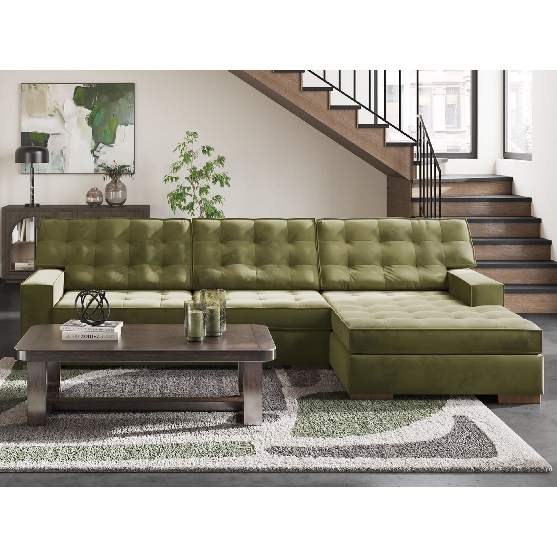 This sleek sectional with chaise offers a highly contemporary look with plenty of space to spread out. Dramatic tufted detailing and luxurious upholstery in a rich olive color create a sophisticated atmosphere. This sectional is perfect for those who love to entertain, or simply relax, in uptown style and comfort.