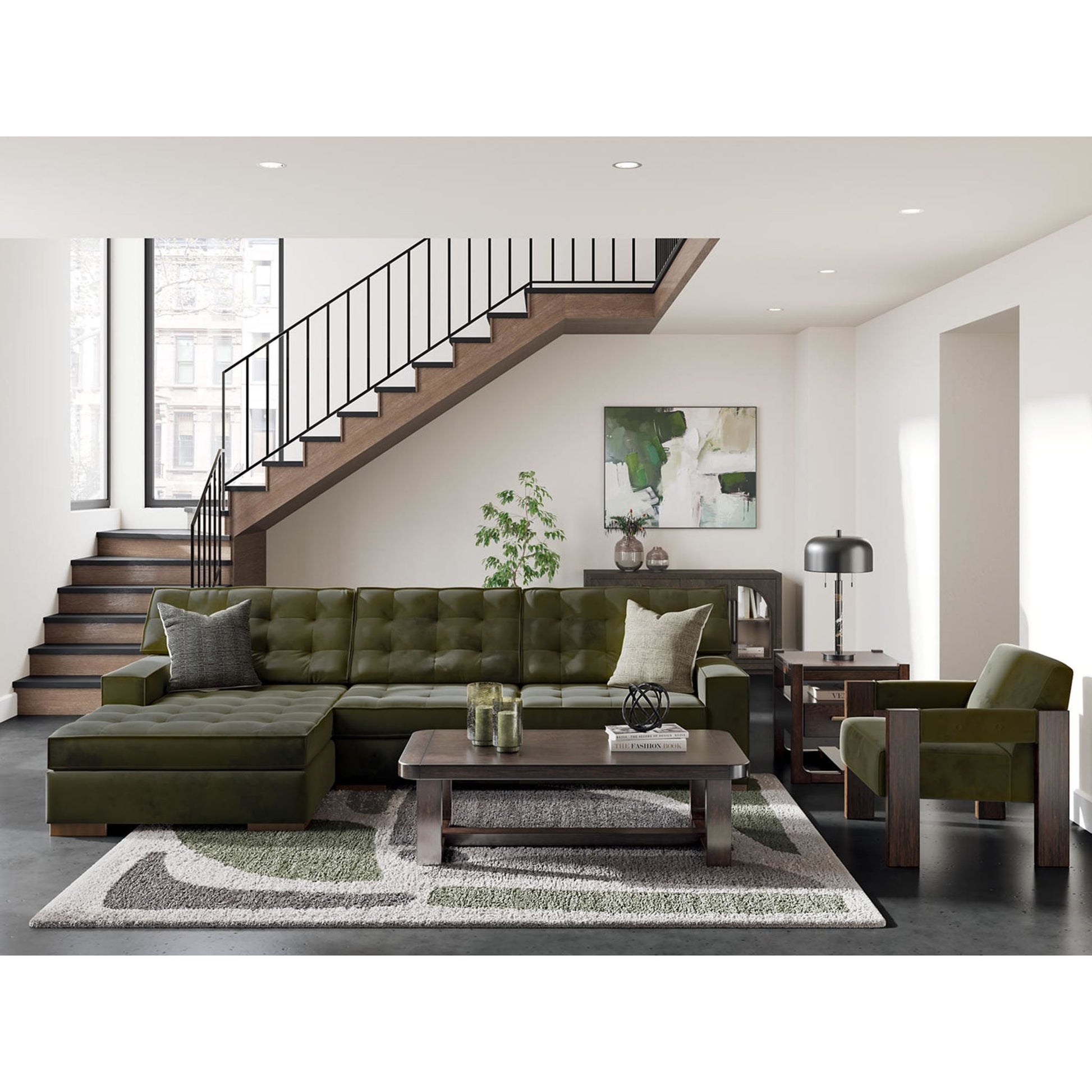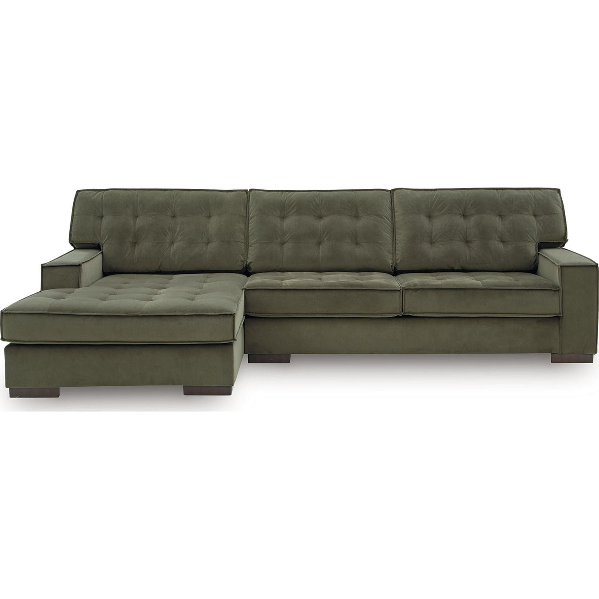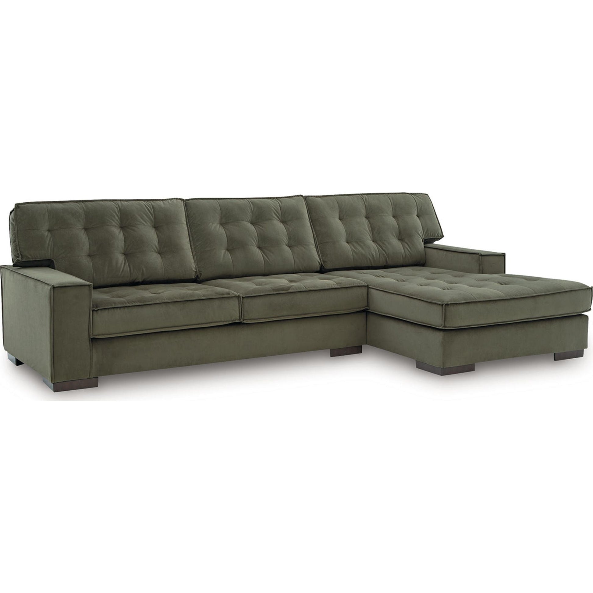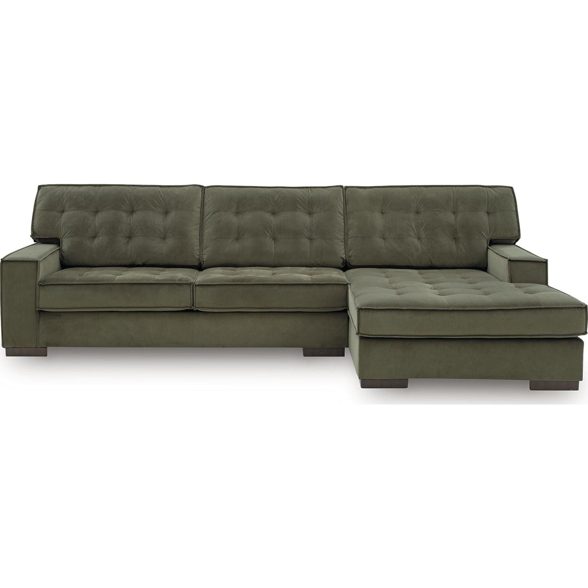 This sleek sectional with chaise offers a highly contemporary look with plenty of space to spread out. Dramatic tufted detailing and luxurious upholstery in a rich olive color create a sophisticated atmosphere. This sectional is perfect for those who love to entertain, or simply relax, in uptown style and comfort.