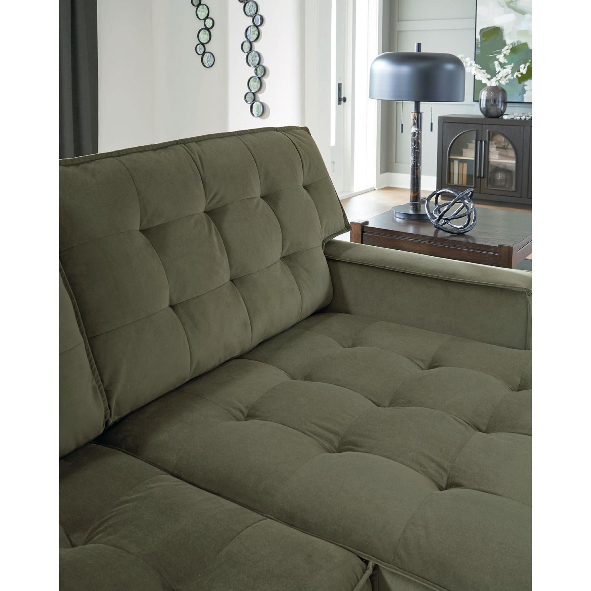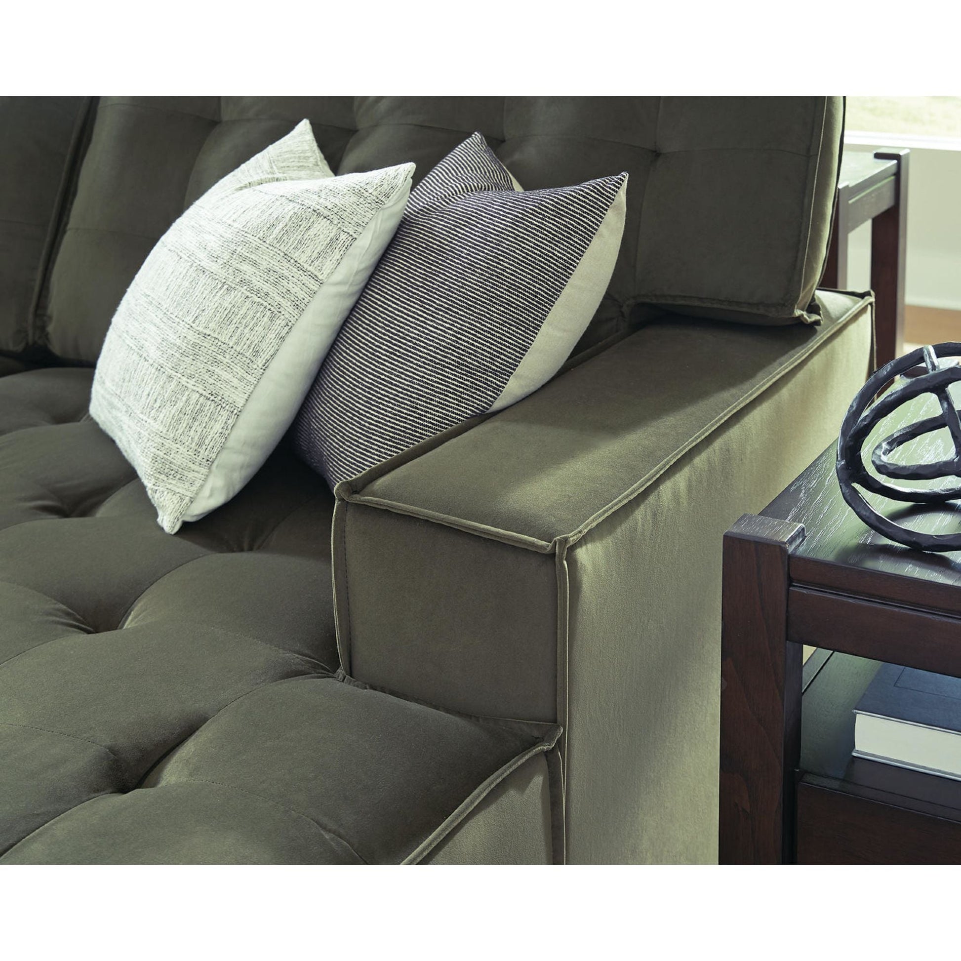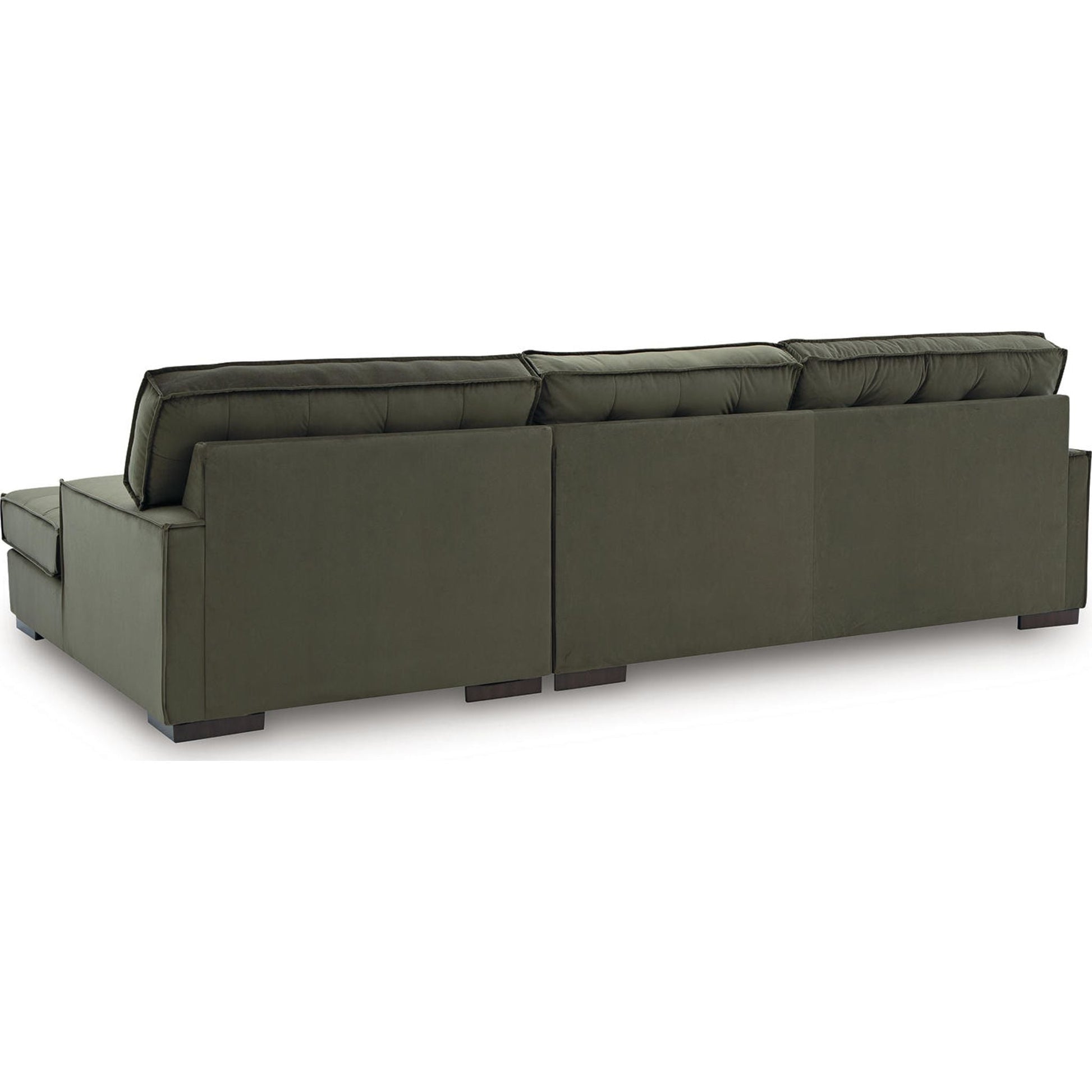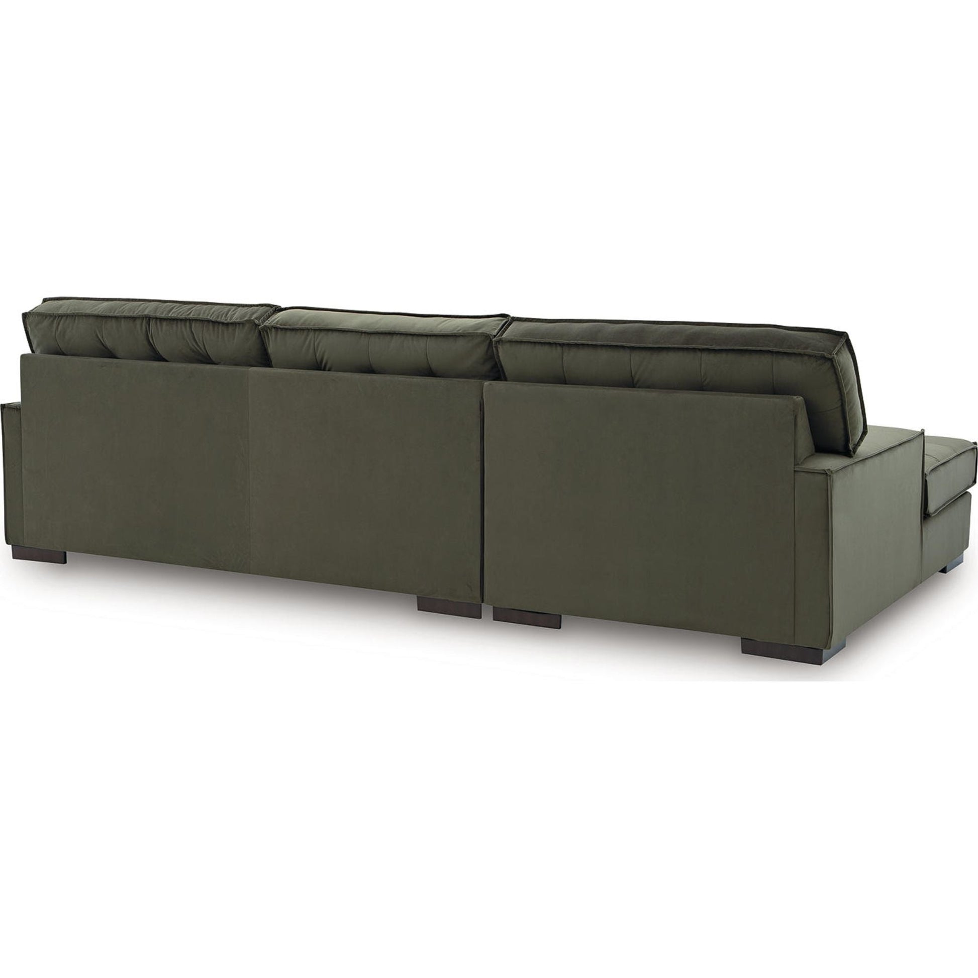 This sleek sectional with chaise offers a highly contemporary look with plenty of space to spread out. Dramatic tufted detailing and luxurious upholstery in a rich olive color create a sophisticated atmosphere. This sectional is perfect for those who love to entertain, or simply relax, in uptown style and comfort.