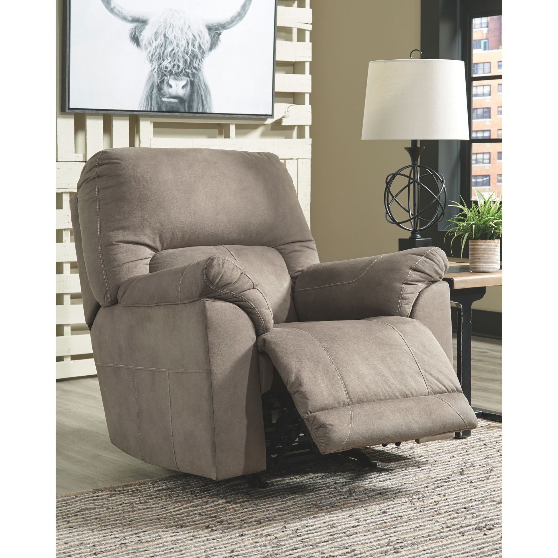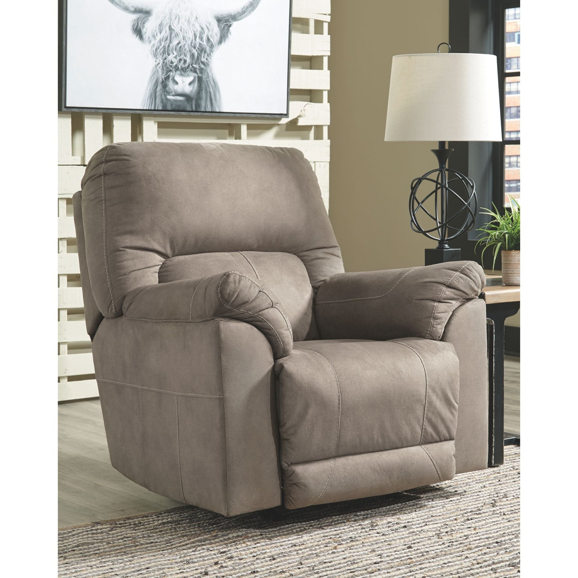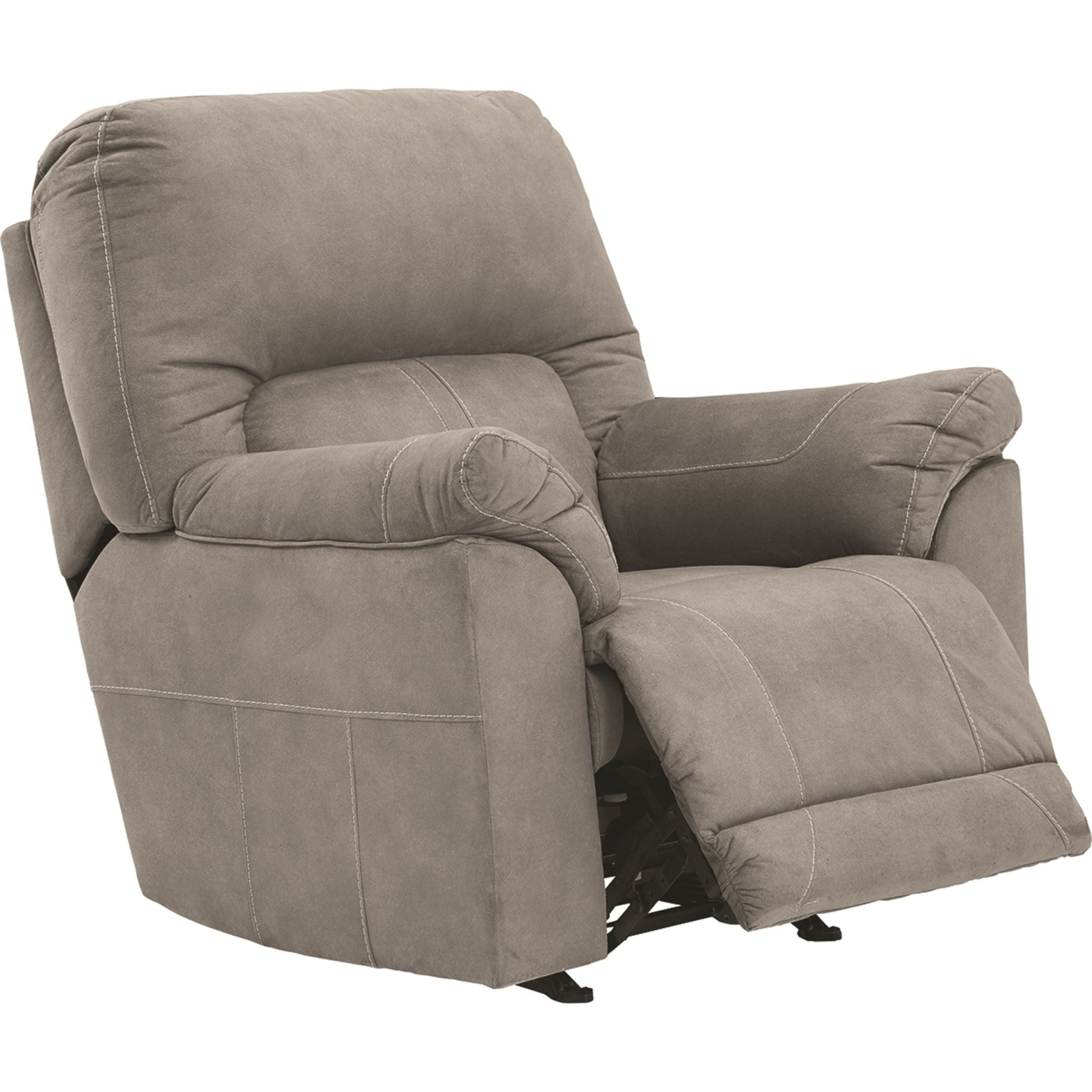 Strike a balance between the indulgent comfort you crave and the cool aesthetic you long for with this rocker recliner. Offering the cool look of weathered leather, the feel-good slate-tone upholstery takes neutral to new heights. Simply chic divided back tailoring and jumbo stitching are among the finer details that make all the difference.