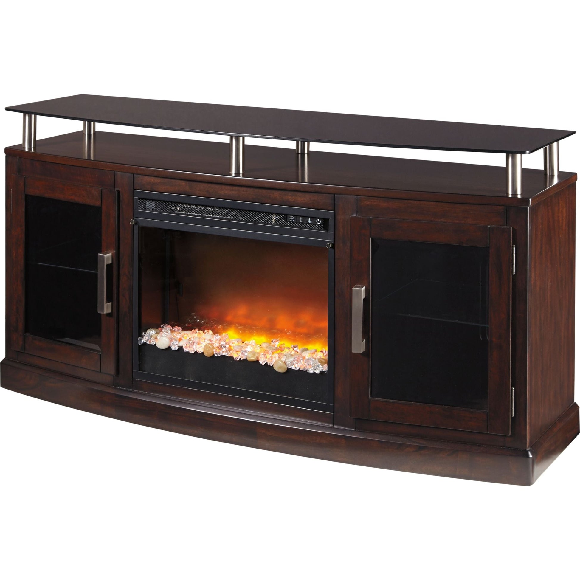 If you’re looking for an elevated take on contemporary style, you’re sure to appreciate this TV stand with fireplace insert. Its “floating” black glass top brings that wow factor you’ve been yearning for. Other standout elements, including an arched front design, glass-front cabinets and architectural bar pulls give this TV stand a sleek sensibility and touch of drama. Adding that much more show-stopping style: an LED fireplace insert that operates with or without heat and includes a six-level temperature setting, remote control and overheating control for added safety. The fireplace insert comes with optional faux glass crystals and natural stones, so you can customize the look of the flame bed.