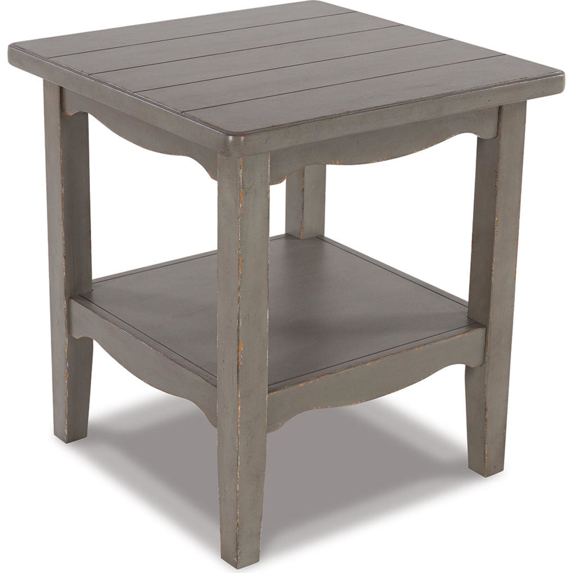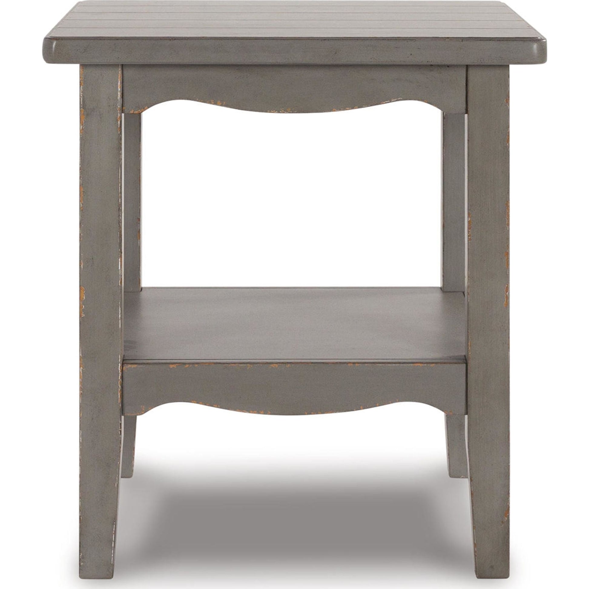 Put your love of European farmhouse styling on display. Finished with an antiqued gray chipped paint effect for an authentic vintage look, this end table is loaded with character. An open display shelf allows for storage and easy access to books, beverages and more.