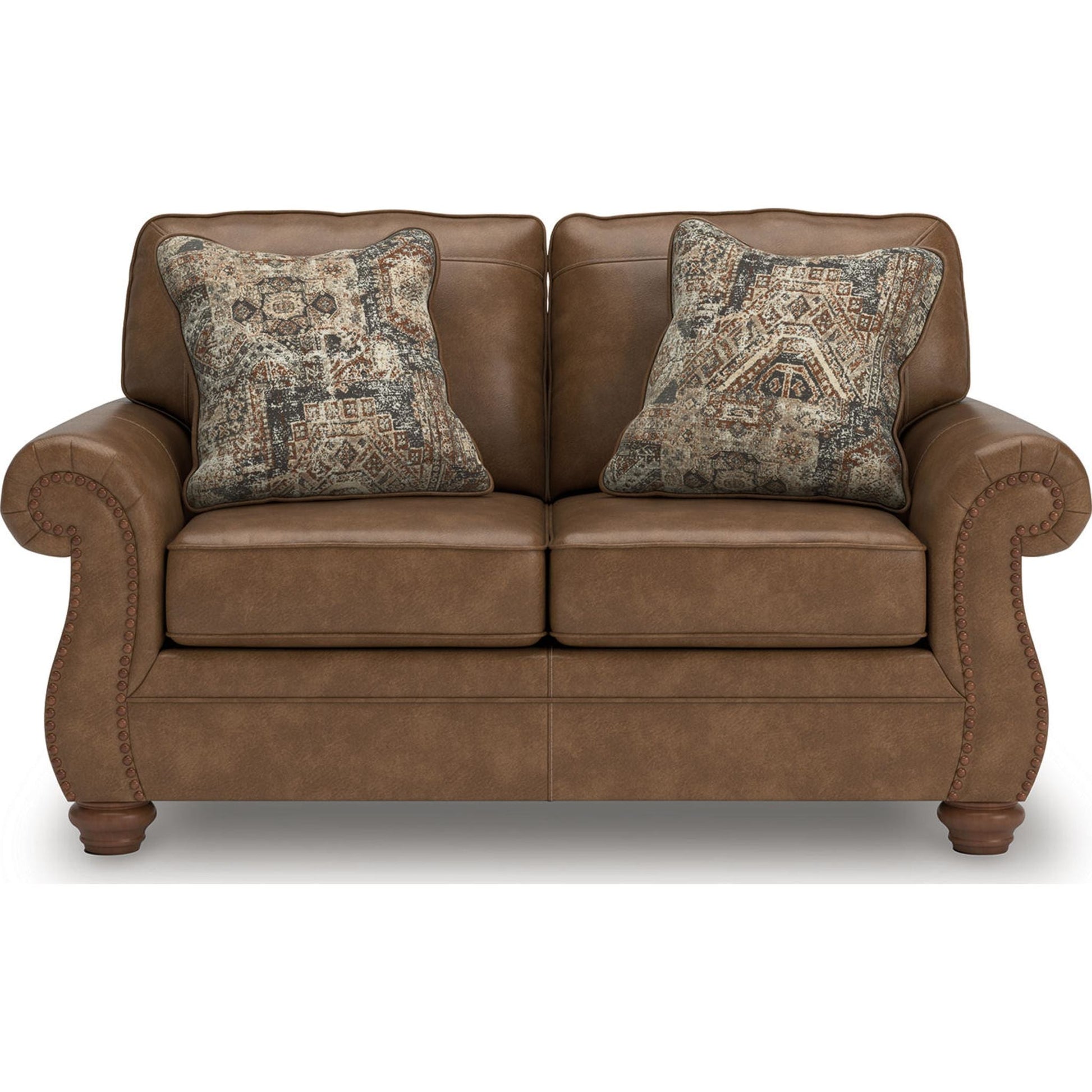 Everyone can have the best seat in the house with this loveseat. Its nailhead trim puts the finishing touches on the traditional roll arms you love. Comfy, durable cushions—wrapped in a rustic yet sophisticated faux leather—keep you feeling relaxed. Chenille pillows in a distressed motif pattern add another layer of comfort. And the loveseat's turned legs show that style and quality flow from top to bottom.