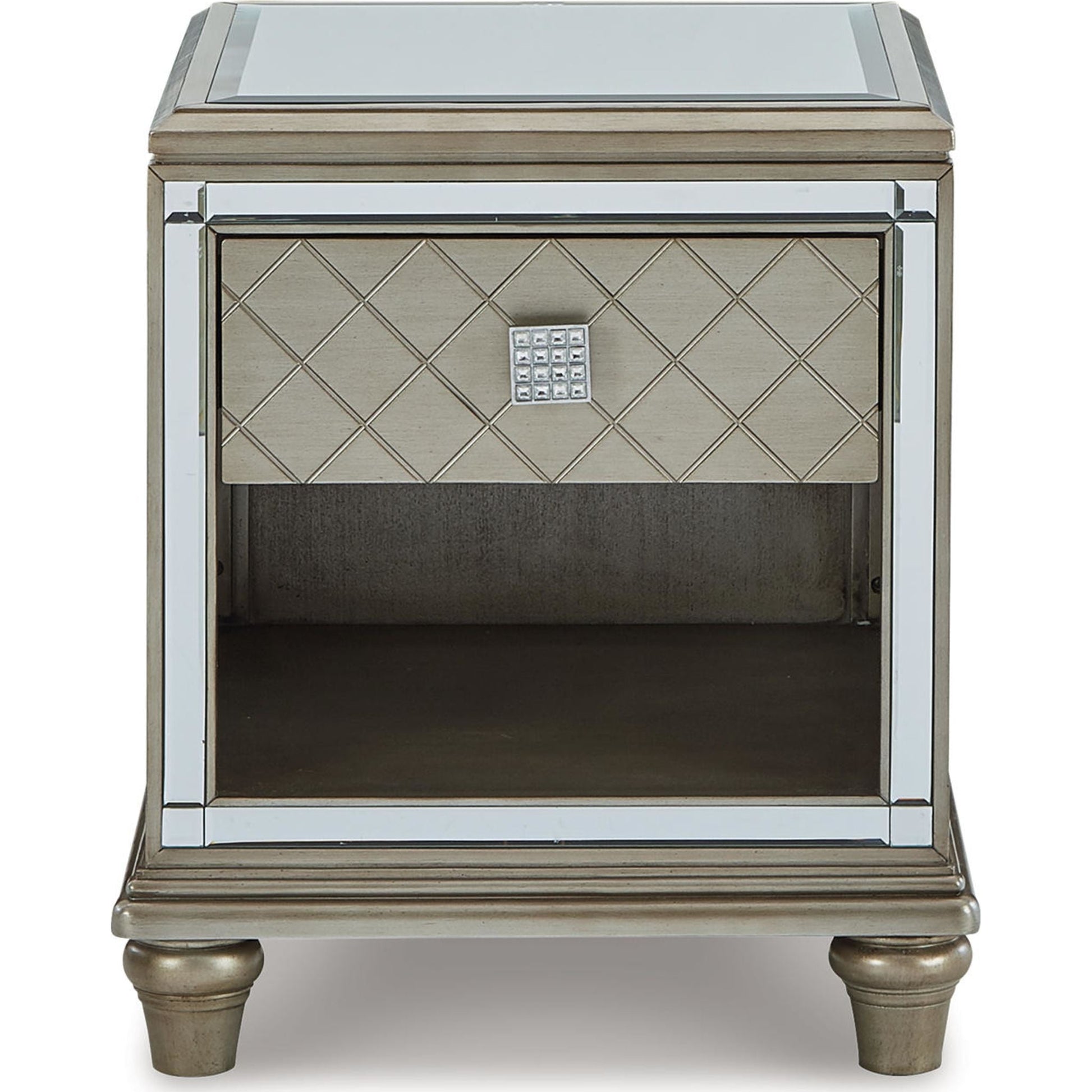Glamorous, chic and sophisticated. This rectangular end table is made with a metallic silvertone finish, inset beveled mirror panels and drawer pulls adorned with faux crystals. No matter how you style it, this table is a stunning addition to your contemporary decor.