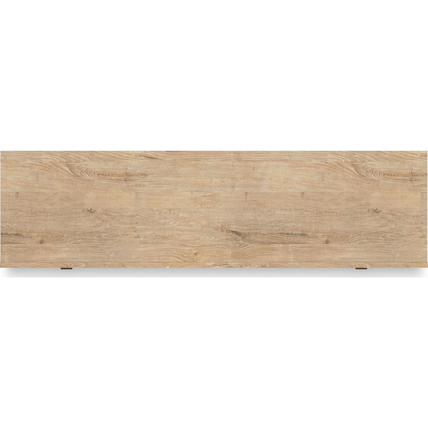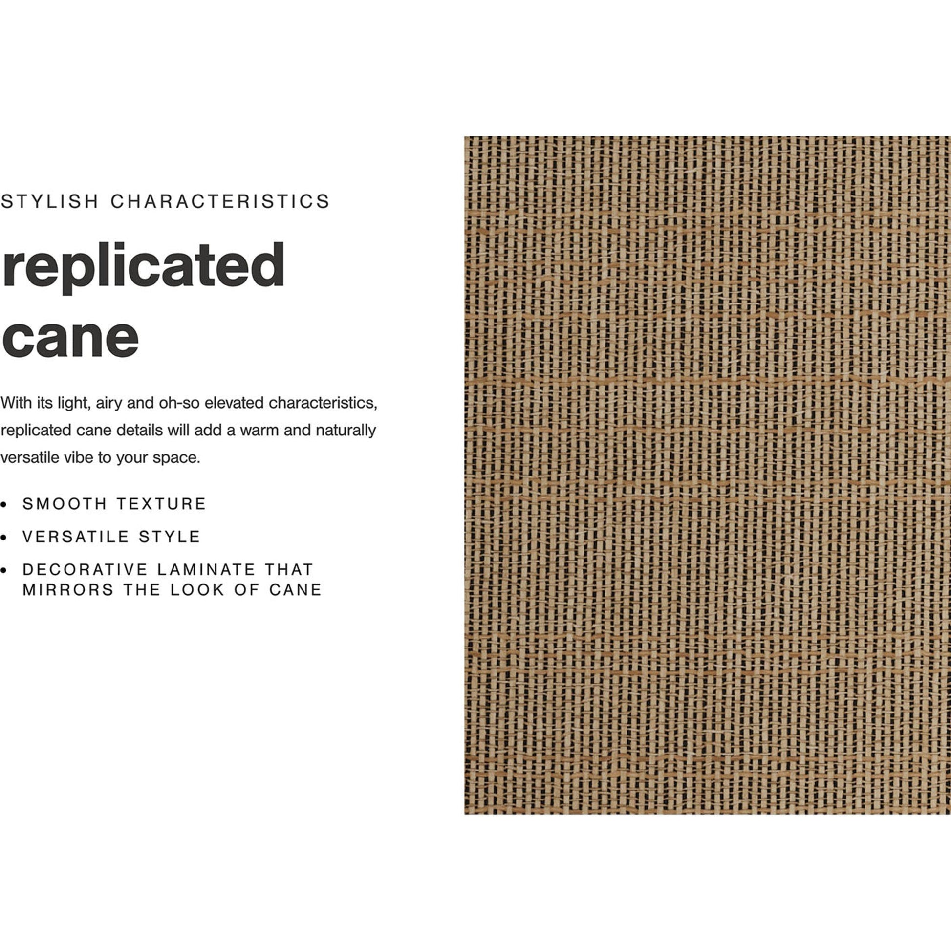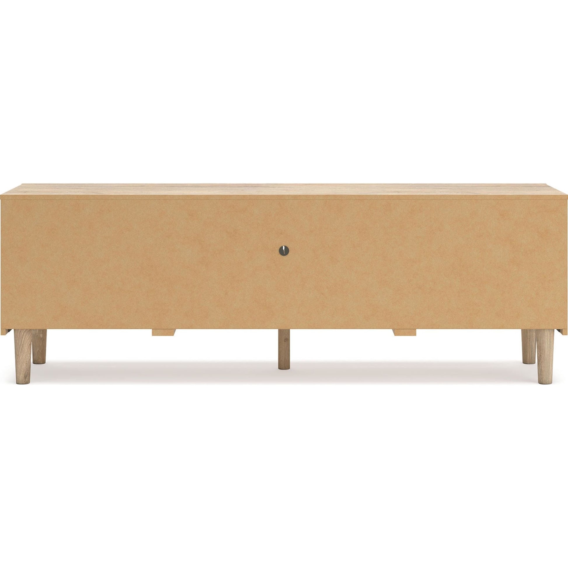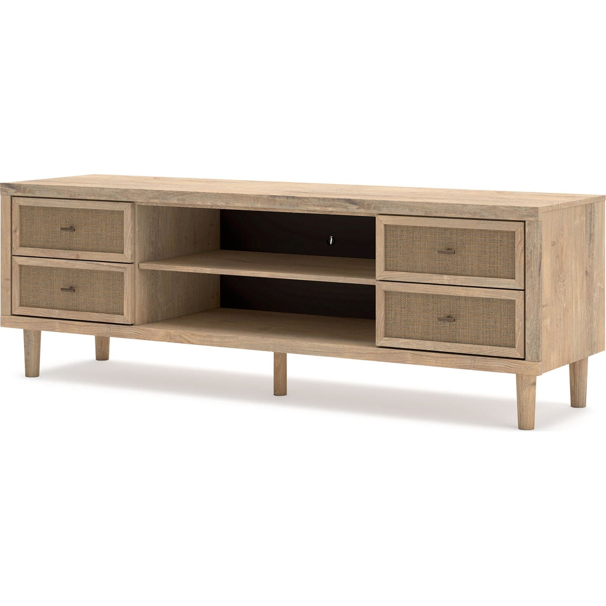 Clean-lined and contemporary—but far from stark—this TV stand is a fresh style awakening. Pairing a light finish with replicated oak grain and textured beige cane details, its mixed materials bring a naturally versatile vibe to your favorite spot for binge-watching or gaming. Sleek, simple hardware plays perfectly with the modern aesthetic. And prepare to have your mind blown by the vast universe of storage possibilities within the spacious drawers and open shelving.