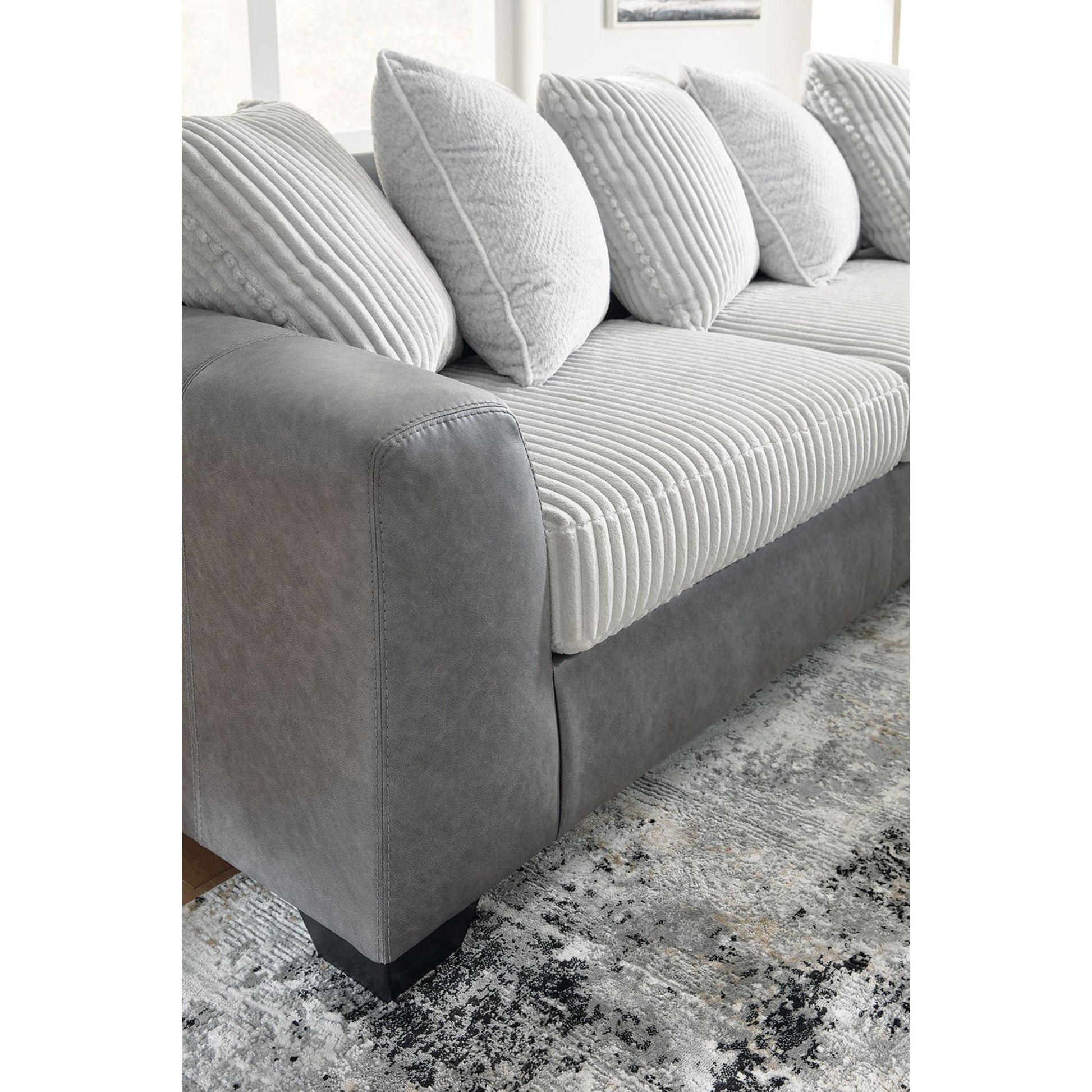 You want your living room to reflect your ultra-cool character. Introducing: this sectional with chaise. Its combination of retro-cool jumbo cord and sleek faux leather takes a unique approach to contemporary aesthetics. For a finishing touch, pillows provide a stylish scatter back silhouette.