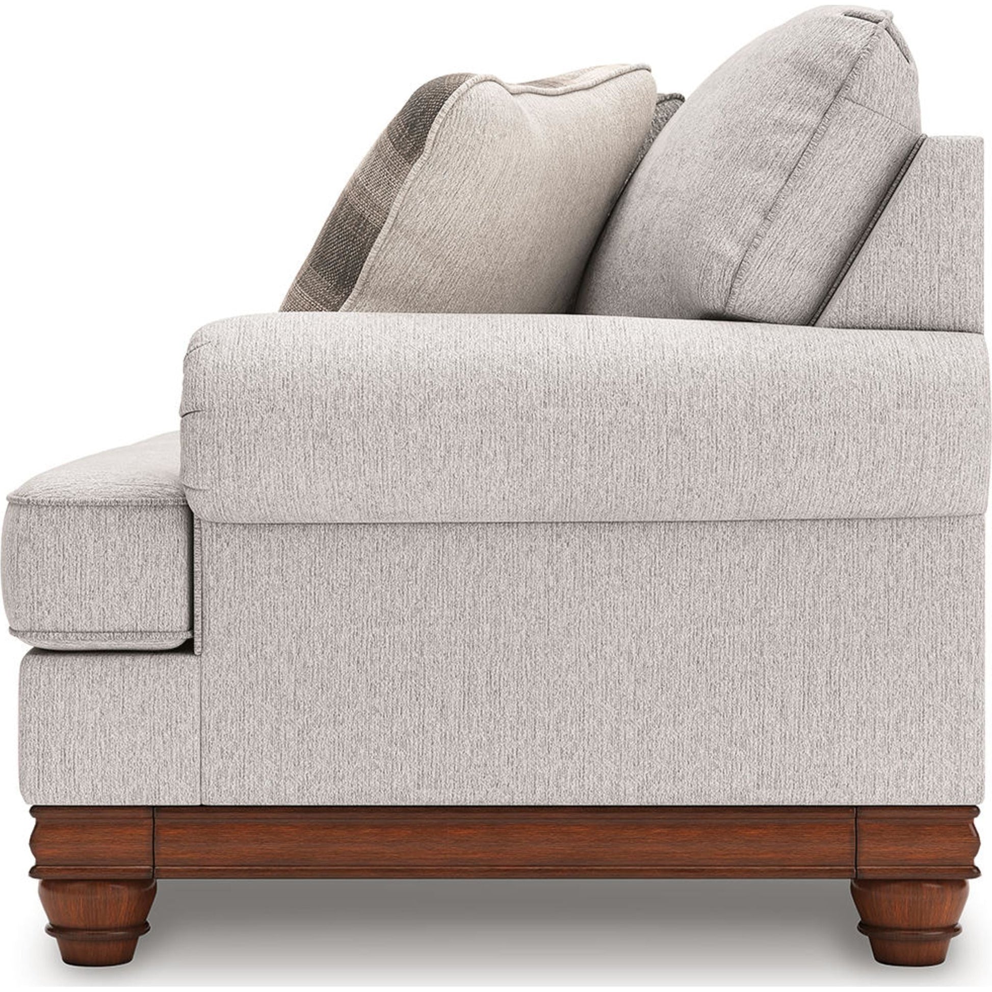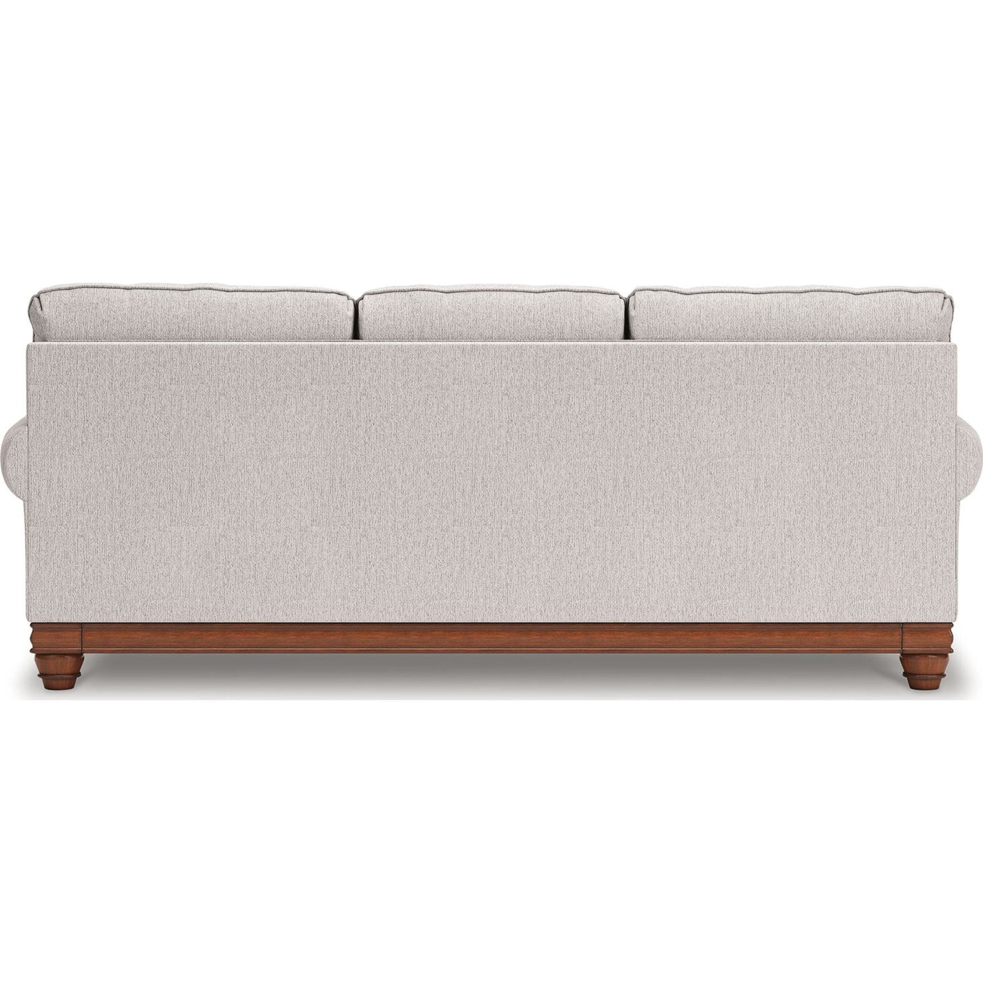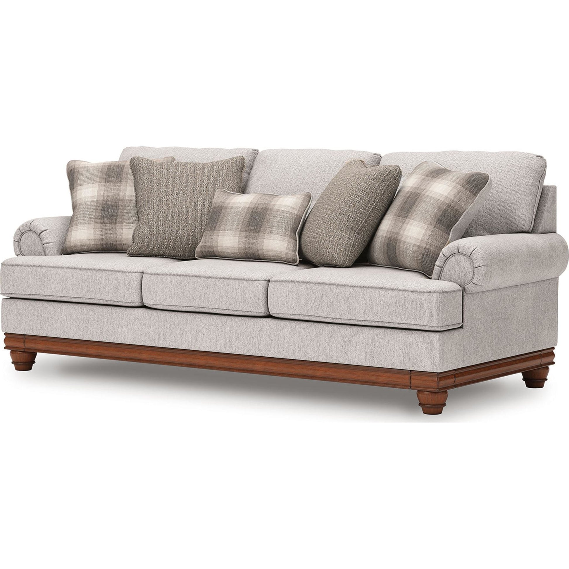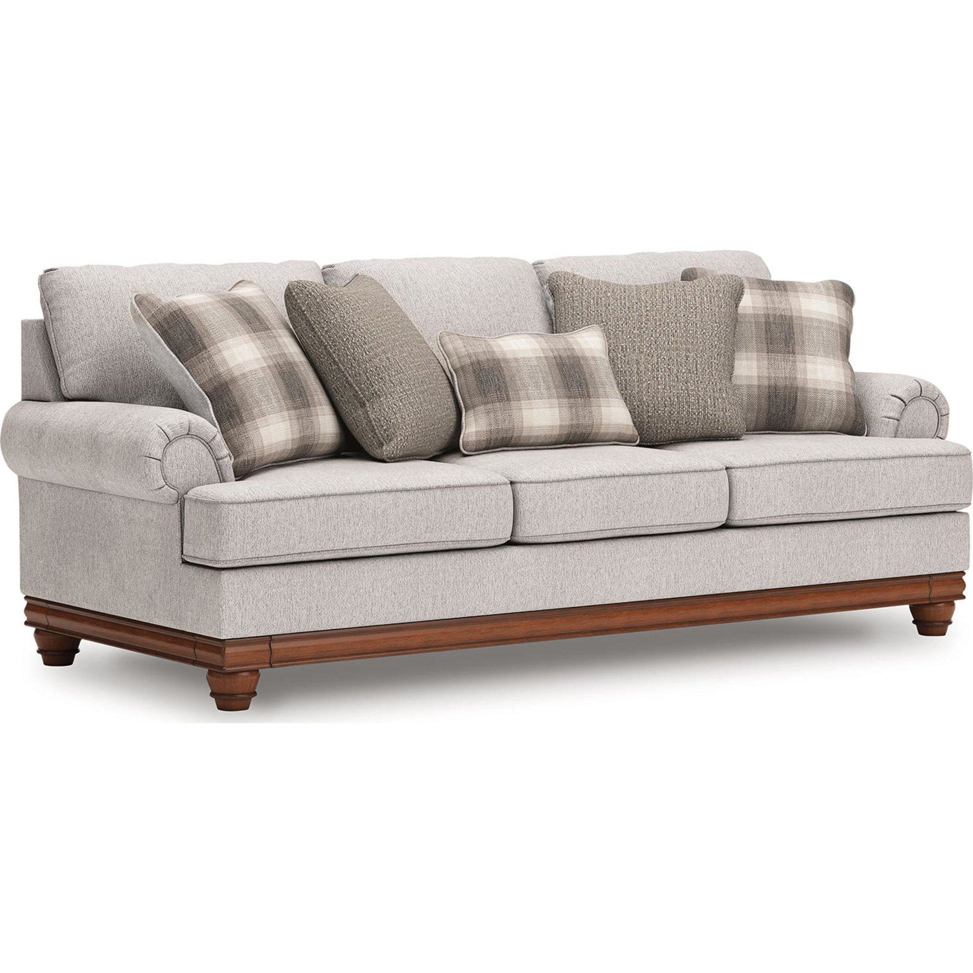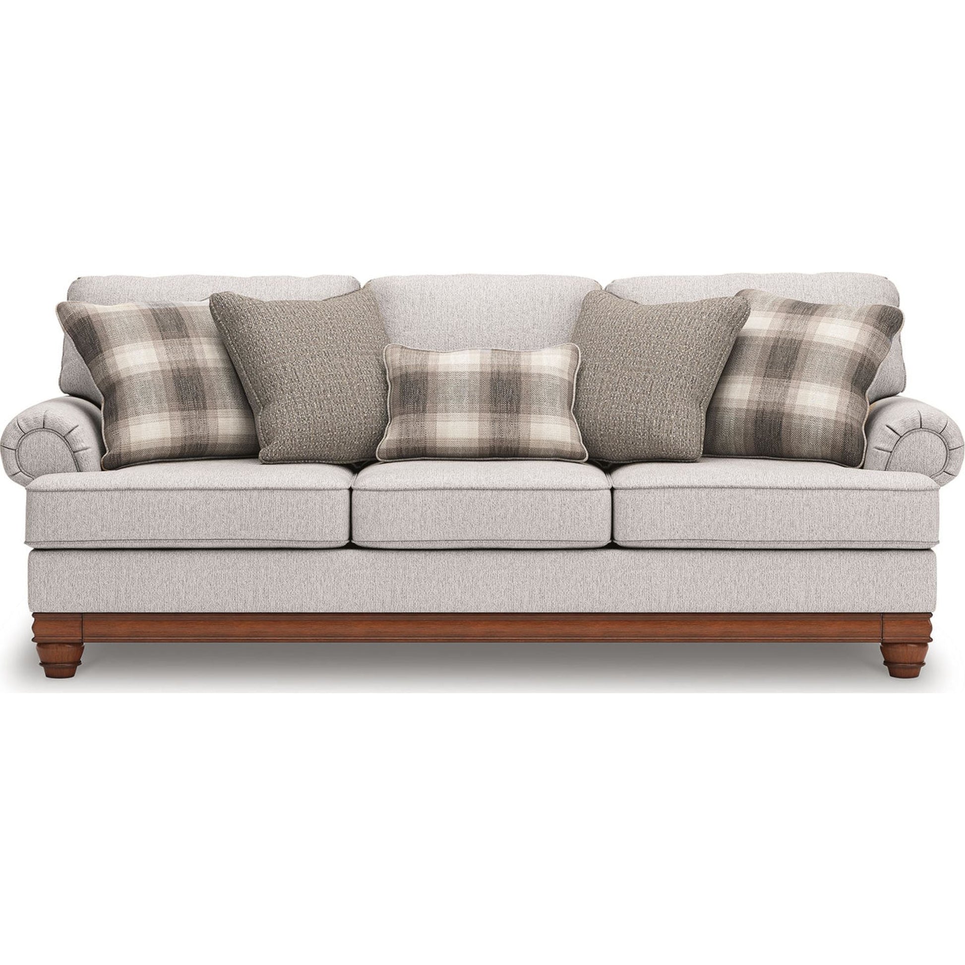 Fresh yet classic. That’s the beauty of this sofa. Dressy and also soft to the touch, its organic neutral-toned upholstery is sure to bring a transitional farmhouse aesthetic to your living space. Accent pillows in windowpane plaid and textured solid hues infuse a cozy and inviting farmhouse sensibility, while a full wraparound base and decorative turned legs complete the sofa's timeless look. It's the perfect place to unwind with your besties after a long day.