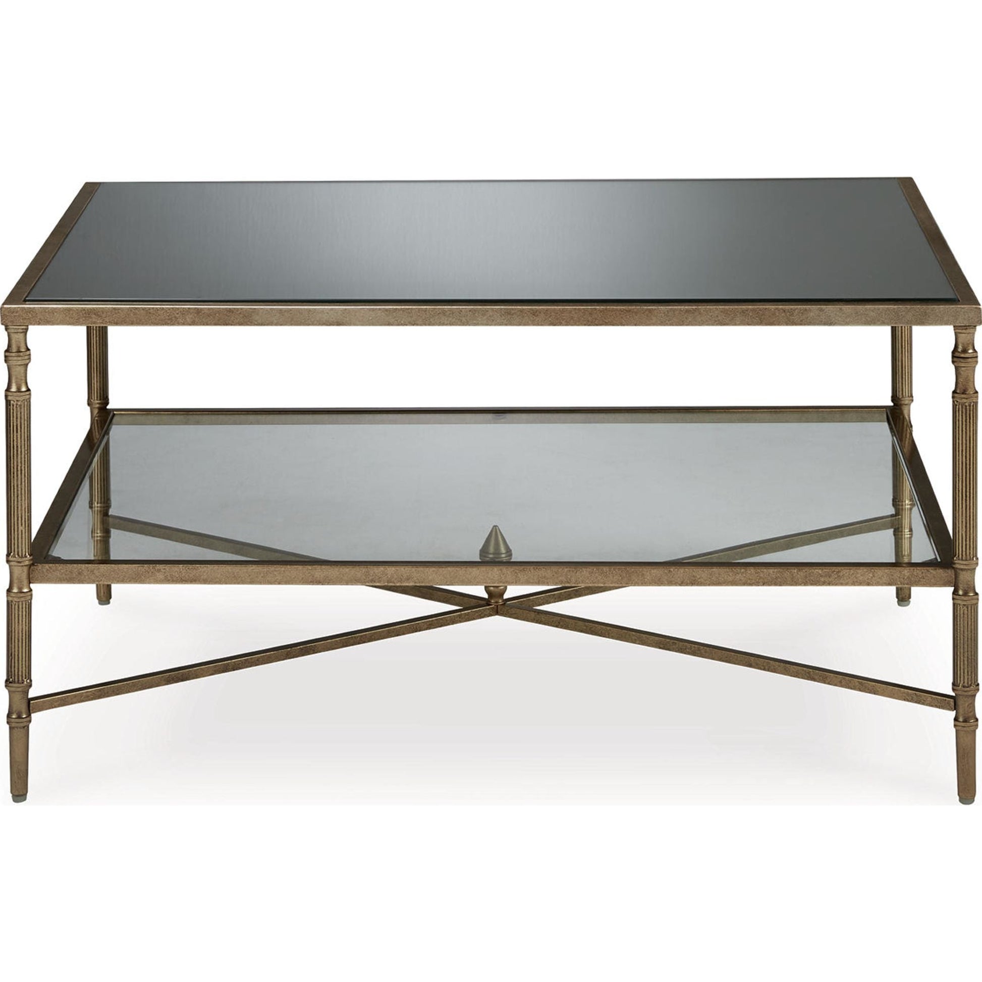 The Cloverty coffee table gives traditional design a wonderful sense of relevance. Its details, which include embellished legs and a stretcher with a decorative center finial, are timeless classics. The aged goldtone coloration is the essence of relaxed elegance. An underlying shelf adds style, substance and functionality.