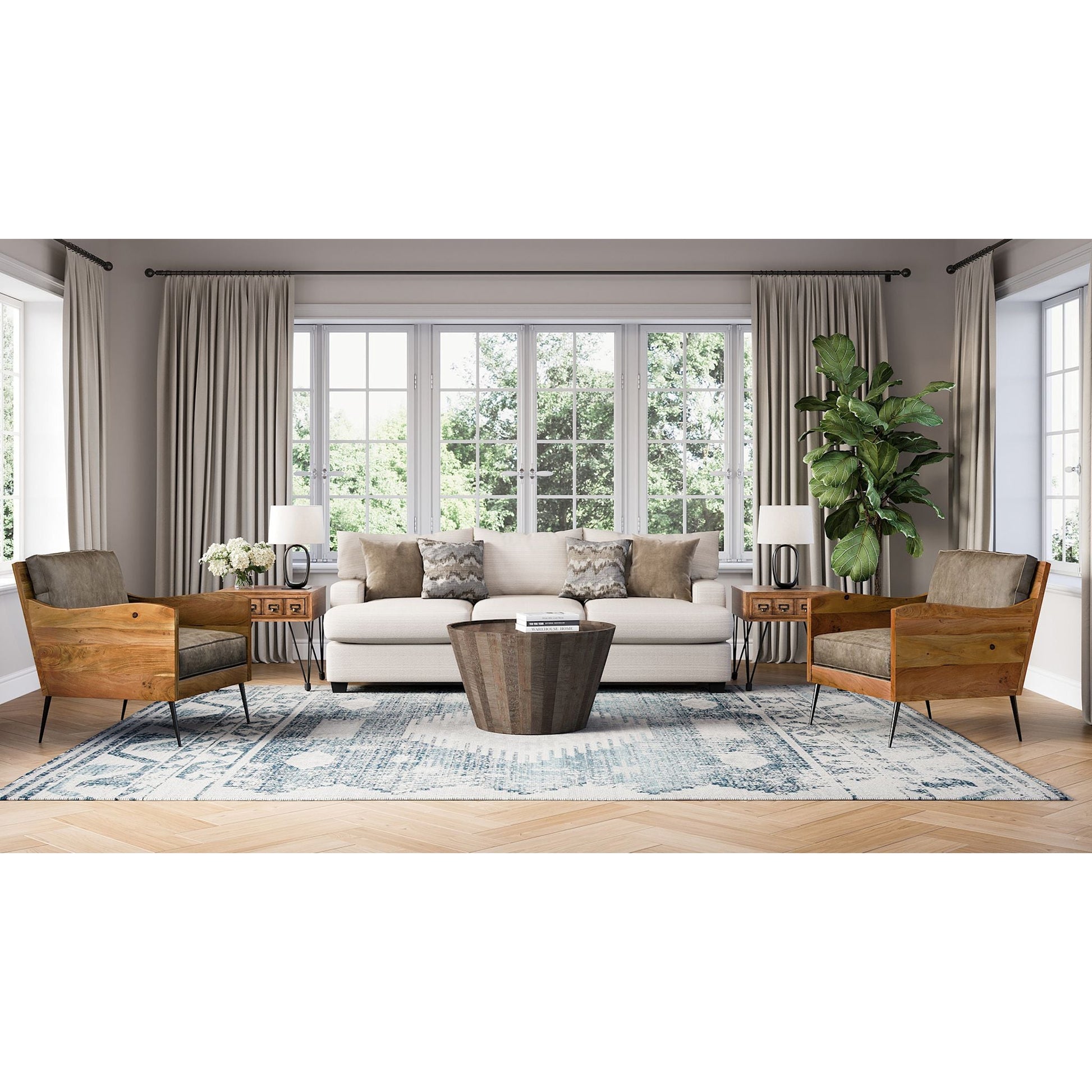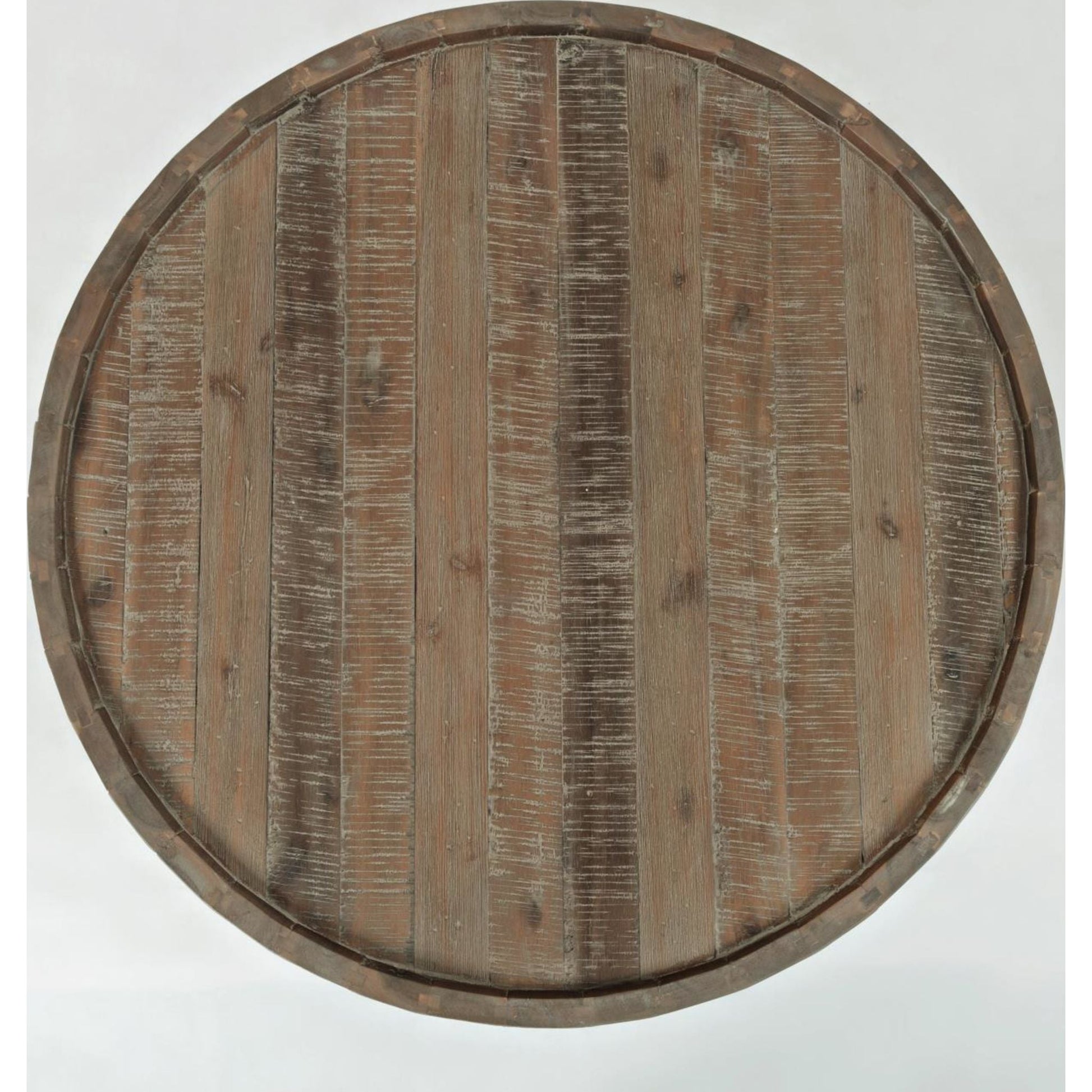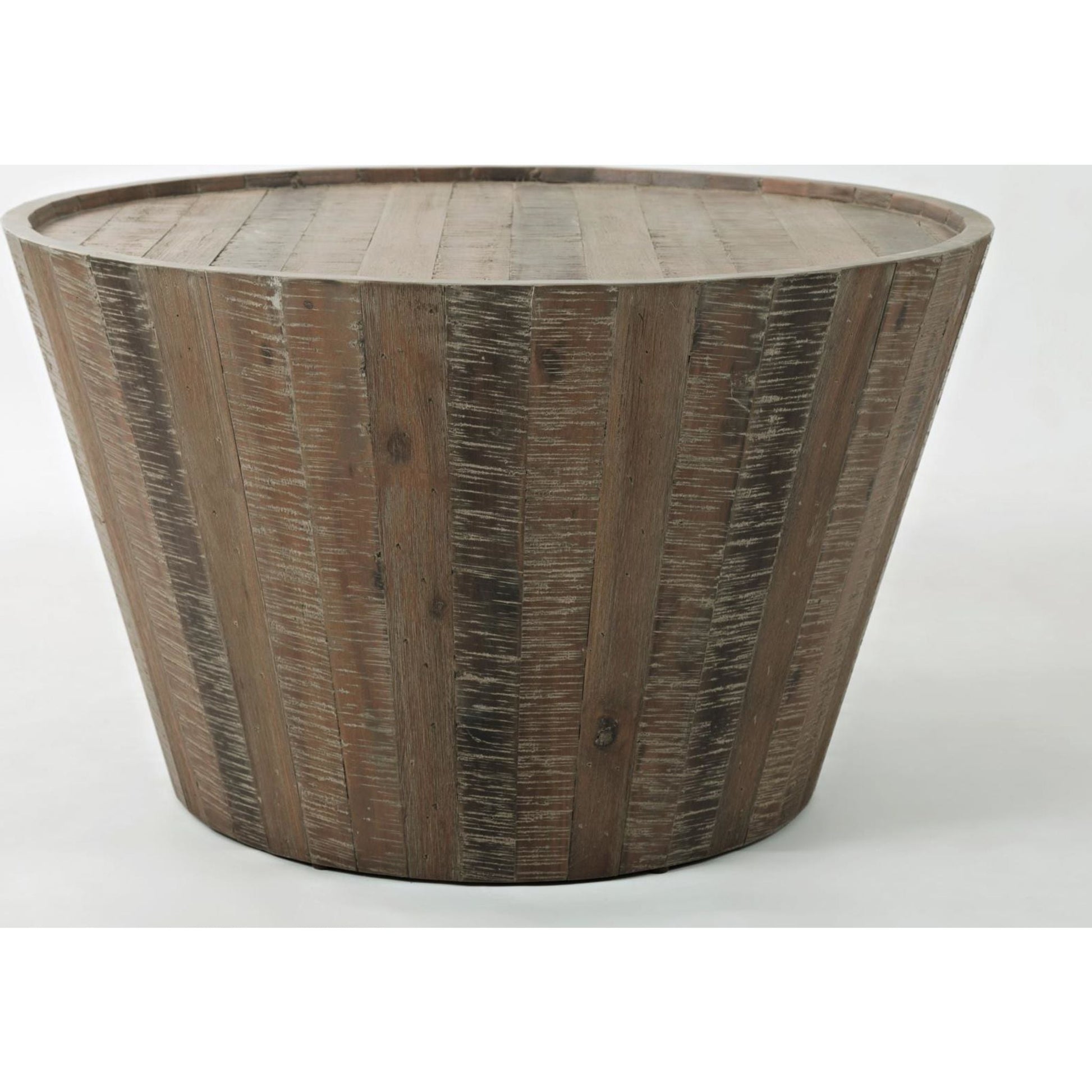 With a unique design and equally unique surface treatment, the Conundrum occasional group is at home is coastal and urban decor. A flared drum construction on both the cocktail and end tables compliments the perfectly proportioned bookshelf of this Solid Acacia collection.