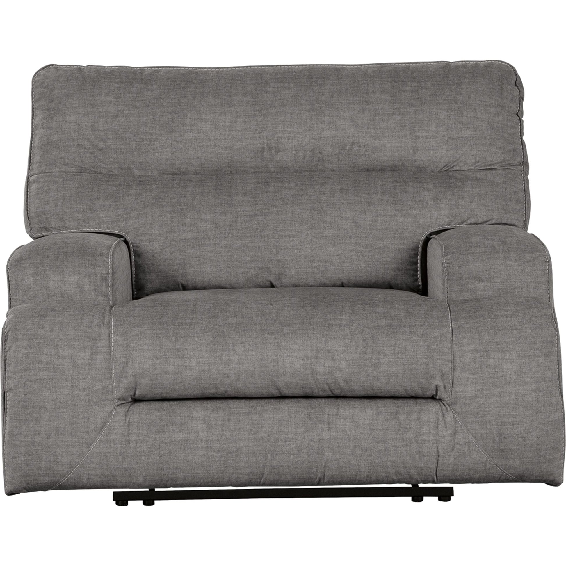 This wide seat recliner makes it hip to be square. Brilliantly boxy profile and wide track arms infuse a highly contemporary look you don’t often find in reclining furniture. Rest assured, the trendy charcoal-tone upholstery is sumptuously soft—and made all the more enticing with deep channel tufting for clean-lined flair.