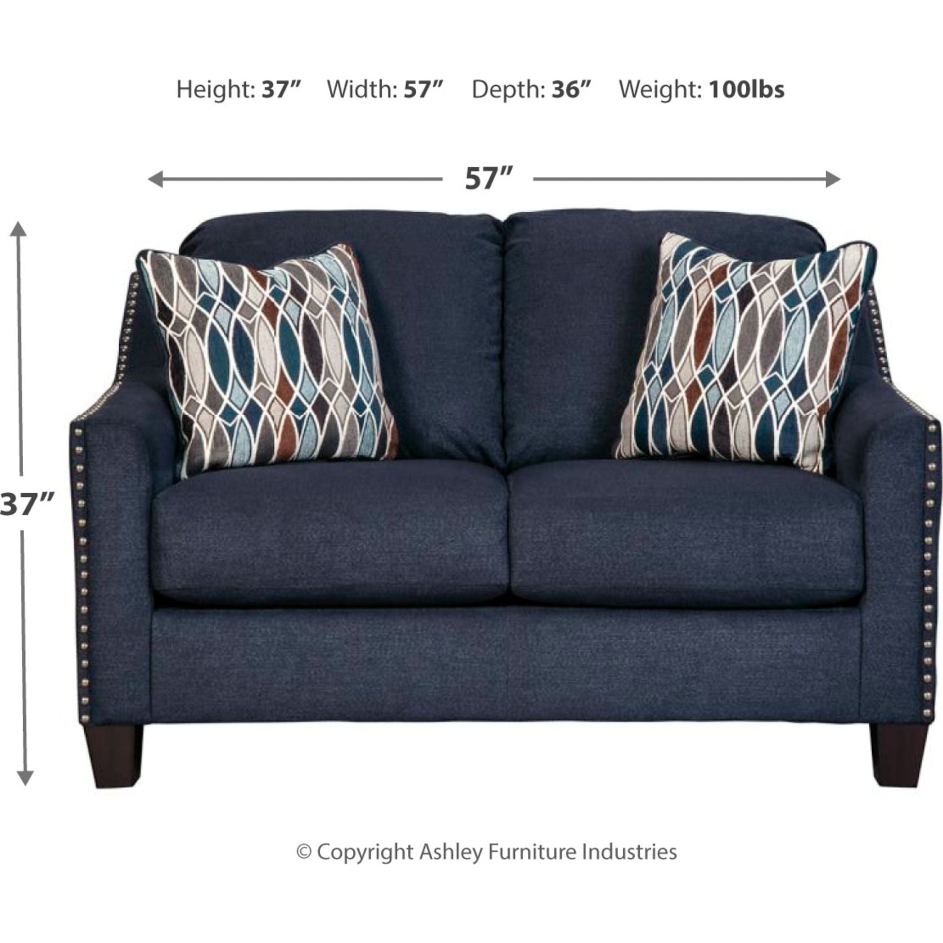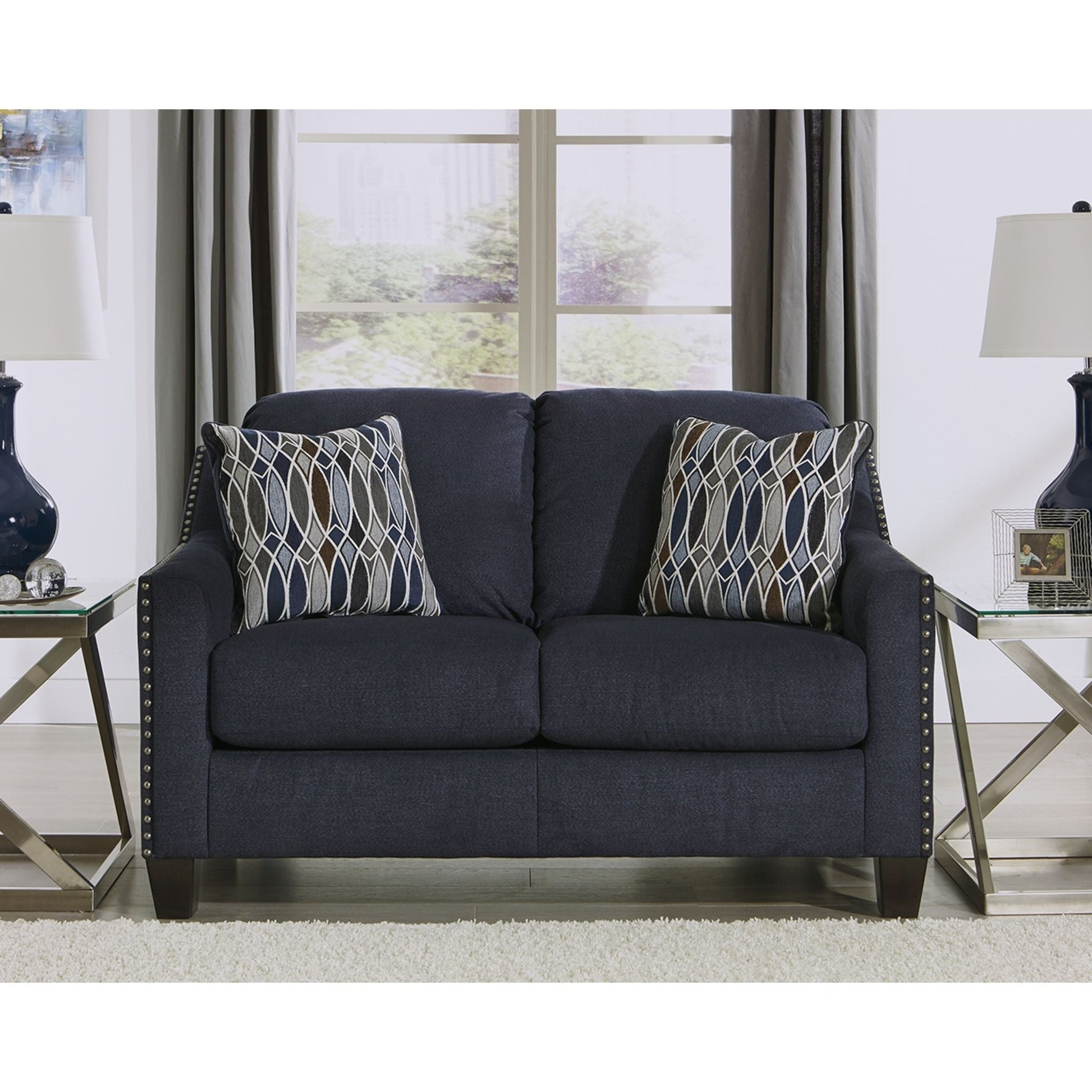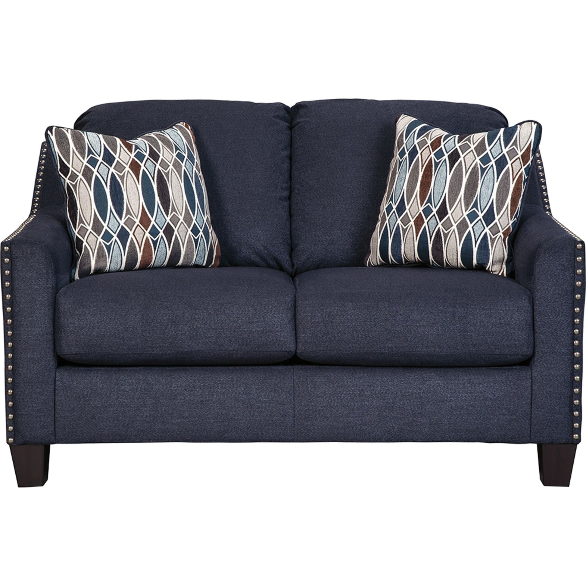 Upholstered in a striking midnight blue fabric with a soft brushed feel, this loveseat is undeniably handsome. Sloping arms are beautifully outlined with brushed nickel nailhead. Plush seating sets the scene for toss pillows immersed in a glasswork-inspired pattern design.