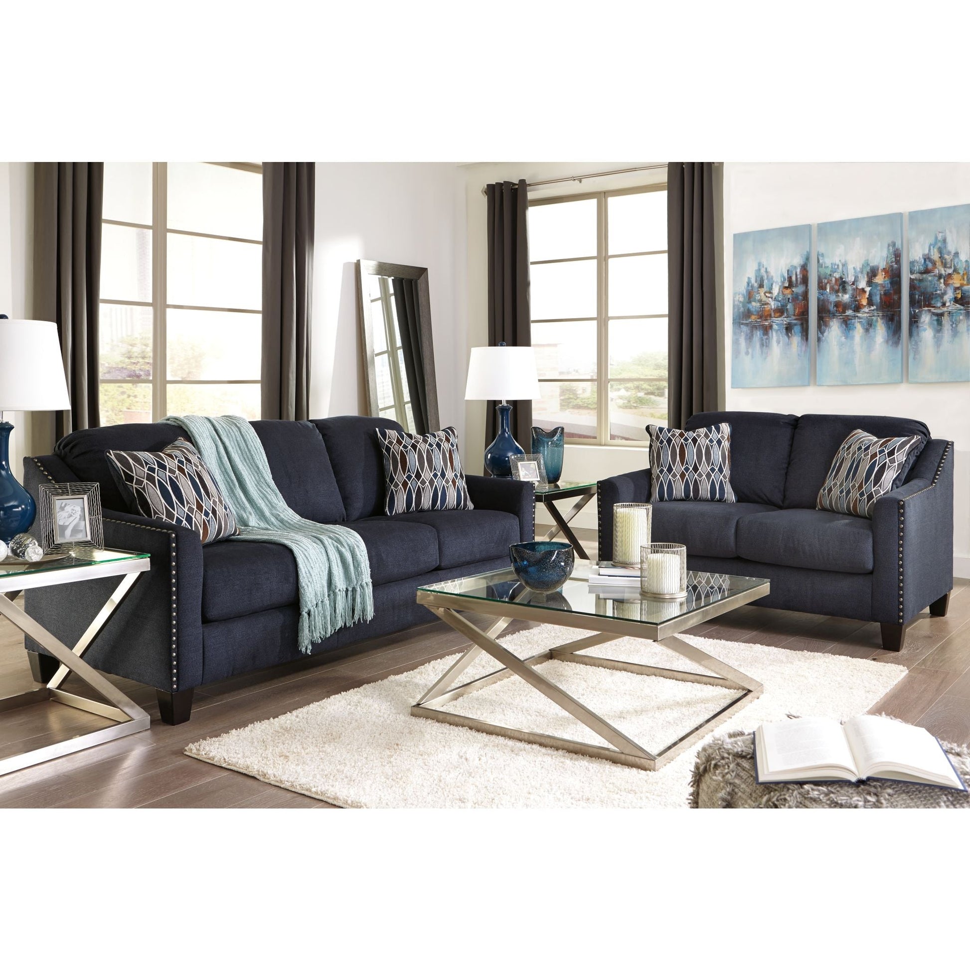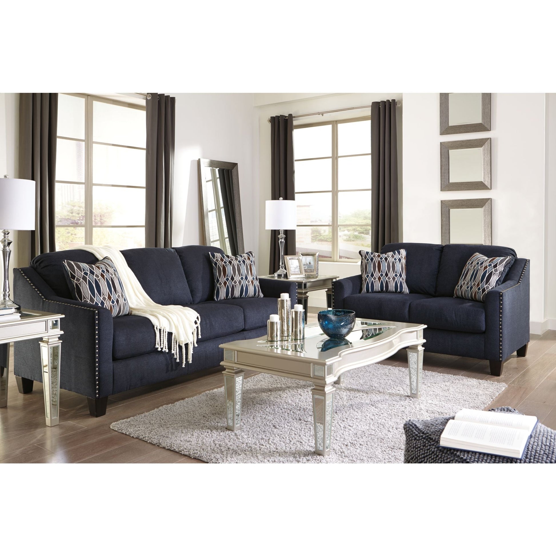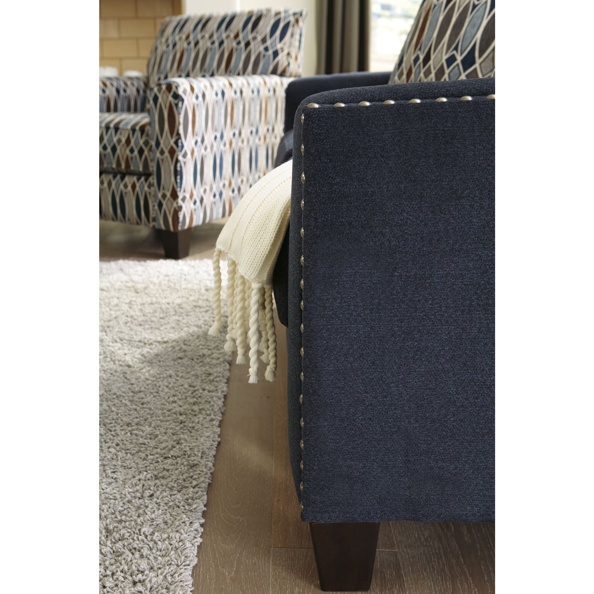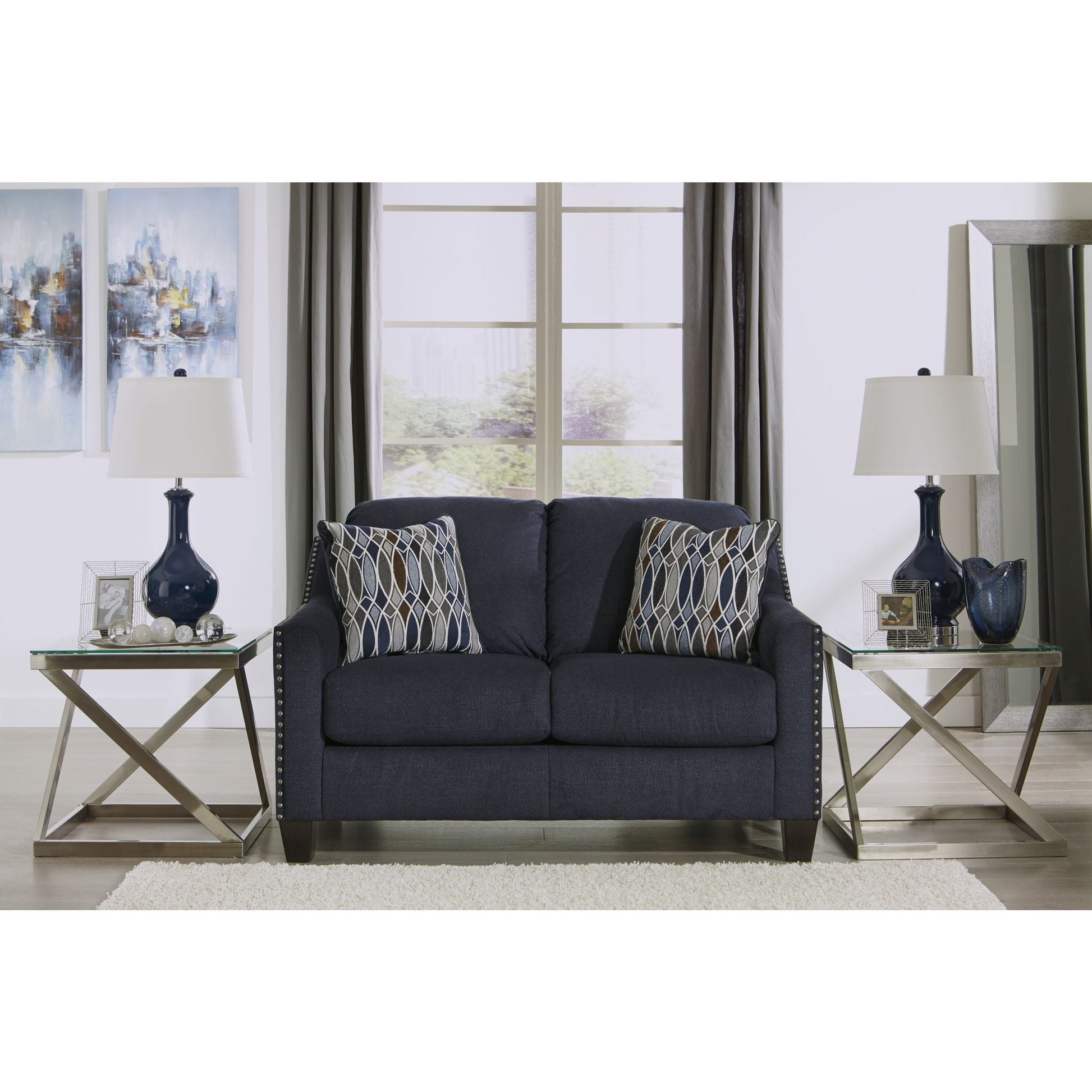 Upholstered in a striking midnight blue fabric with a soft brushed feel, this loveseat is undeniably handsome. Sloping arms are beautifully outlined with brushed nickel nailhead. Plush seating sets the scene for toss pillows immersed in a glasswork-inspired pattern design.