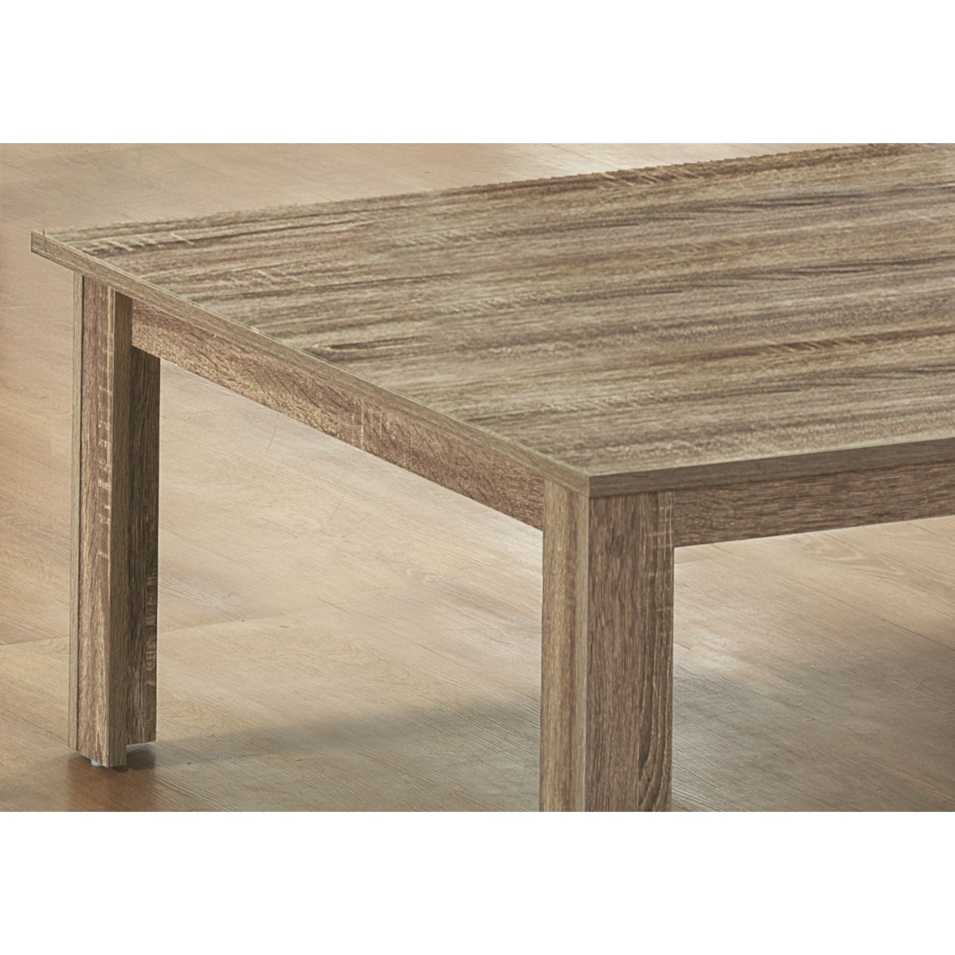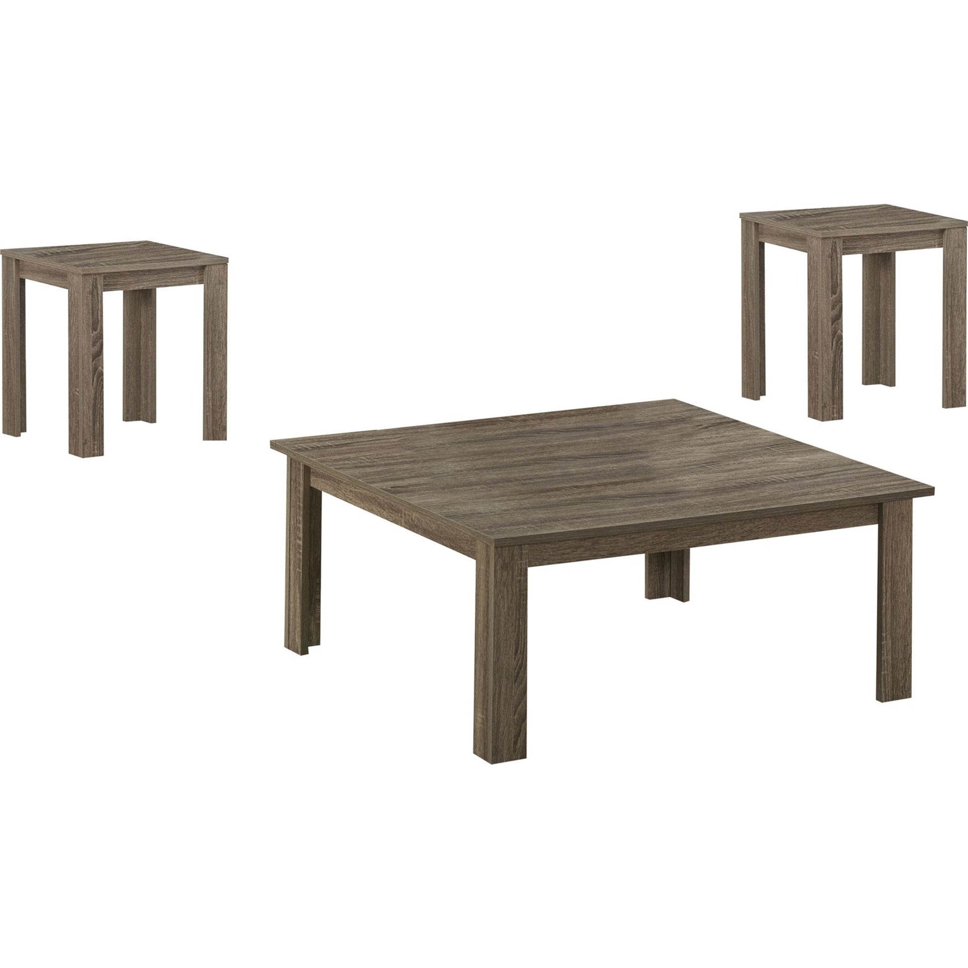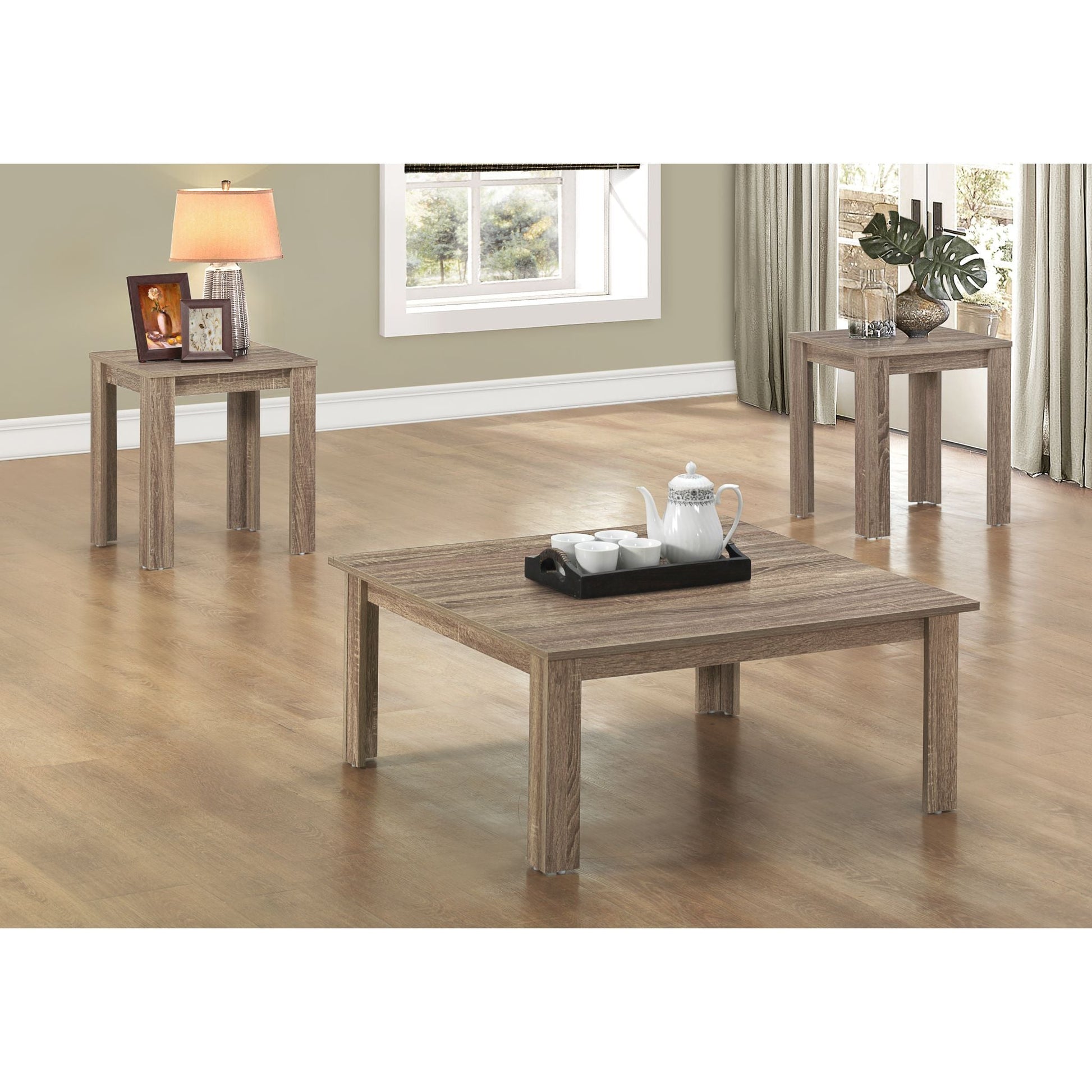 You've got a highly contemporary 3-piece living room table set here for the taking. Featuring a sleek taupe wood color, show off this coffee table set that is simply on another level. Including a coffee table and two matching cocktail tables all strongly built with symmetrical square-cut legs for extra sturdiness, your apartment, condo or home will be refreshed with a brand new appeal.
