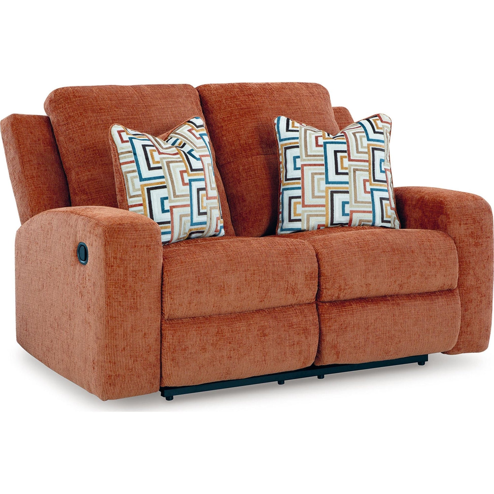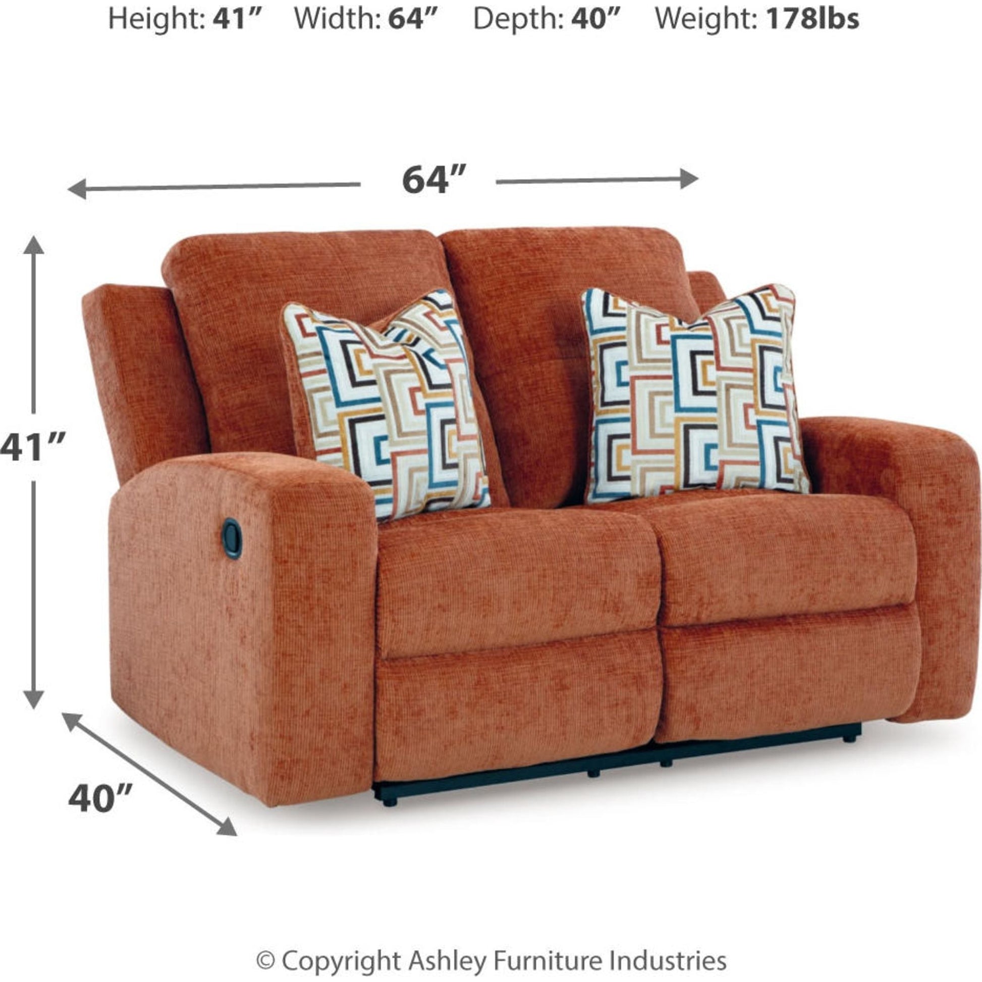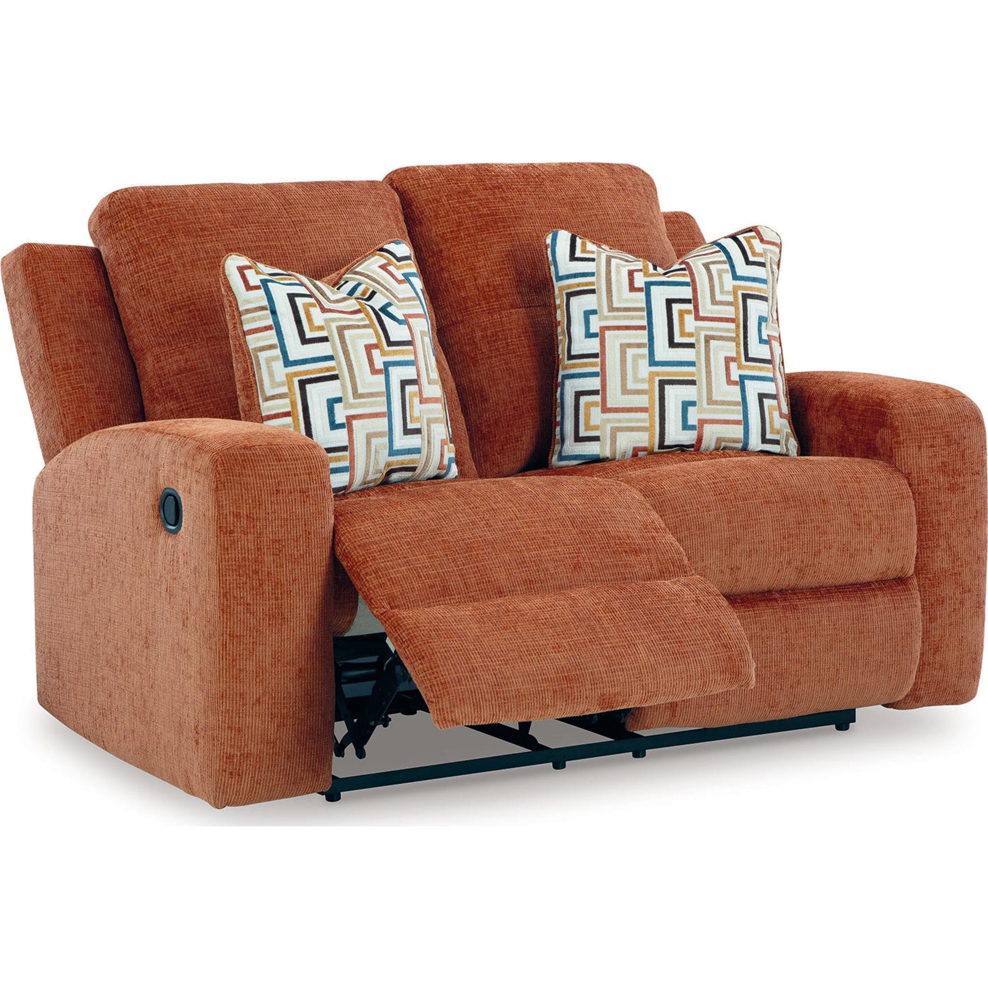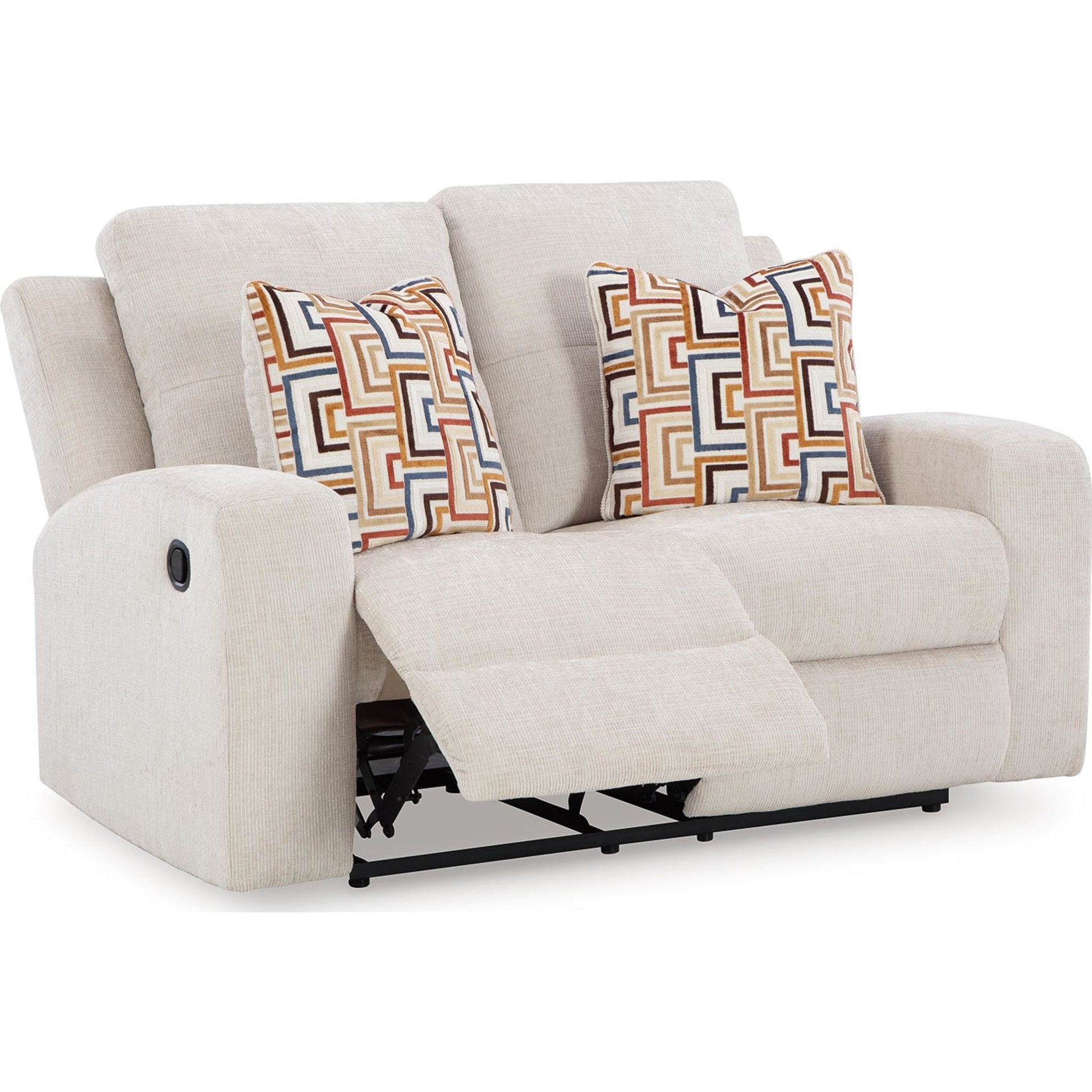 This reclining loveseat invites you to a luxuriously soft lounging experience. The chic hue fits right in with contemporary color palettes. A tufted back keeps the look right on trend. Balancing style and function, its pull tab reclining effortlessly takes you to relaxation mode.