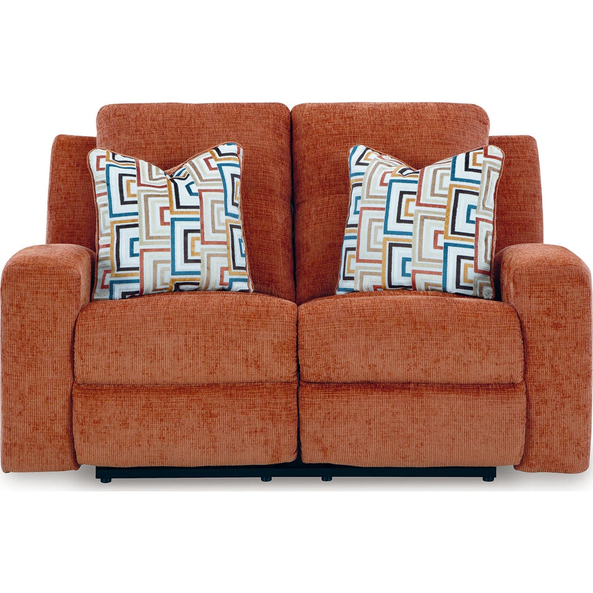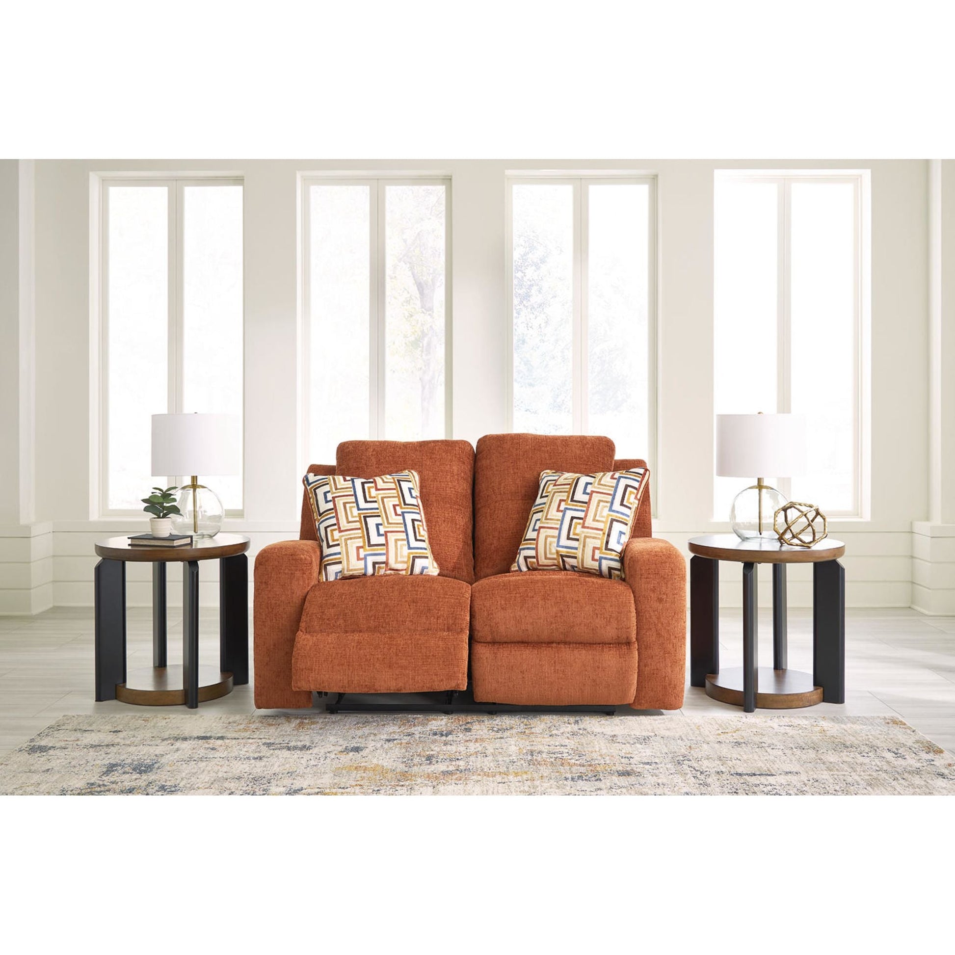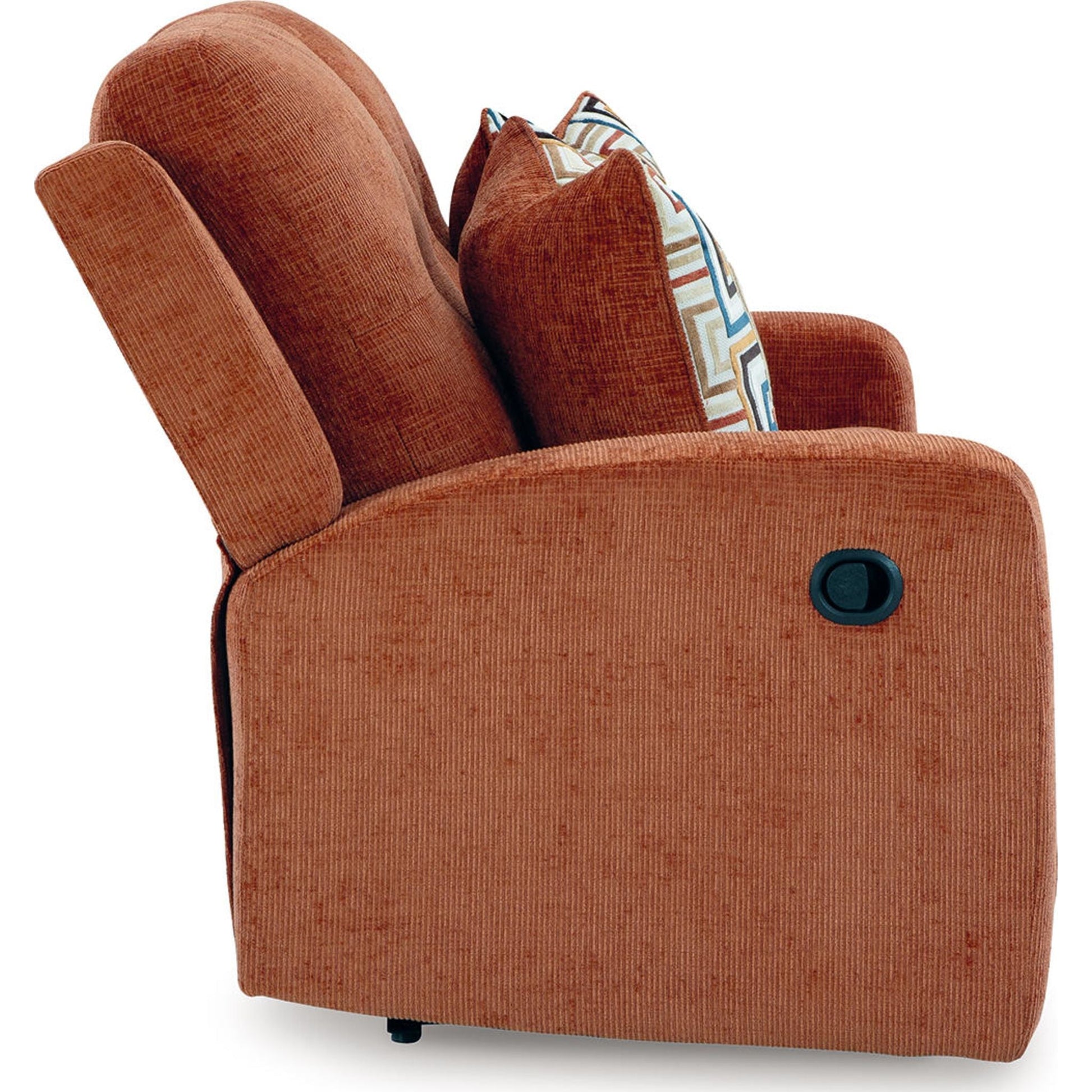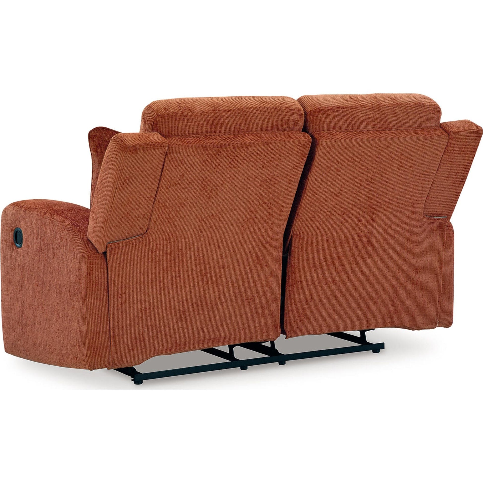 This reclining loveseat invites you to a luxuriously soft lounging experience. The chic hue fits right in with contemporary color palettes. A tufted back keeps the look right on trend. Balancing style and function, its pull tab reclining effortlessly takes you to relaxation mode.