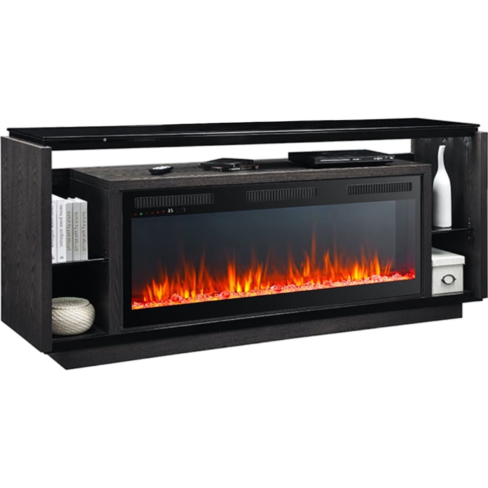 The David media console features modern styling complete with depth and symmetry. A black glass top finishes off this trendy design with ample open storage. Complete with the 50' Infinity Electric Firebox in crystal brings visual beauty and warmth to your home. This high quality unit features vivid bright flame effects and exceptional heat production.