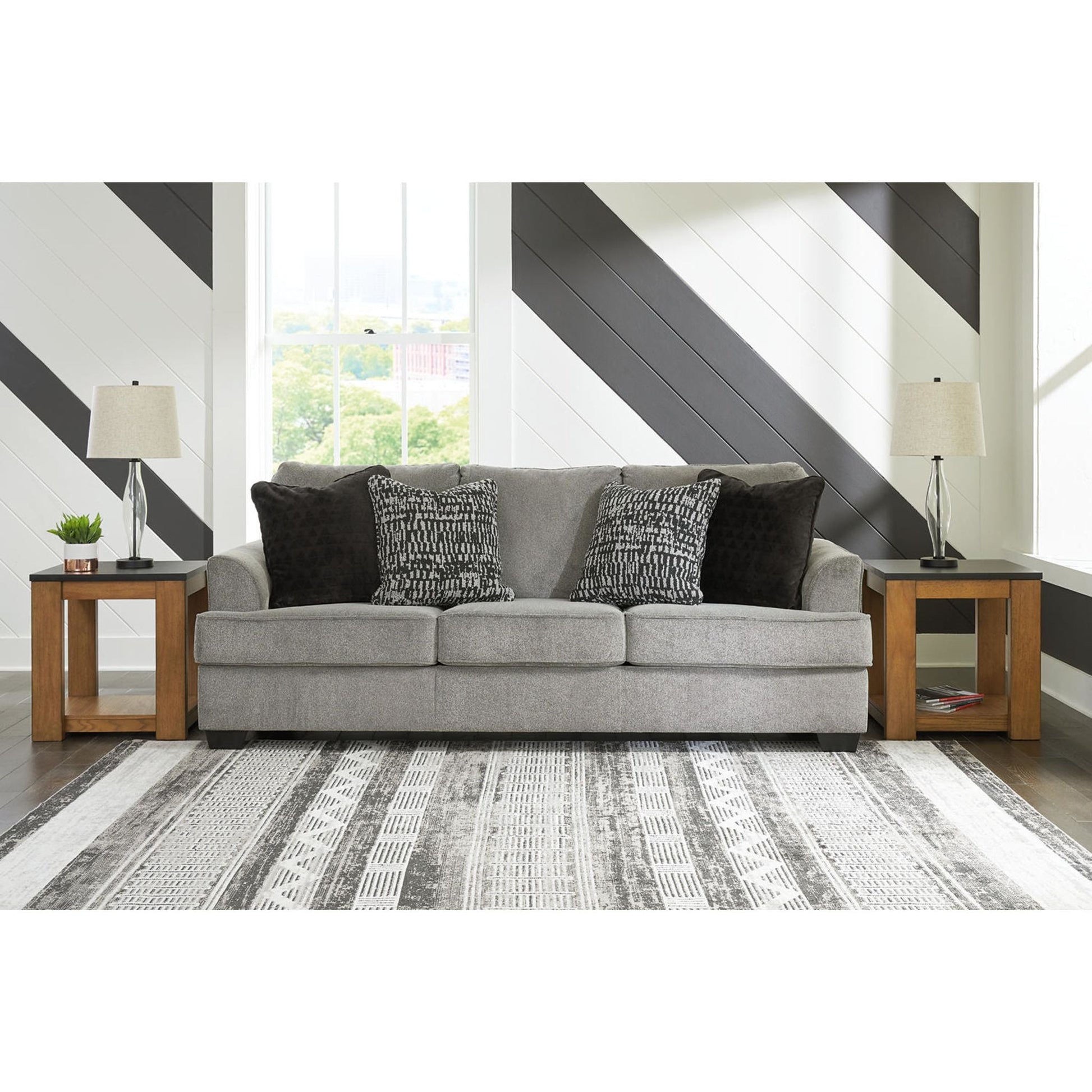 Stealing the show in on-trend, wonderfully plush upholstery, this sofa takes center stage with its comfort and contemporary look. A generous seat depth makes the high-design piece comfortable enough for easy everyday living. Faux fur accent pillows add a fun flair. Sit back and relax in clean, cool style anywhere and everywhere you please with this striking sofa.