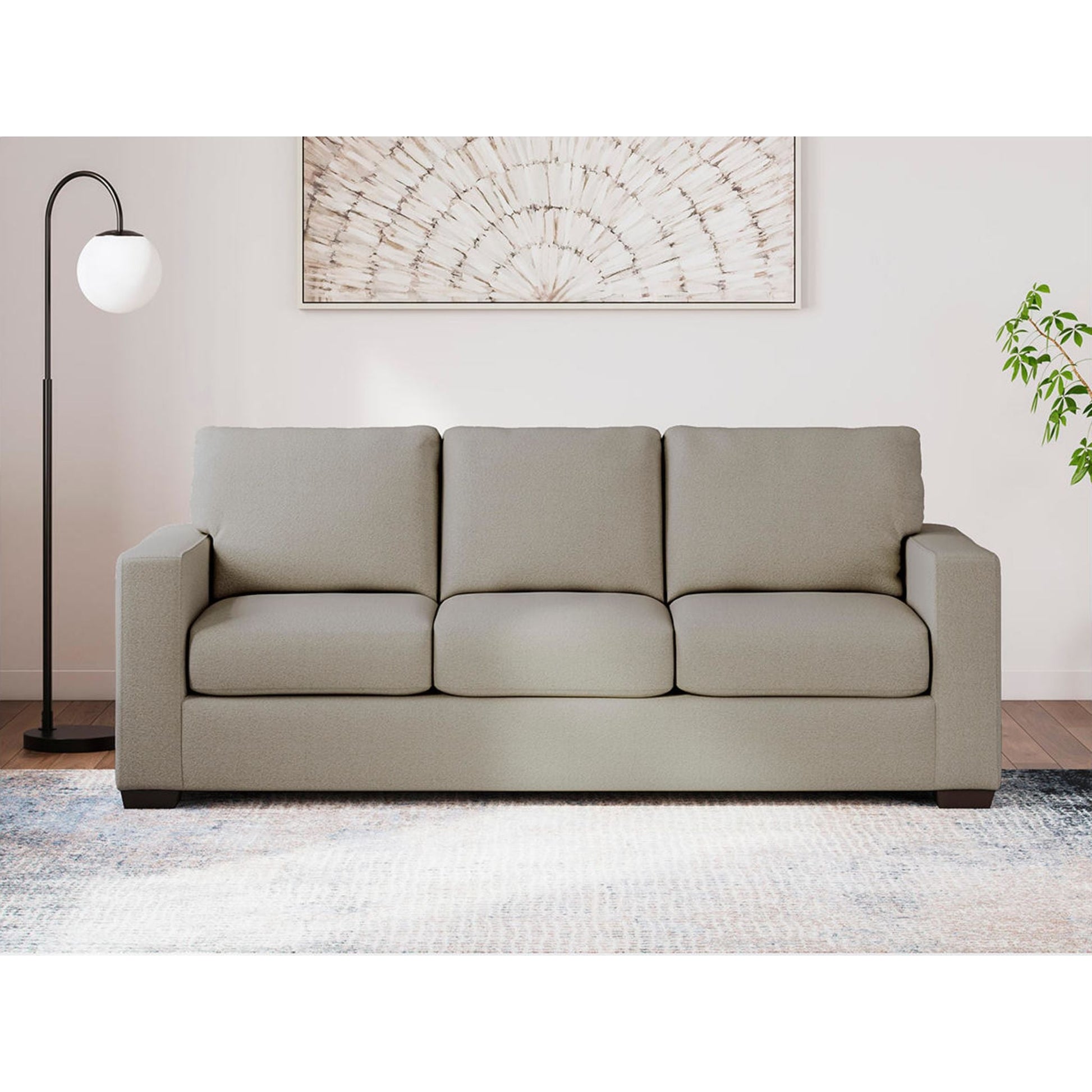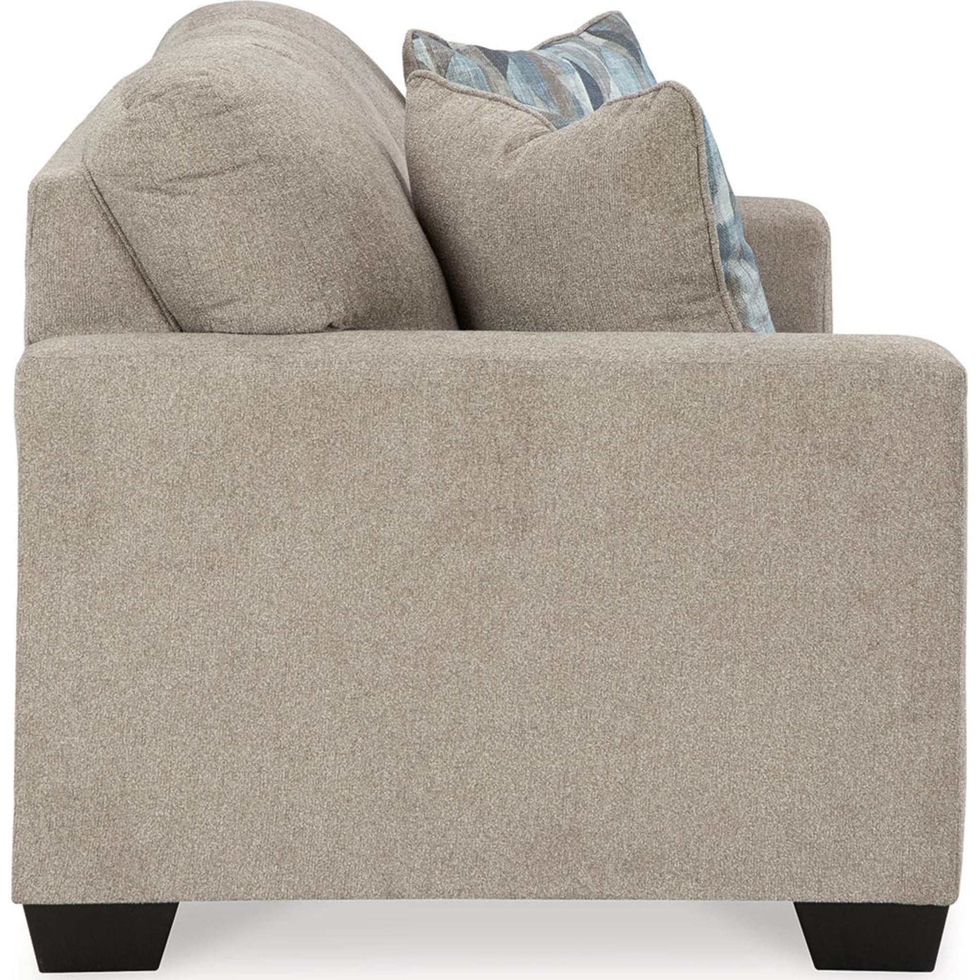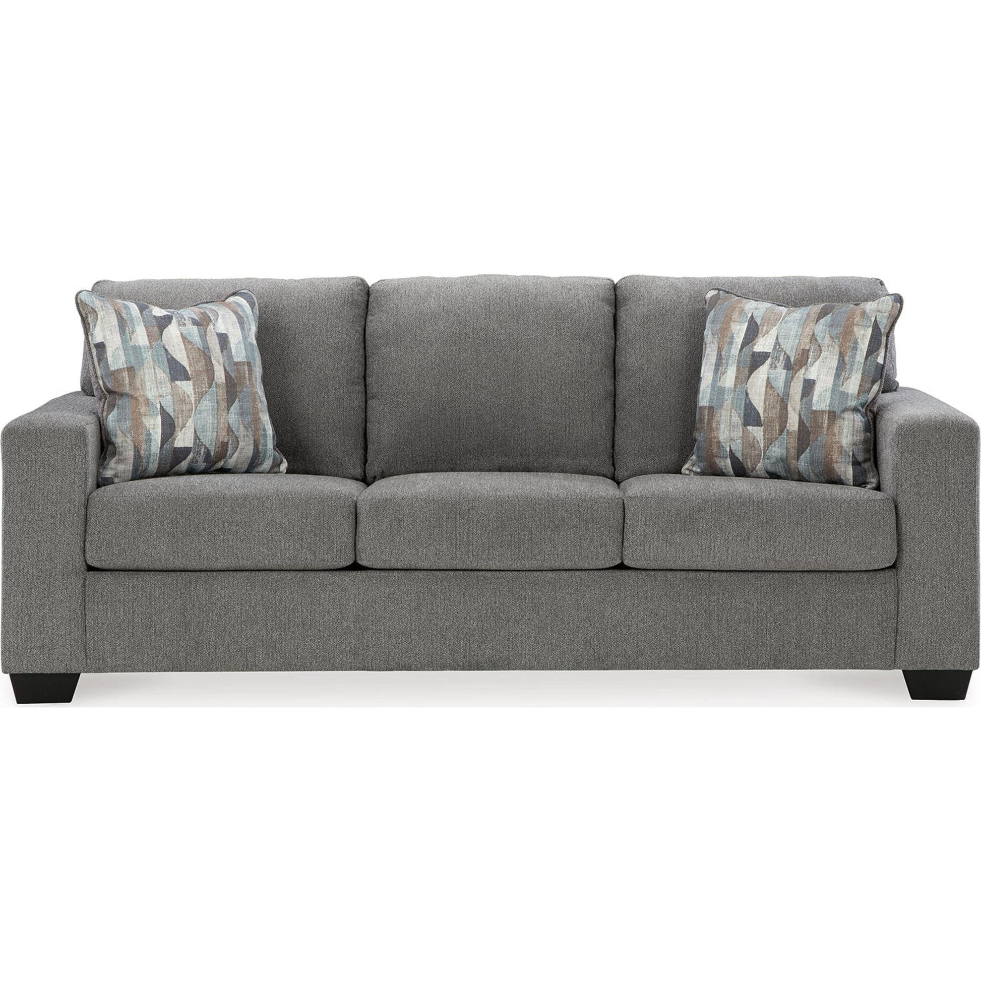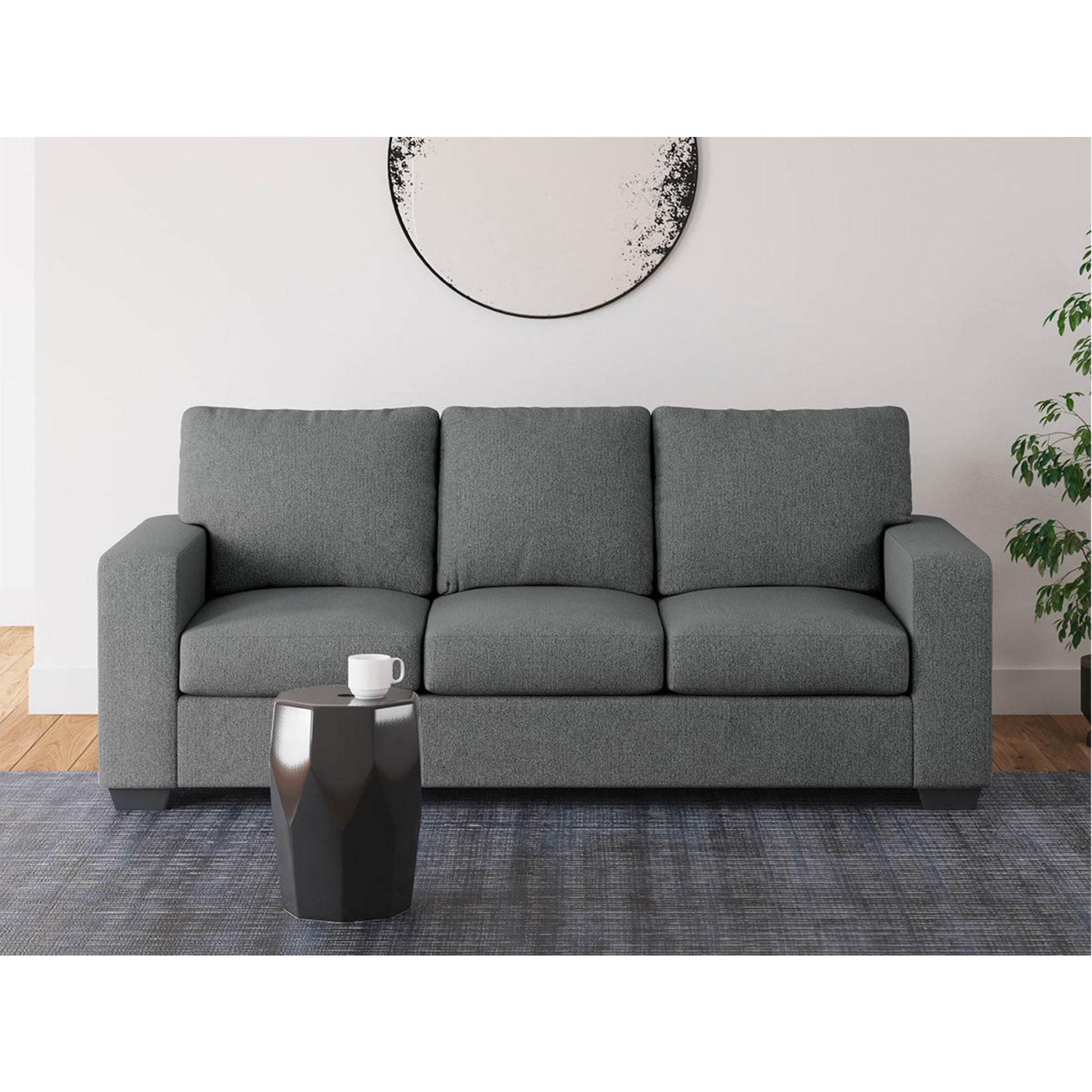 You’re in for a neat treat with this sofa. Its comfy seats are covered in soft, textural upholstery, and the wide track arms are eager to support your quest for total relaxation. Distressed abstract toss pillows bring a fresh breath of contemporary style while accentuating the sofa's color.