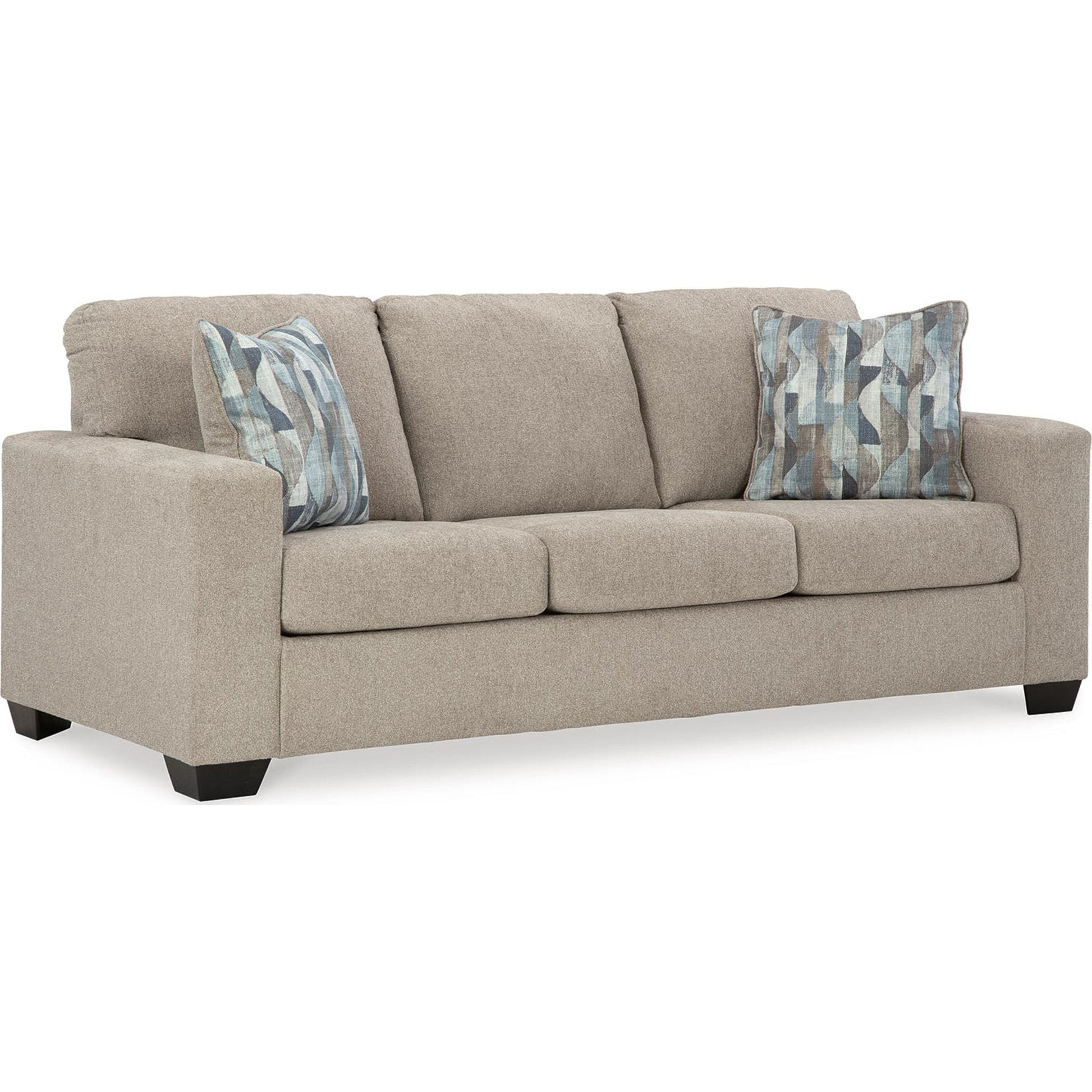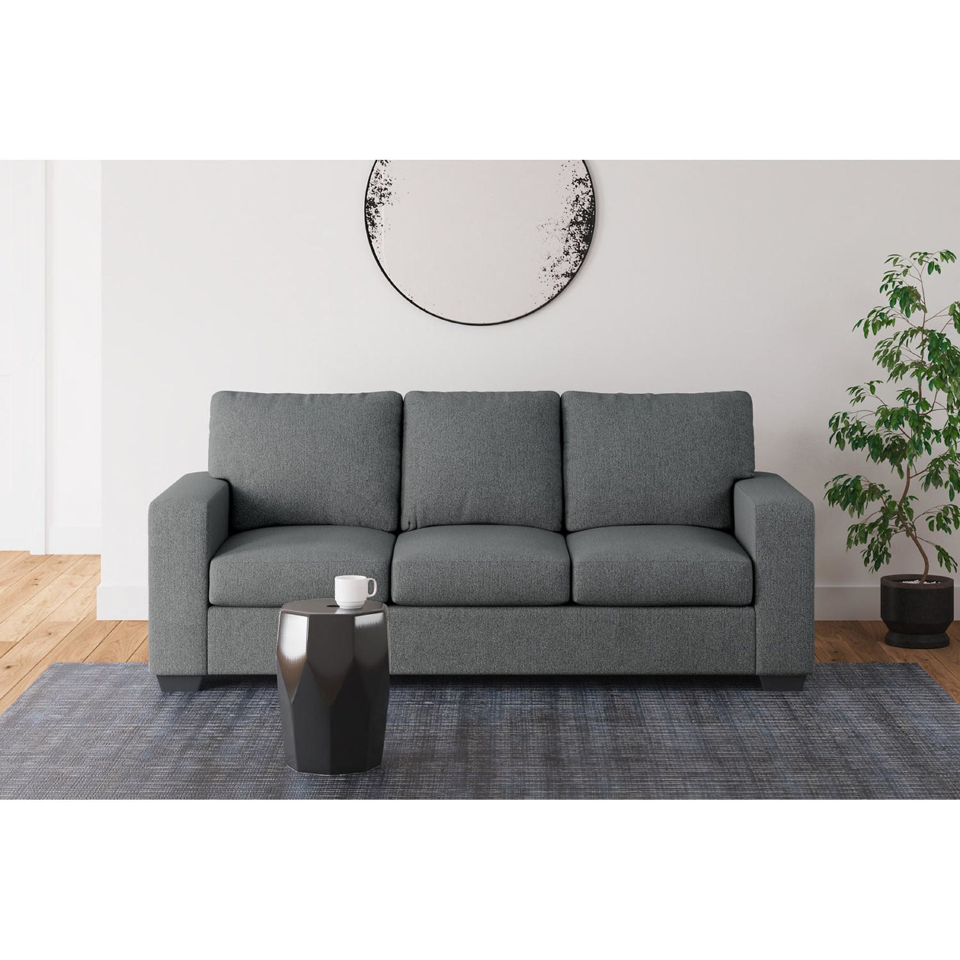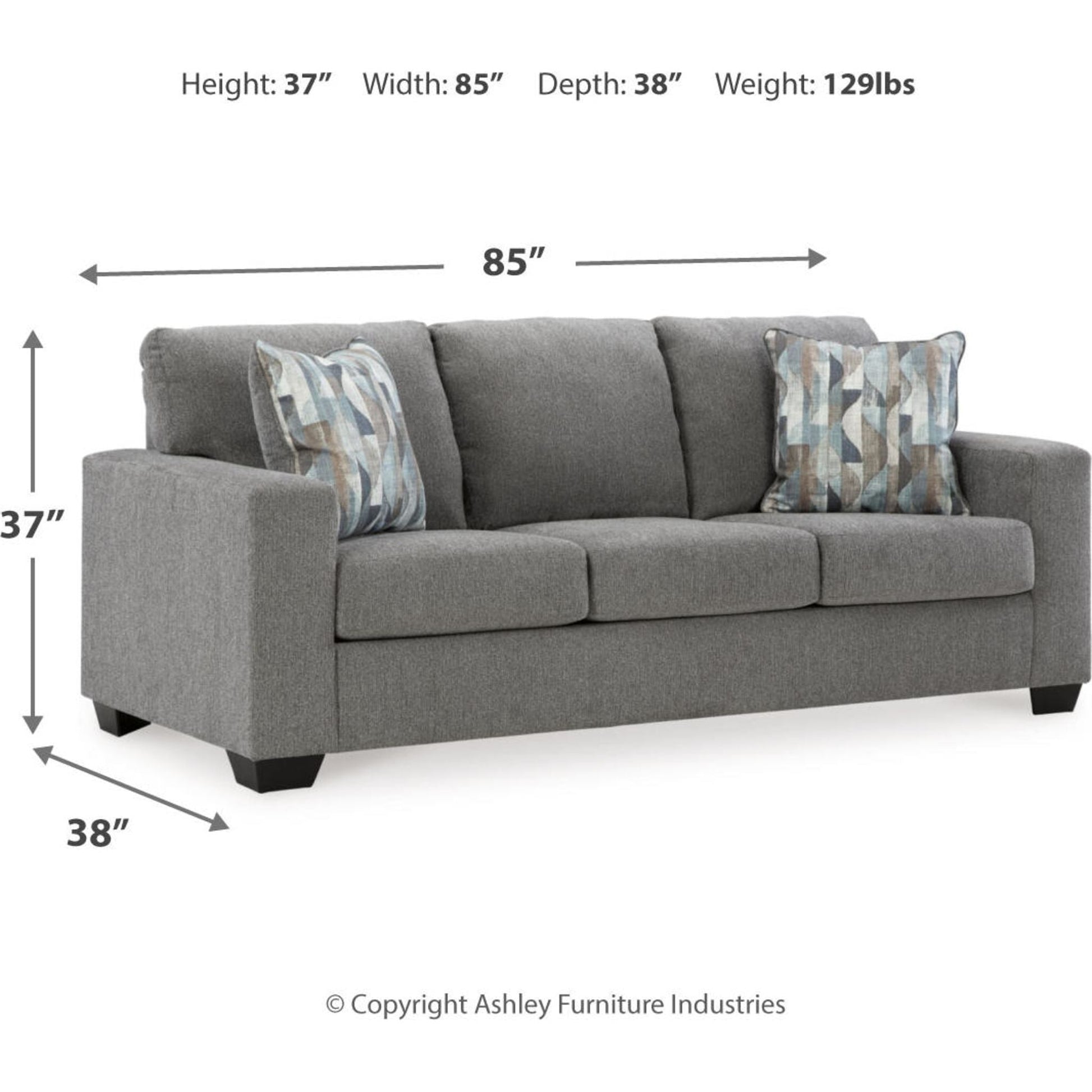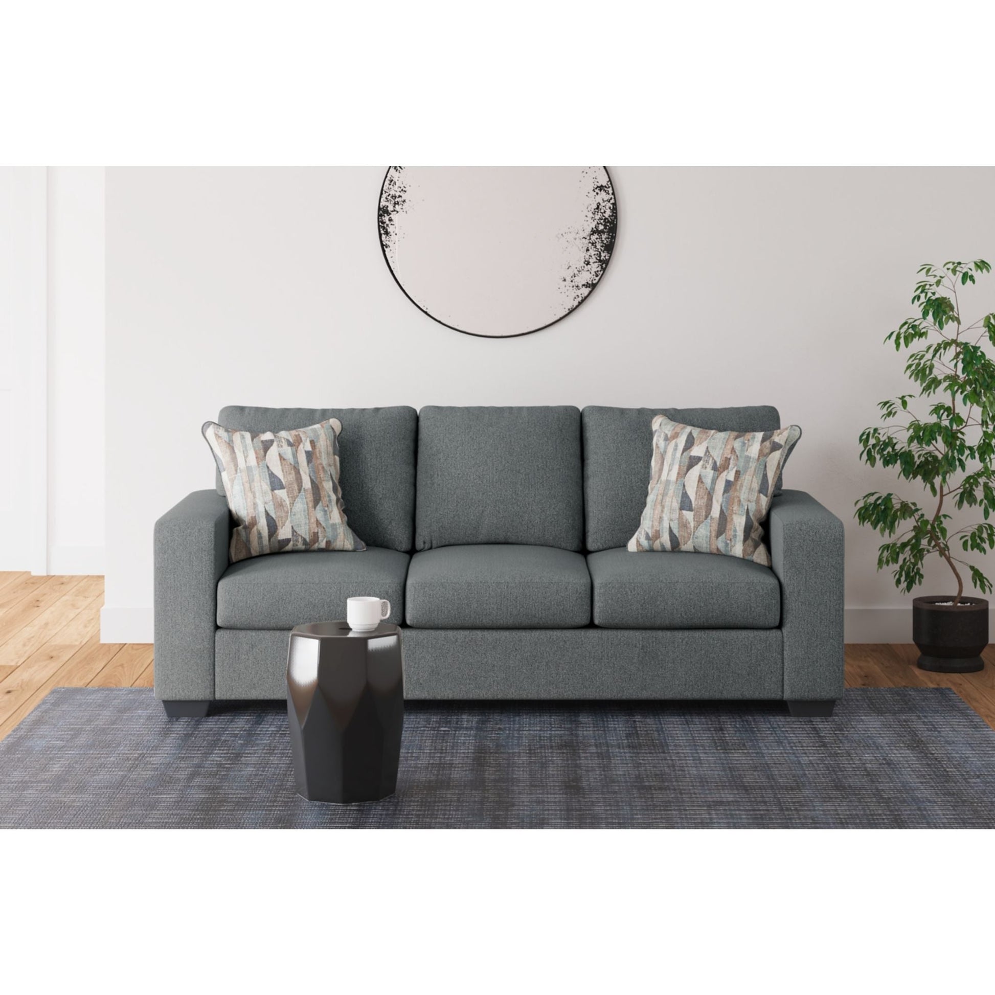 You’re in for a neat treat with this sofa. Its comfy seats are covered in soft, textural upholstery, and the wide track arms are eager to support your quest for total relaxation. Distressed abstract toss pillows bring a fresh breath of contemporary style while accentuating the sofa's color.