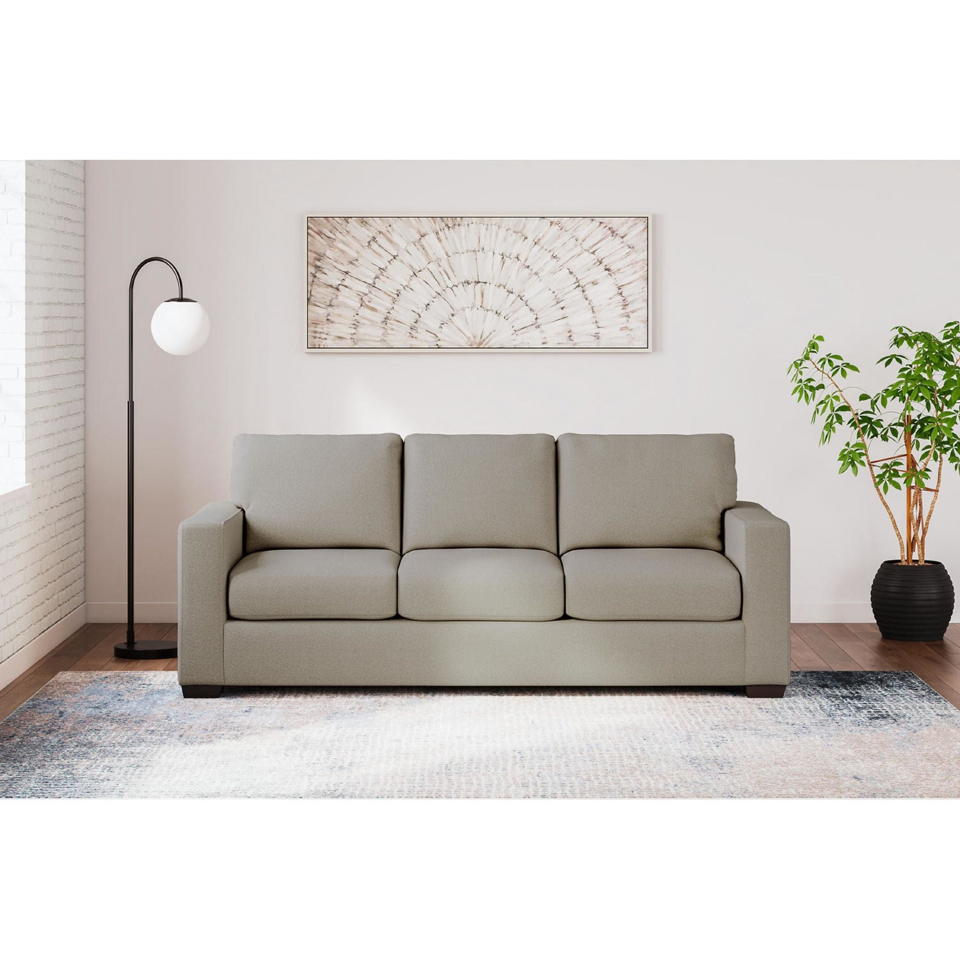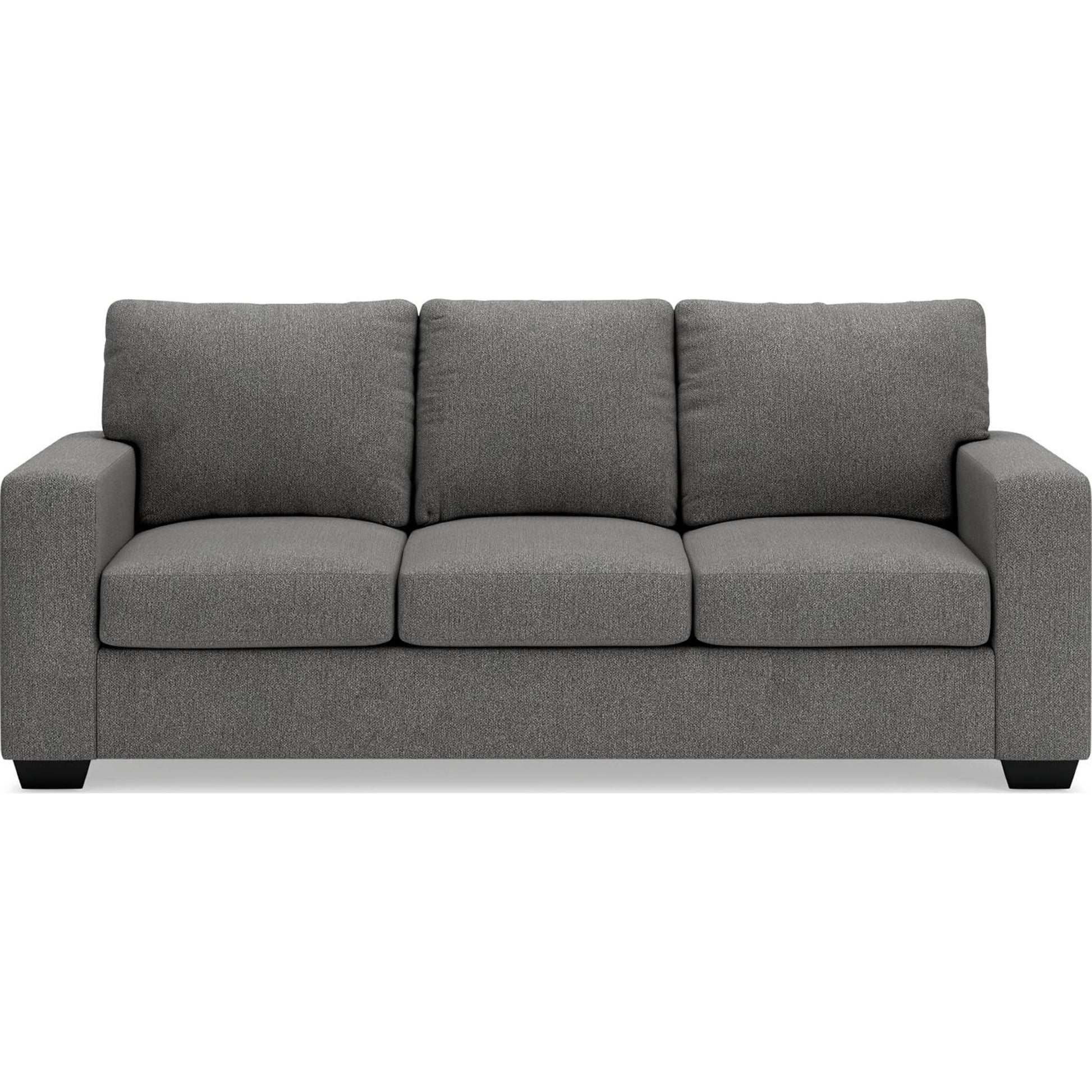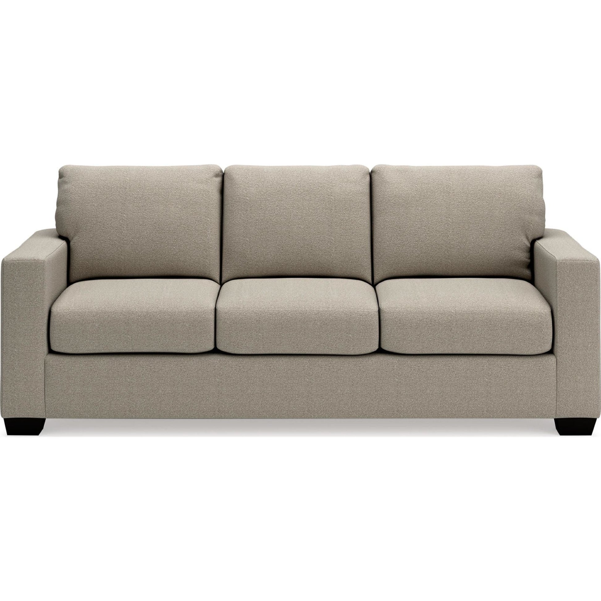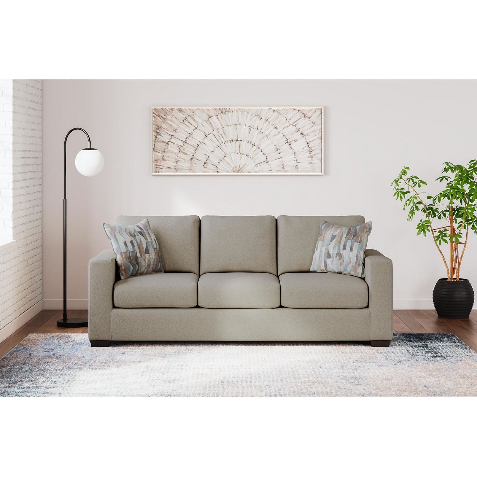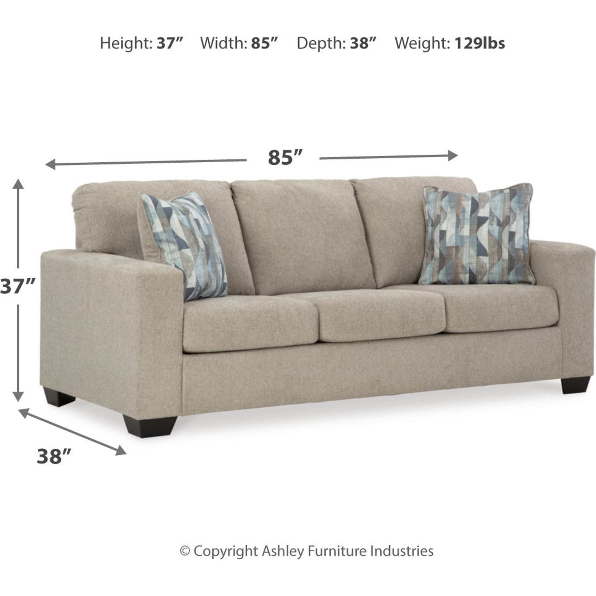 You’re in for a neat treat with this sofa. Its comfy seats are covered in soft, textural upholstery, and the wide track arms are eager to support your quest for total relaxation. Distressed abstract toss pillows bring a fresh breath of contemporary style while accentuating the sofa's color.