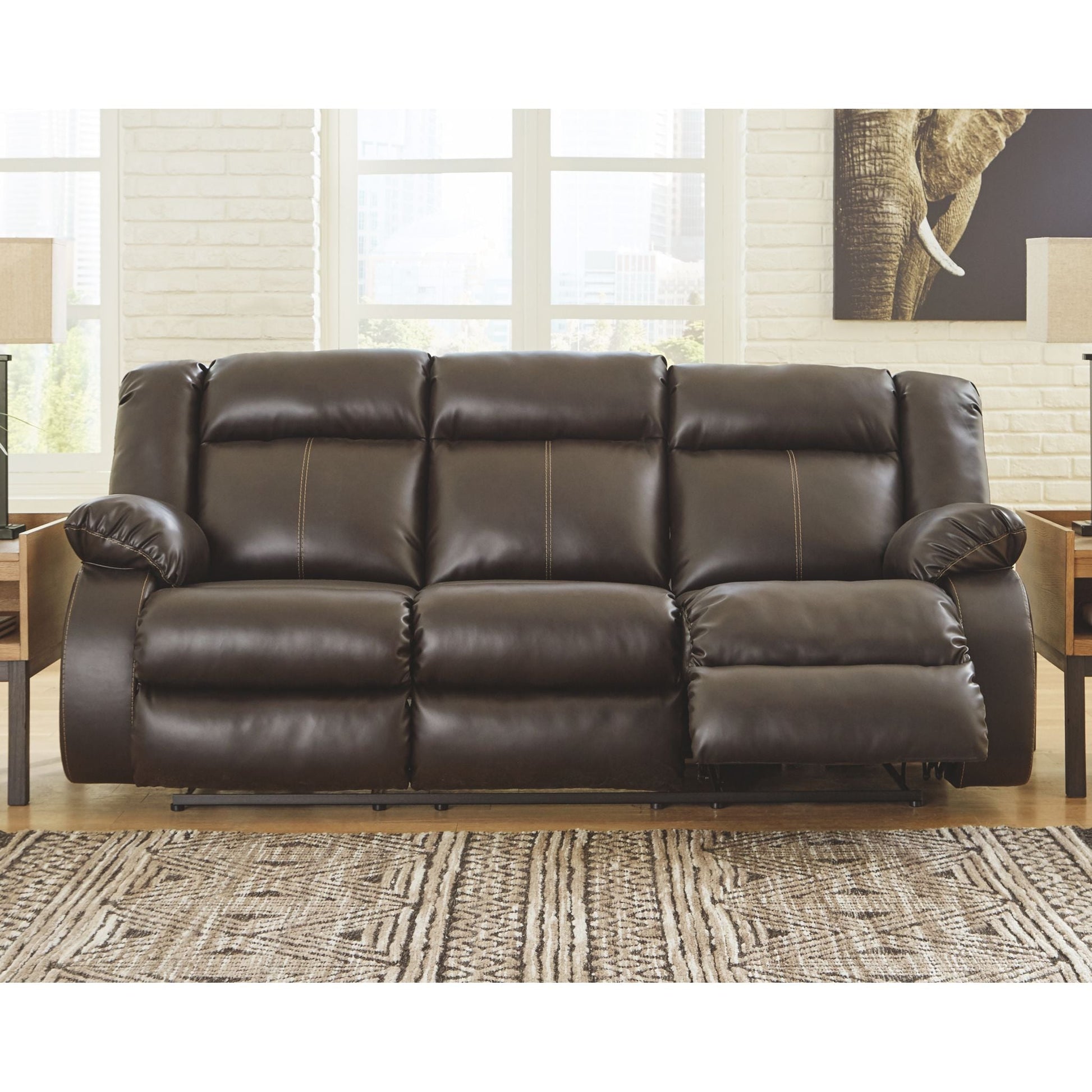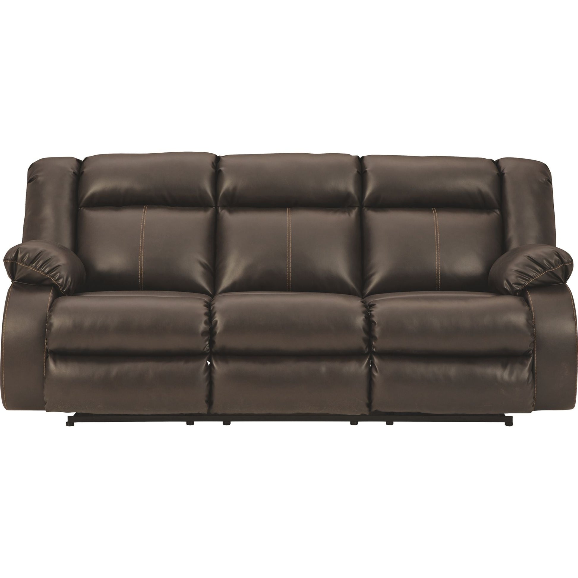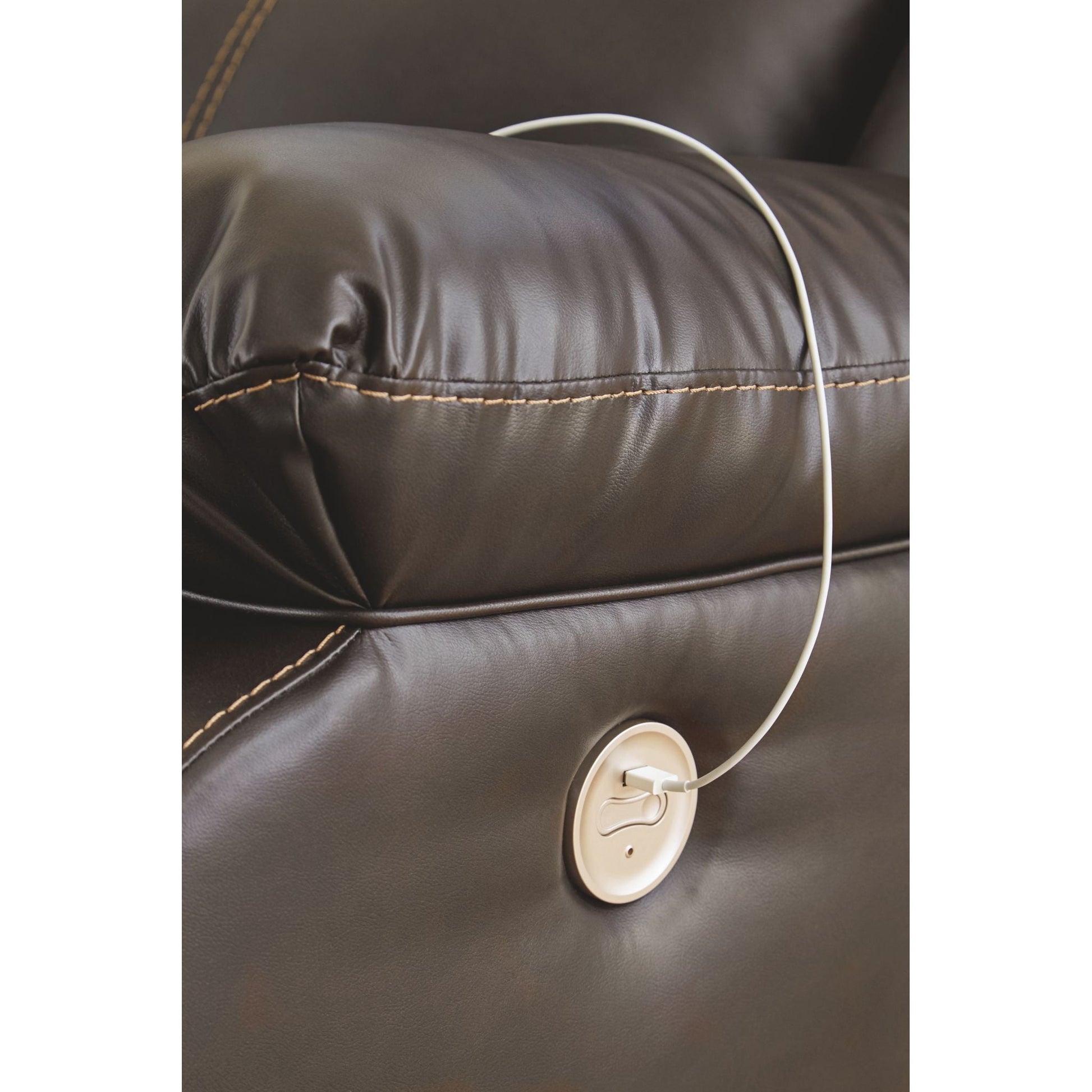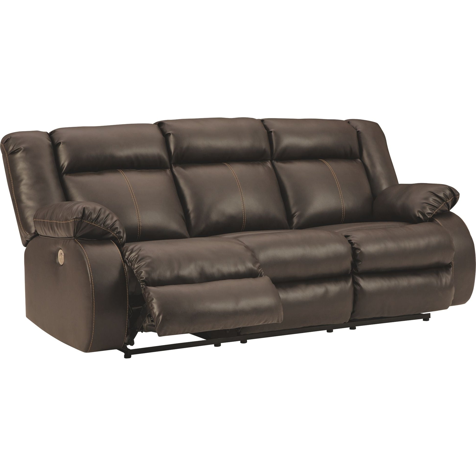 If highly contemporary looks and a heavenly feel sit well with you, rest your eyes on this reclining power sofa. Decadently soft, the easy-care faux leather upholstery is enriched with jumbo contrast stitching and dramatic cut-and-sew lines for fashion-forward flair. Radius cut arm frame adds cool, curvaceous interest. At your fingertips: one-touch power control with a zero-draw USB plug-in that’s not only convenient but also energy efficient. When it comes to high style at a down-to-earth price, this power reclining sofa really brings it home.