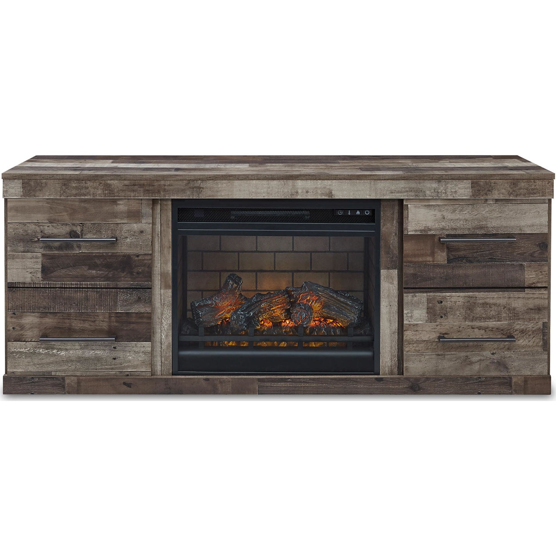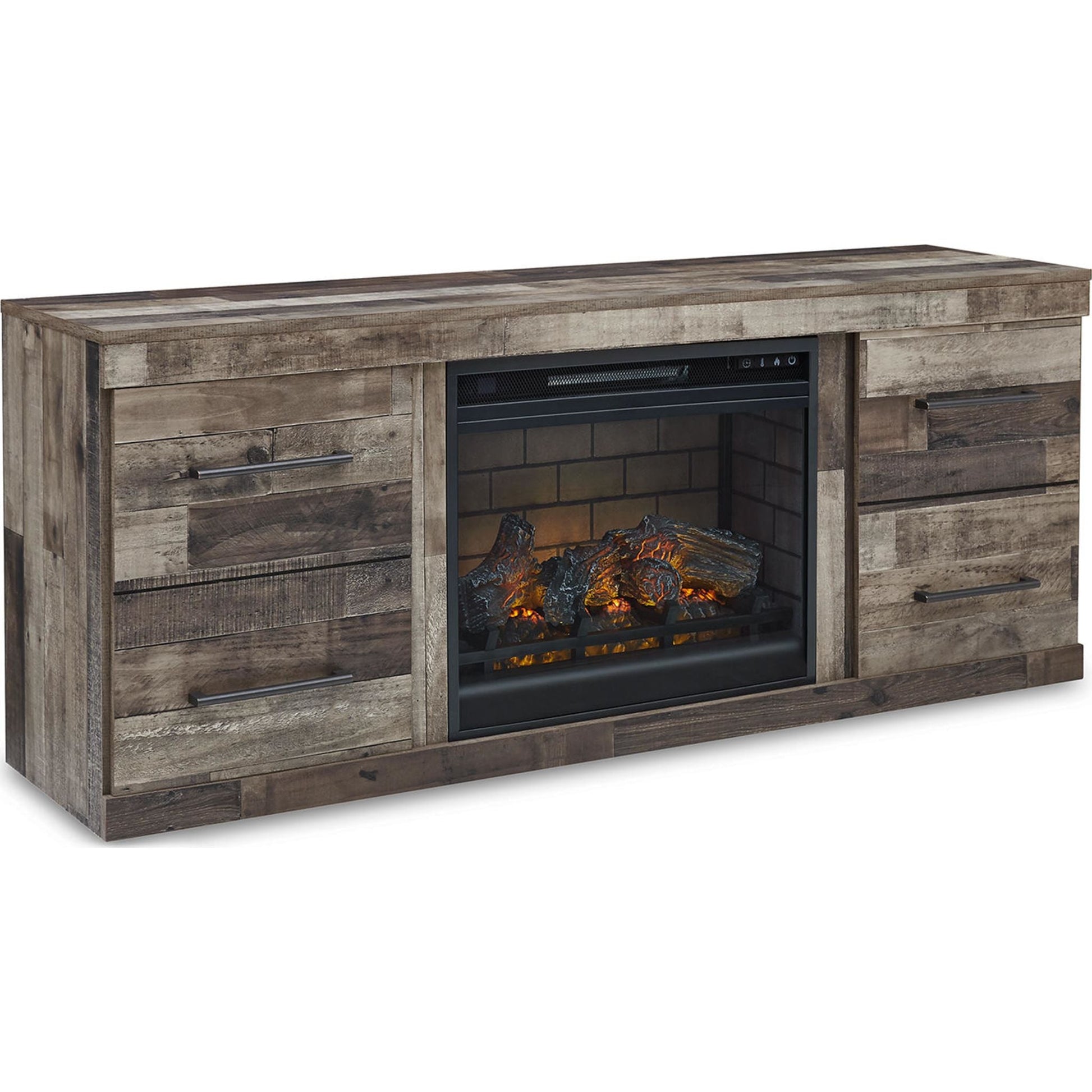Make this TV stand with LED fireplace insert the center of attention with its popular urban eclectic style. Its rustic finish over a replicated pine grain creates an authentic natural look for your home entertainment area. You'll love its functionality. Two spacious cabinets with shelved storage easily accommodate media needs. What really turns up the heat: an electric infrared fireplace insert with faux firebrick surround that operates with or without infrared heat. With the touch of a button, adjust the temperature and the flame brightness, and set the timer for long-lasting enjoyment.