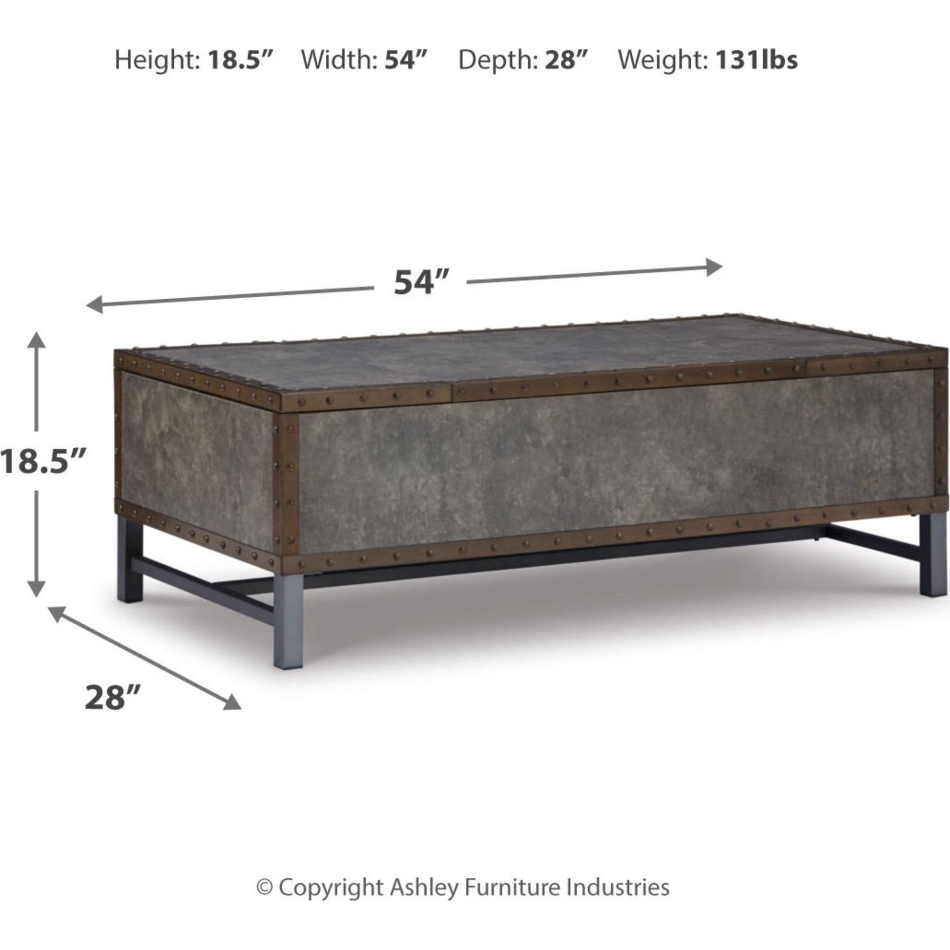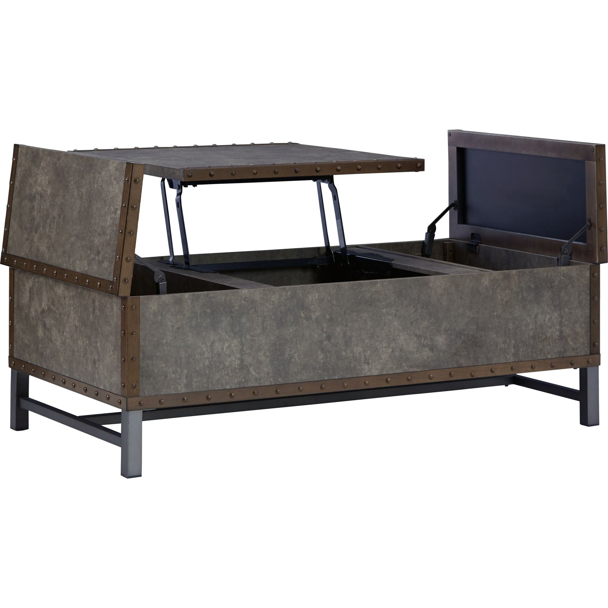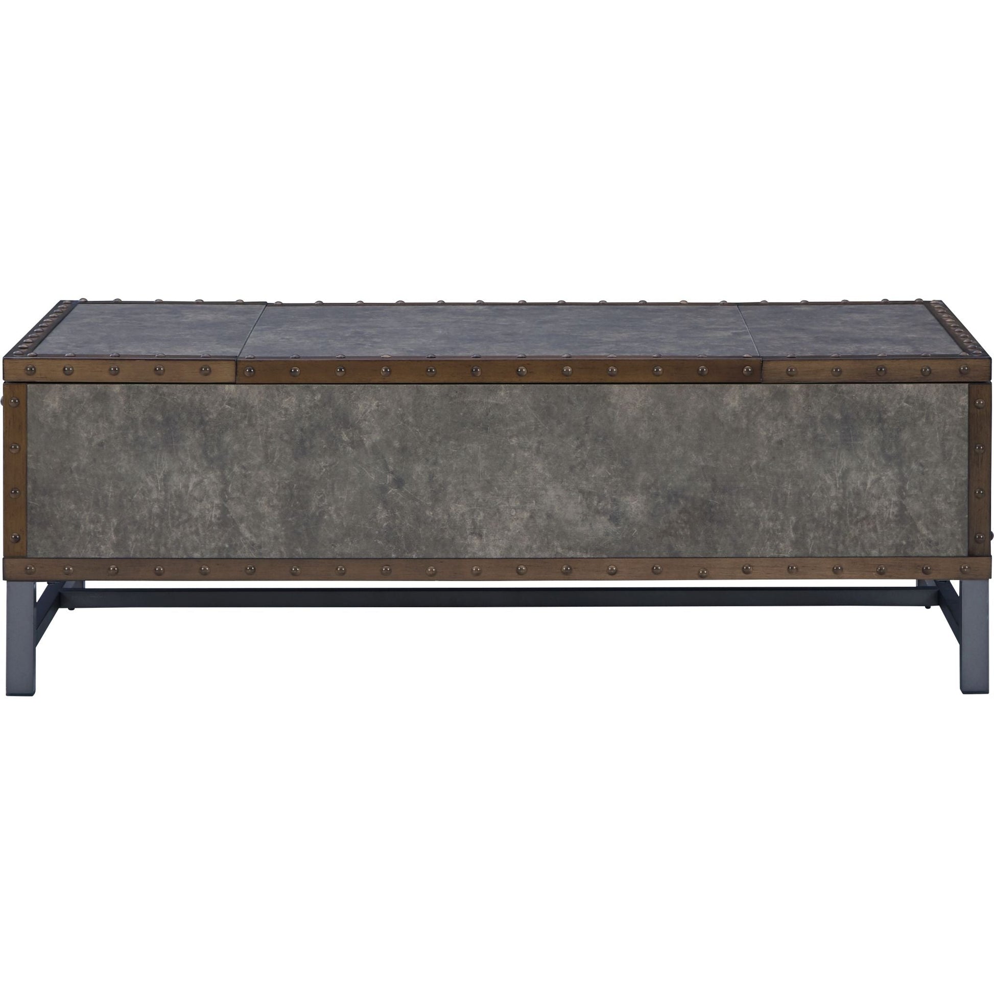 Reinvented for the here and now, this lift-top coffee table rocks vintage industrial design with a traditional vibe. Its metal accent trim and bronze-tone metal base frame are ready to embrace the modern demands of everyday life. Two spacious storage bins provide additional storage, while the center lift top transforms into a casual work center or extra dining space when needed.