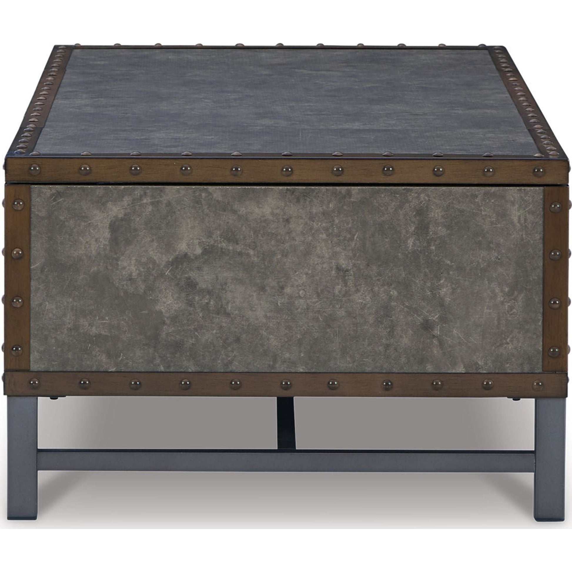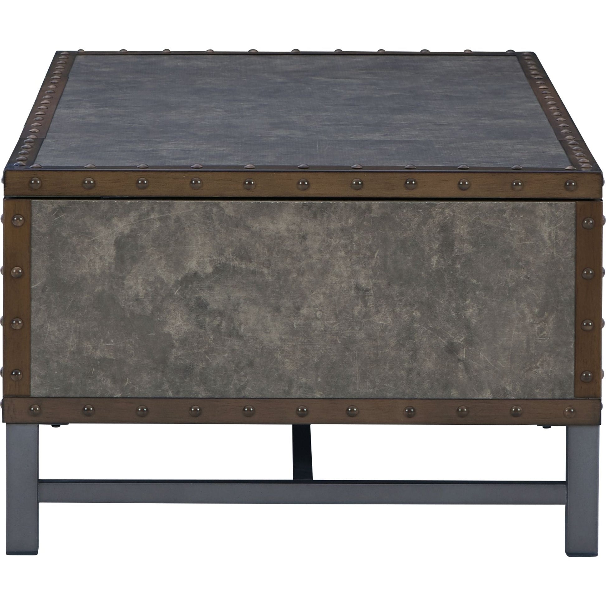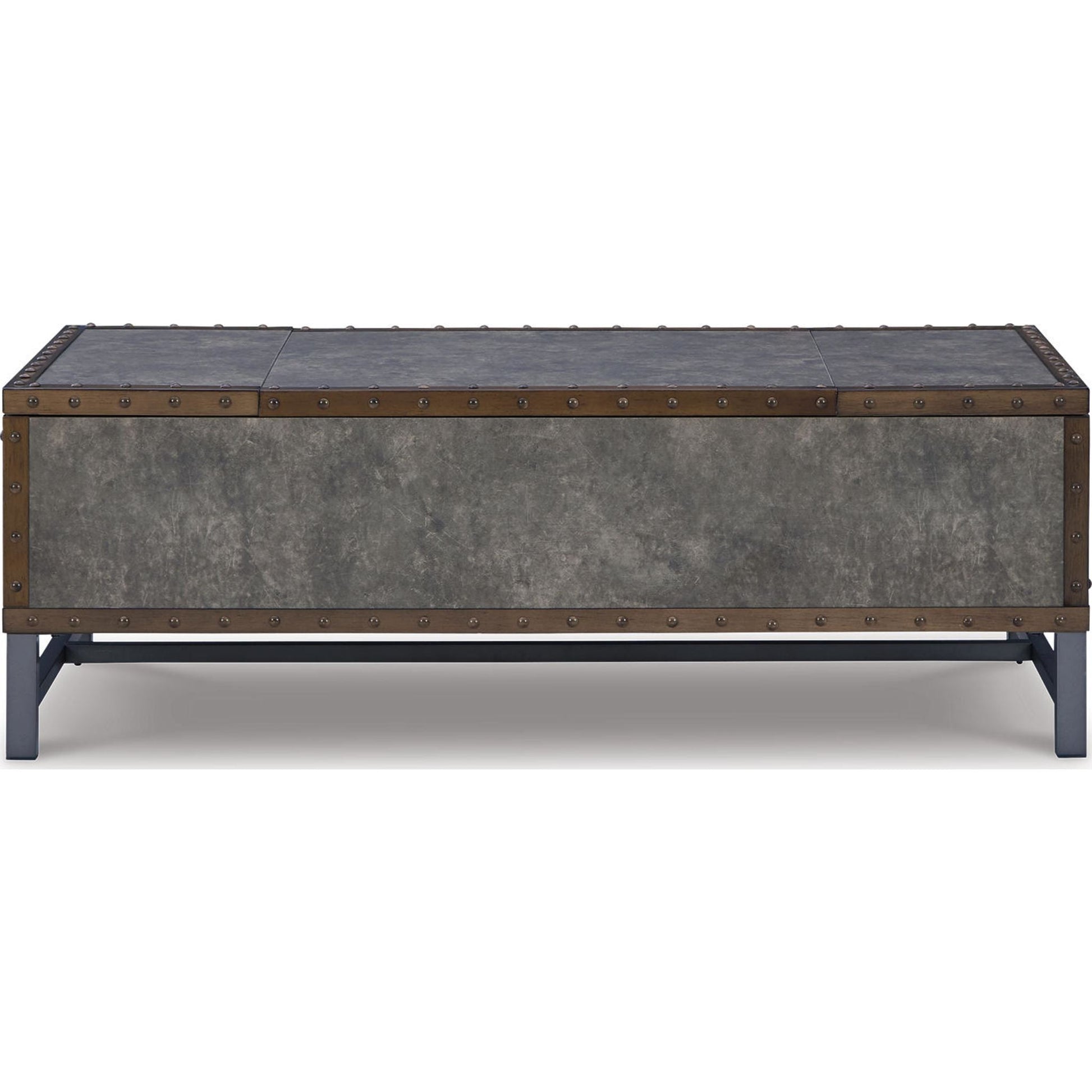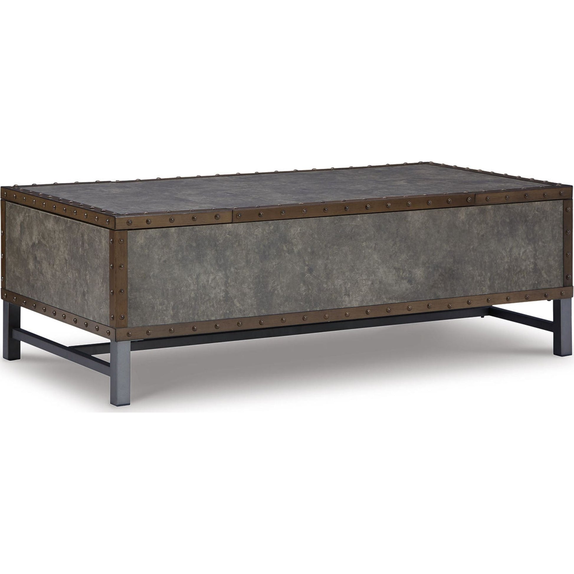 Reinvented for the here and now, this lift-top coffee table rocks vintage industrial design with a traditional vibe. Its metal accent trim and bronze-tone metal base frame are ready to embrace the modern demands of everyday life. Two spacious storage bins provide additional storage, while the center lift top transforms into a casual work center or extra dining space when needed.