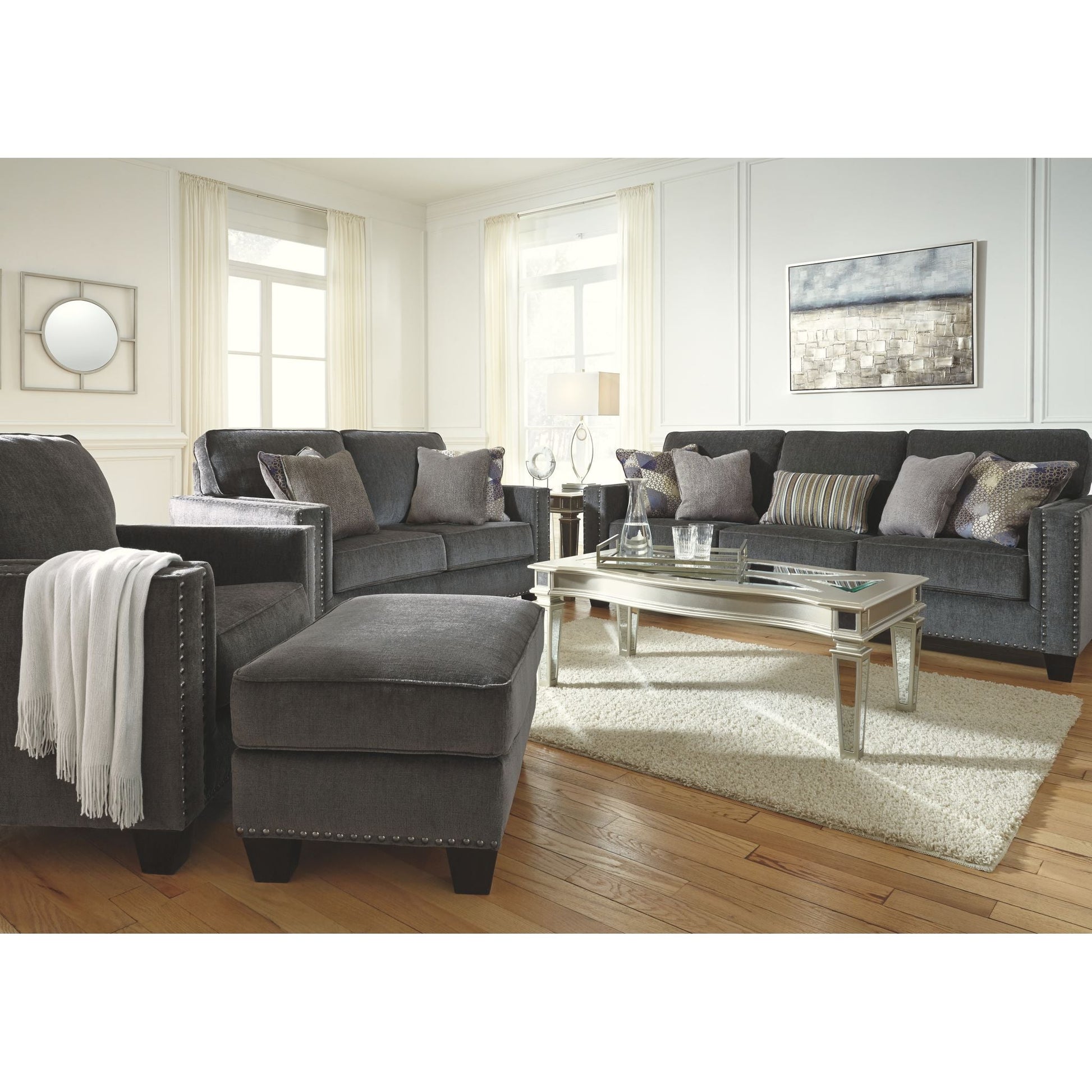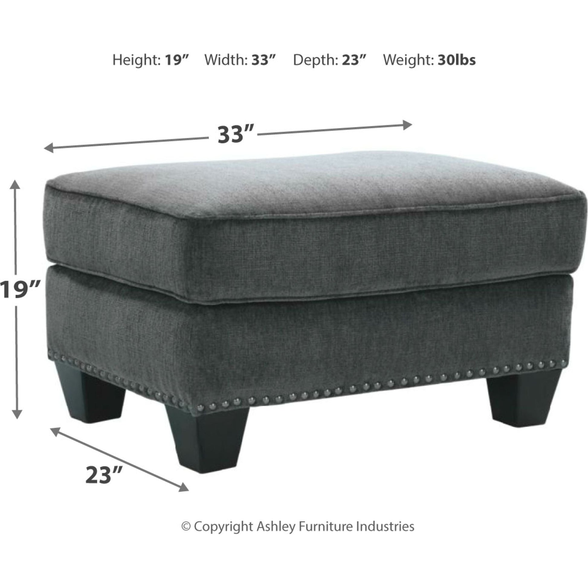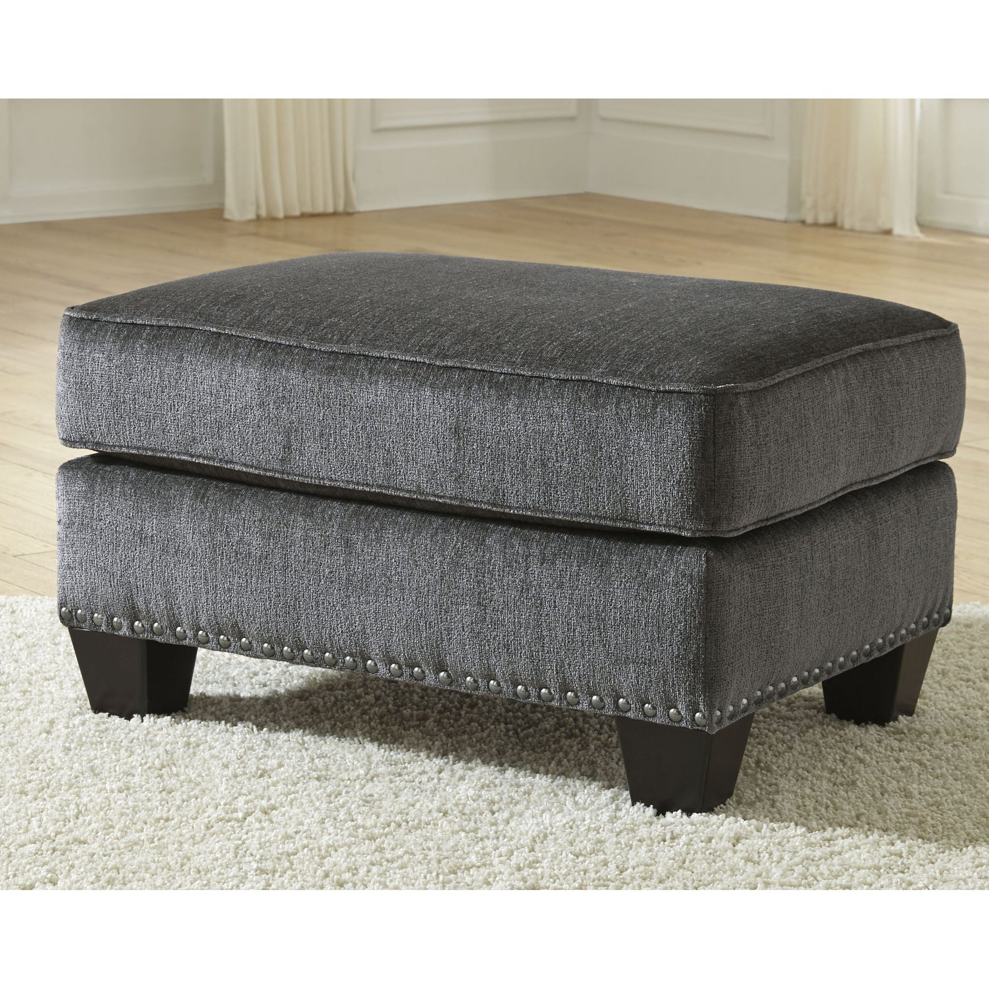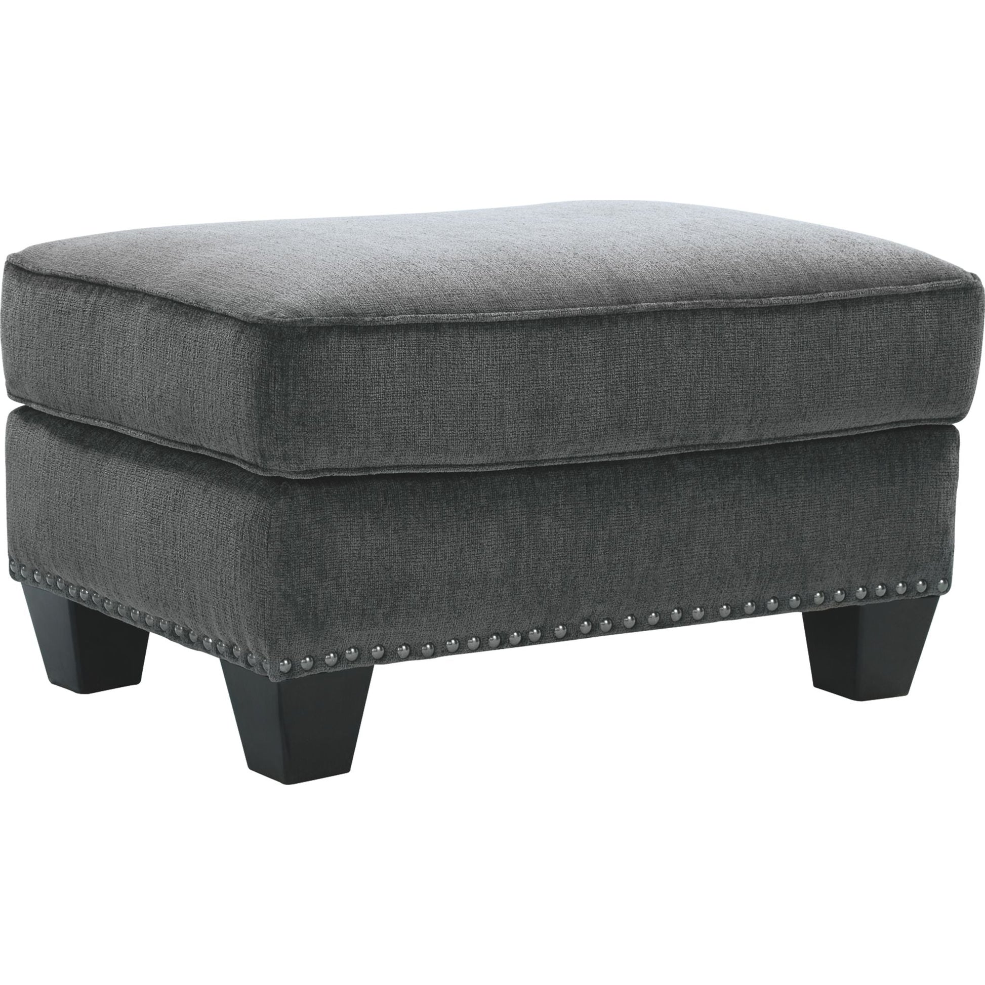 Time to go gray? Find your fill of comfort, style and sophistication in this designer ottoman. Its smoky gray upholstery is sumptuously soft to the touch and beautifully on trend. Ultra clean lines punctuated with black nickel-tone nailhead trim give this gorgeous gray ottoman a cool, contemporary edge.