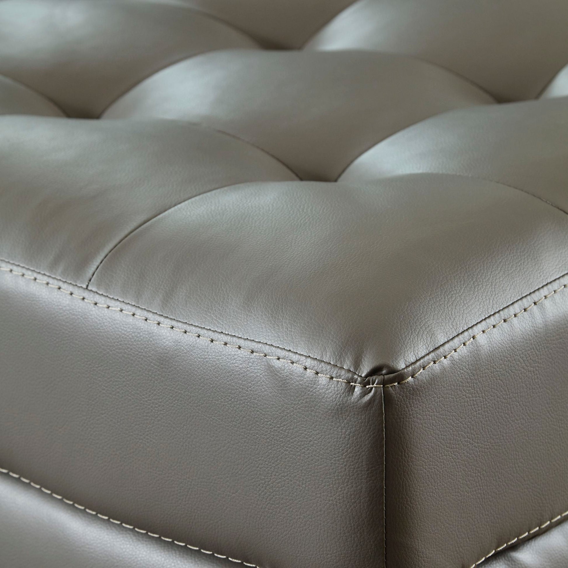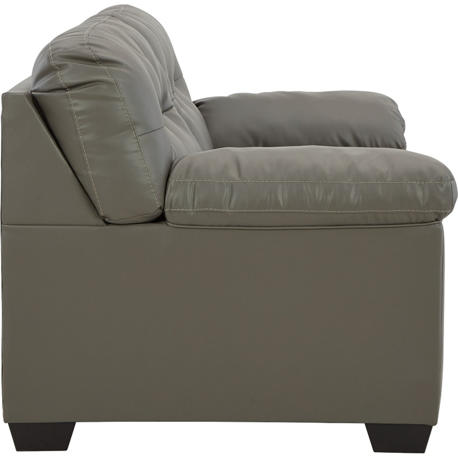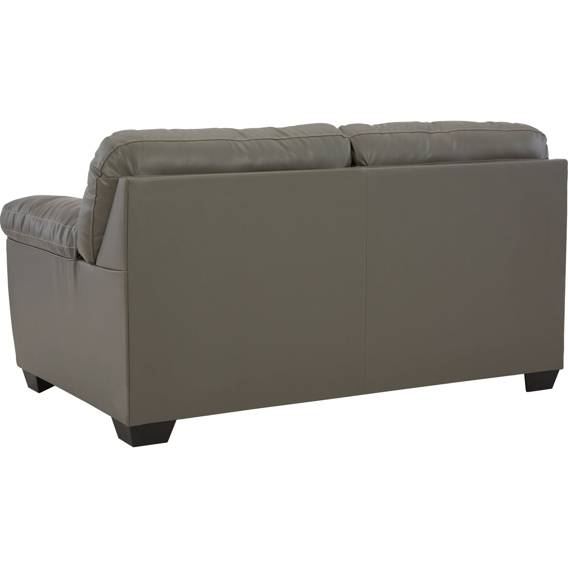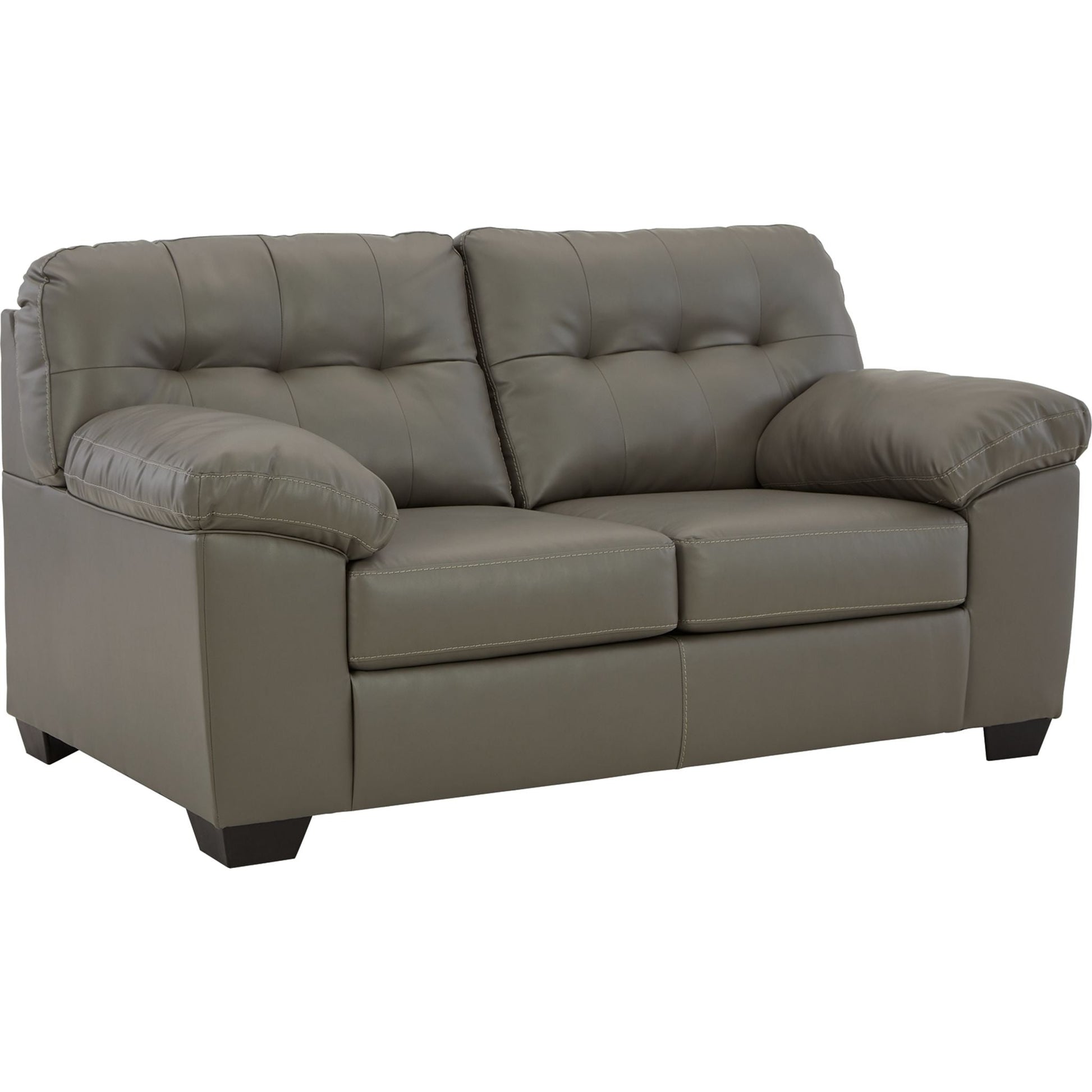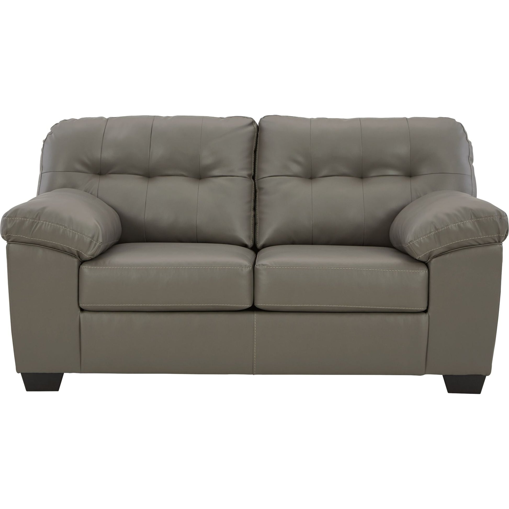 Dressed in glorious gray faux leather, this loveseat is certain to be the center of attention. With tasteful tufting, padded armrests and a sleek tapered design, it combines style and comfort. This loveseat's generous scale lets you kick back and relax at home solo or when hosting friends.