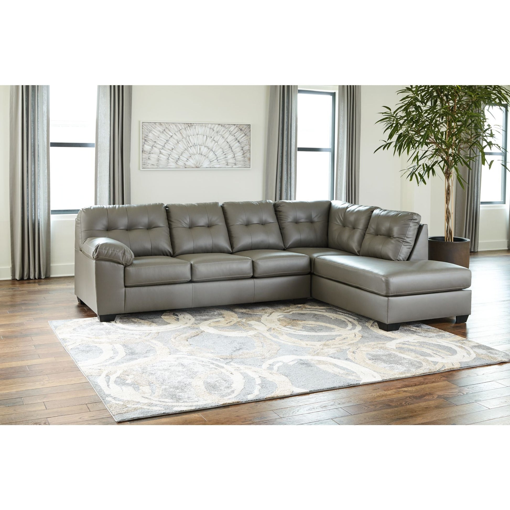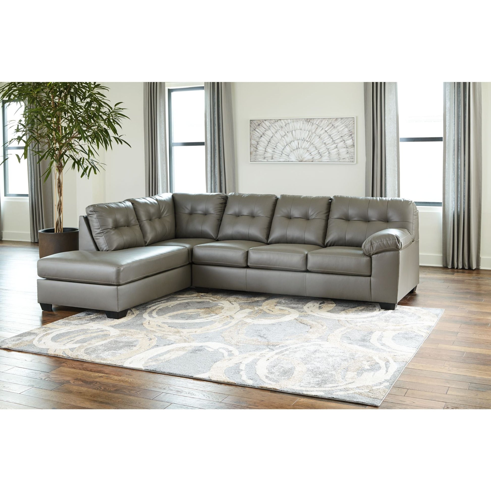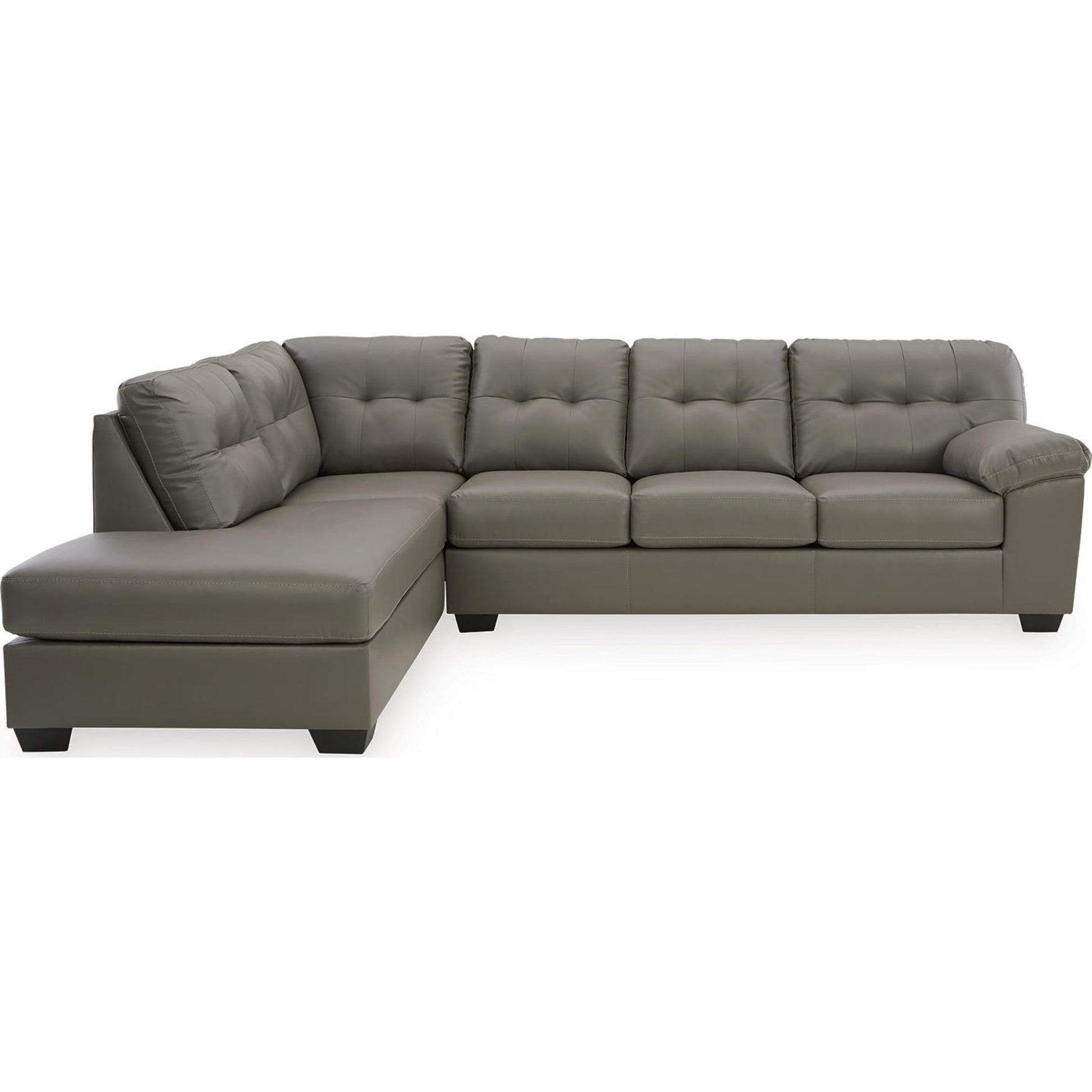 Dressed in glorious gray faux leather, this sectional is certain to be the center of attention. With tasteful tufting, padded armrests and a sleek tapered design, its generous scale lets you share the space with family or use it for entertaining when friends drop in.