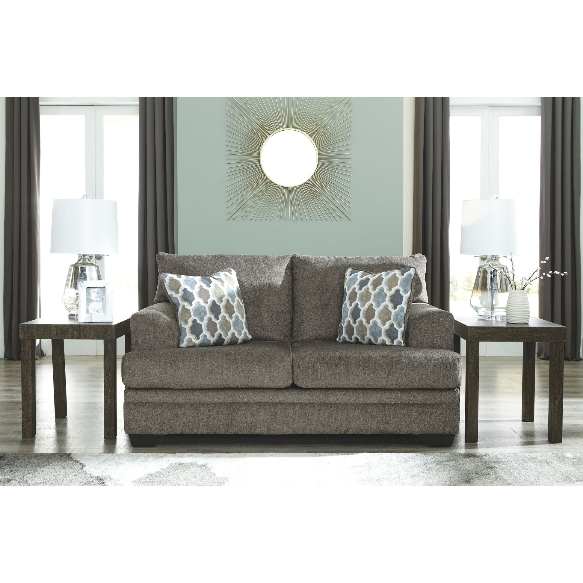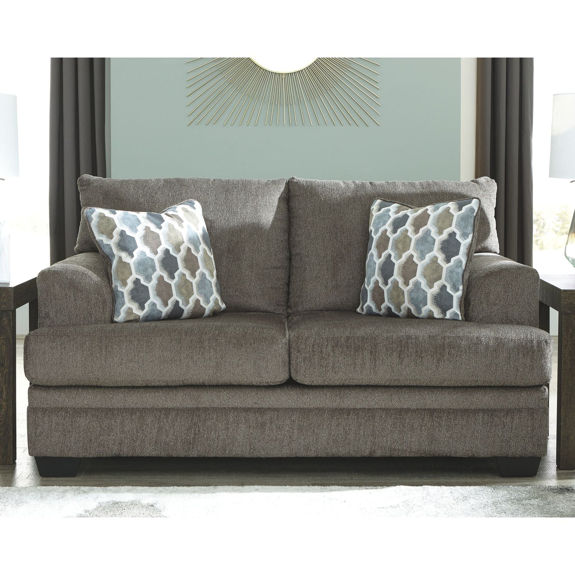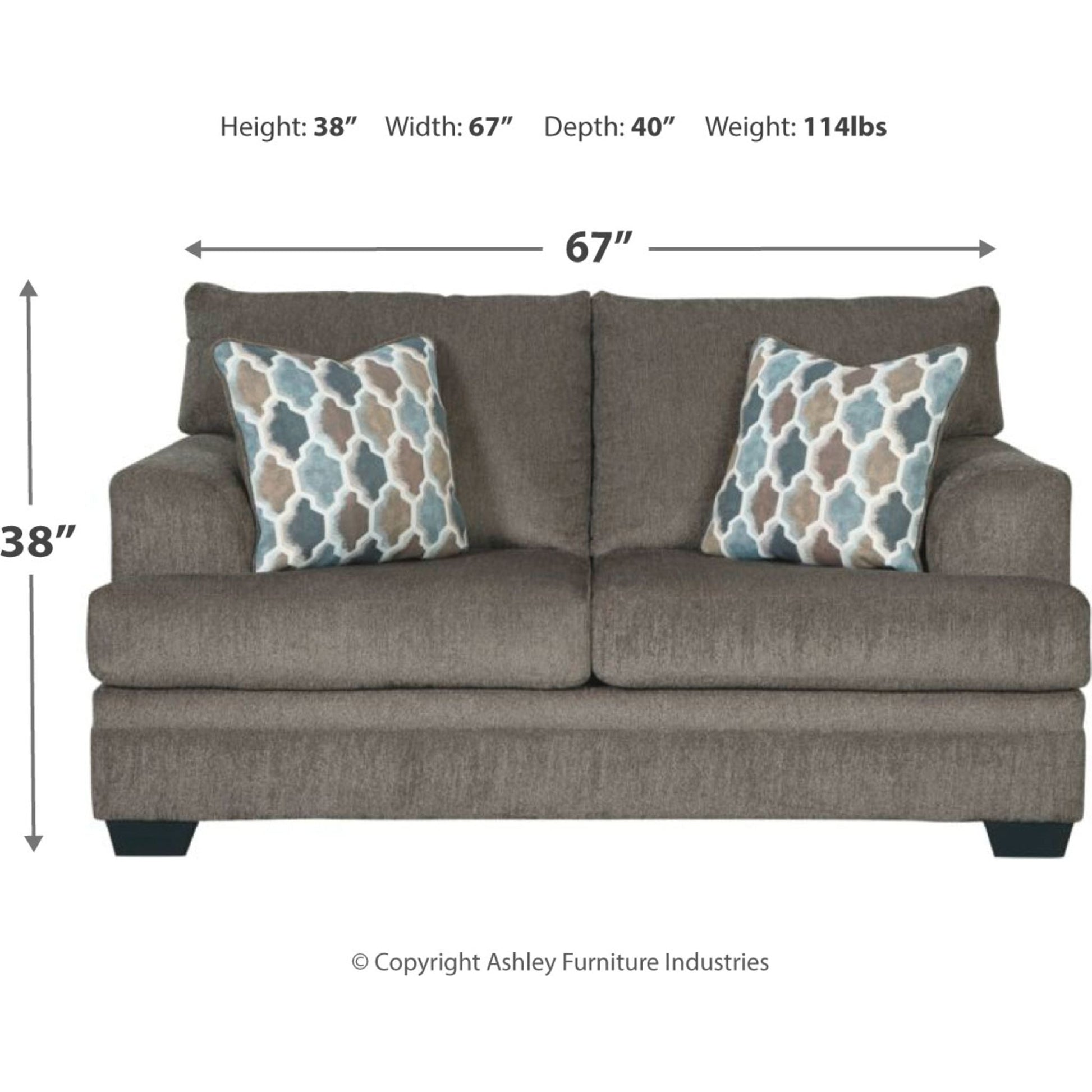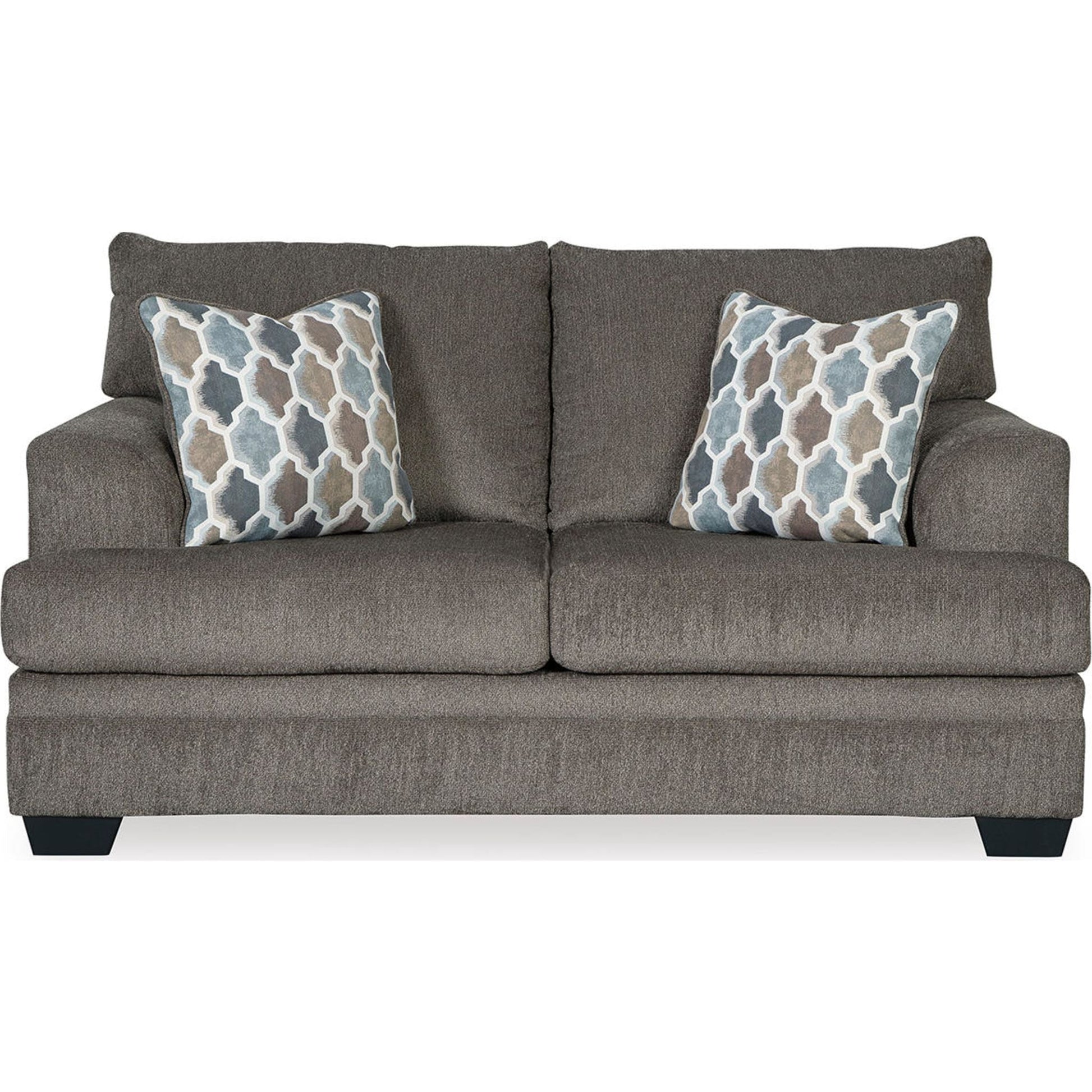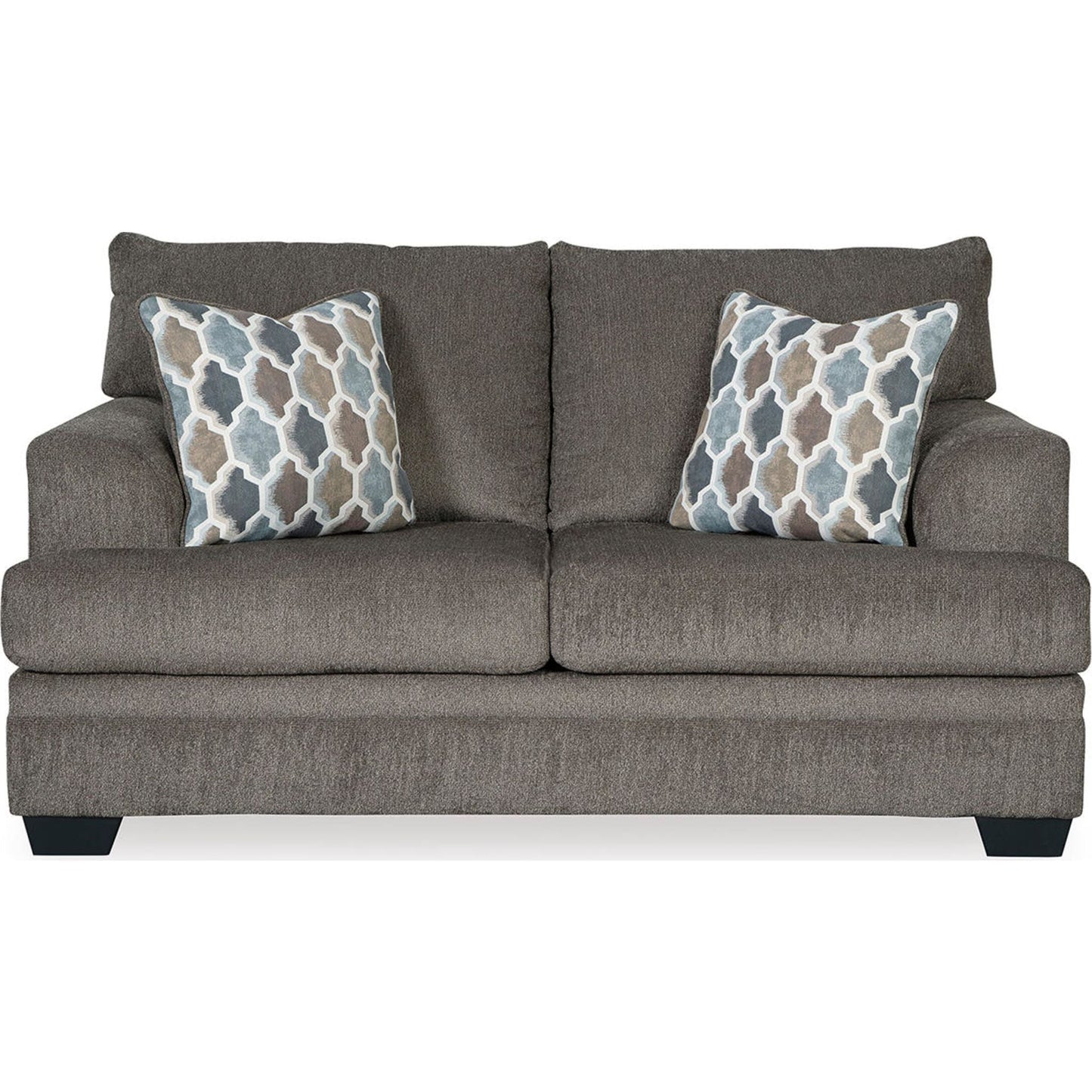 This contemporary loveseat has comfort written all over it. From the plush cushions to the textured gray fabric, it’s a total winner for relaxation. The patterned throw pillows in blue, brown and tan complement the richly neutral upholstery.