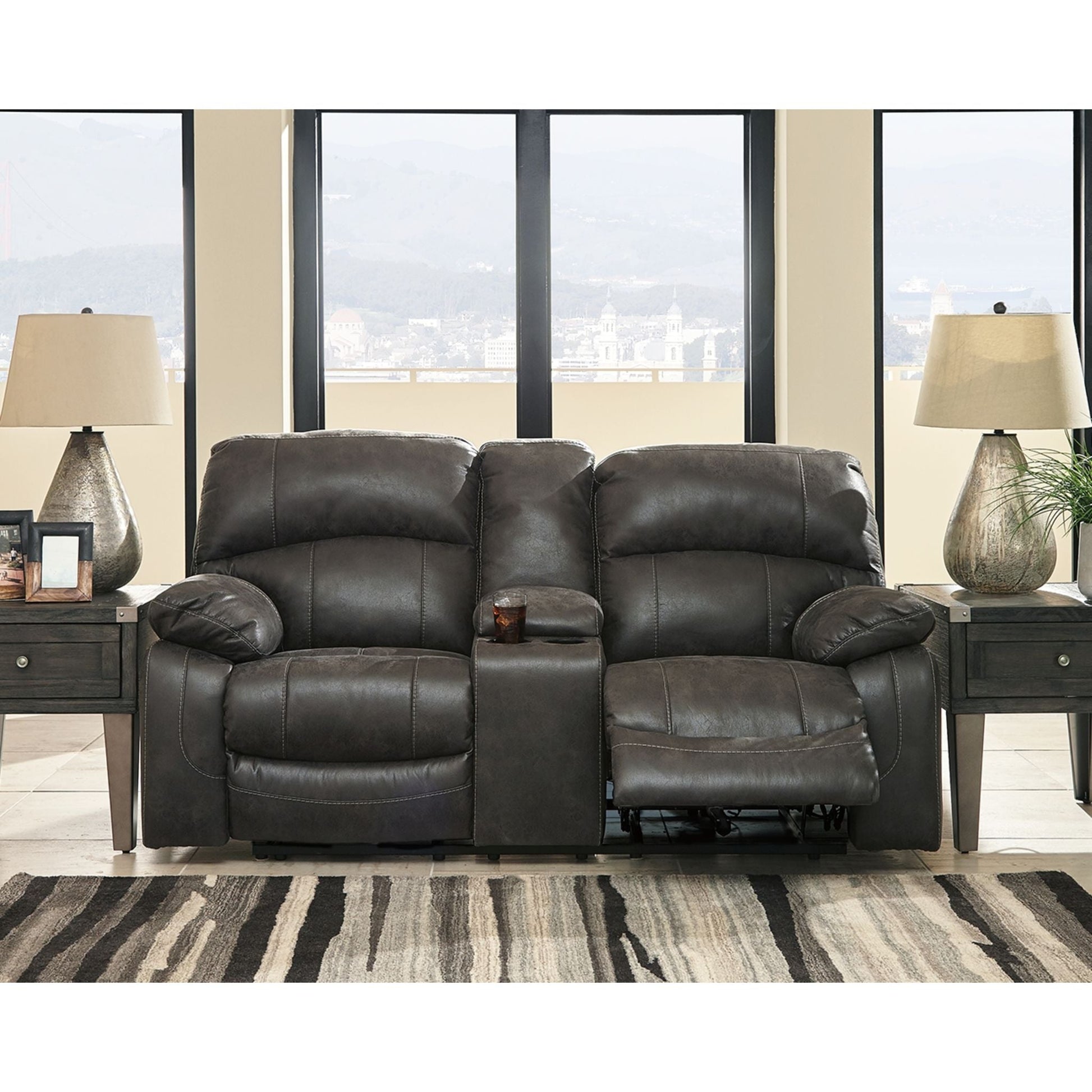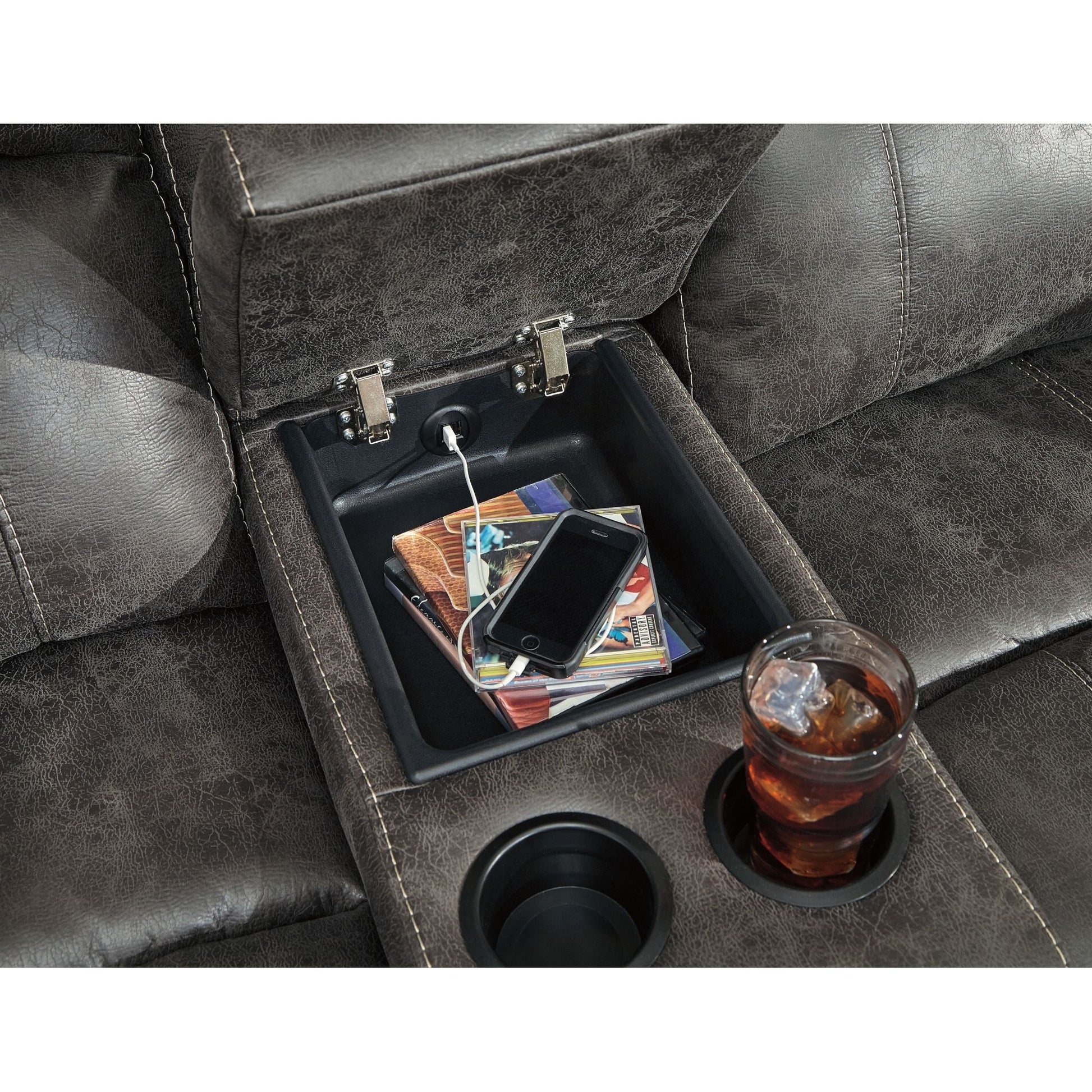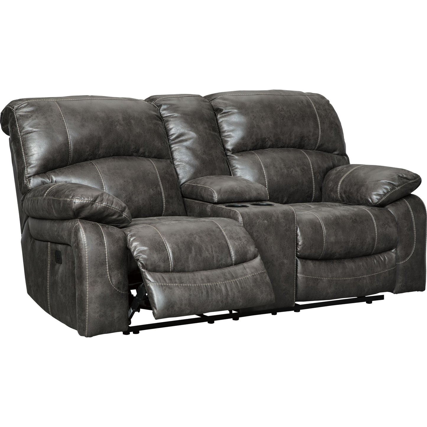 There is power in beauty with this power reclining loveseat. Handsome crackle effect in the upholstery gives the appearance of supple leather but this recliner is all about the warmth of fabric. Contrast jumbo stitching adds a stylish touch. Double stuffed armrests cuff your body in comfort. Adjust your head and recline back with one easy touch. Dual-sided recliner; middle seat remains stationary.
