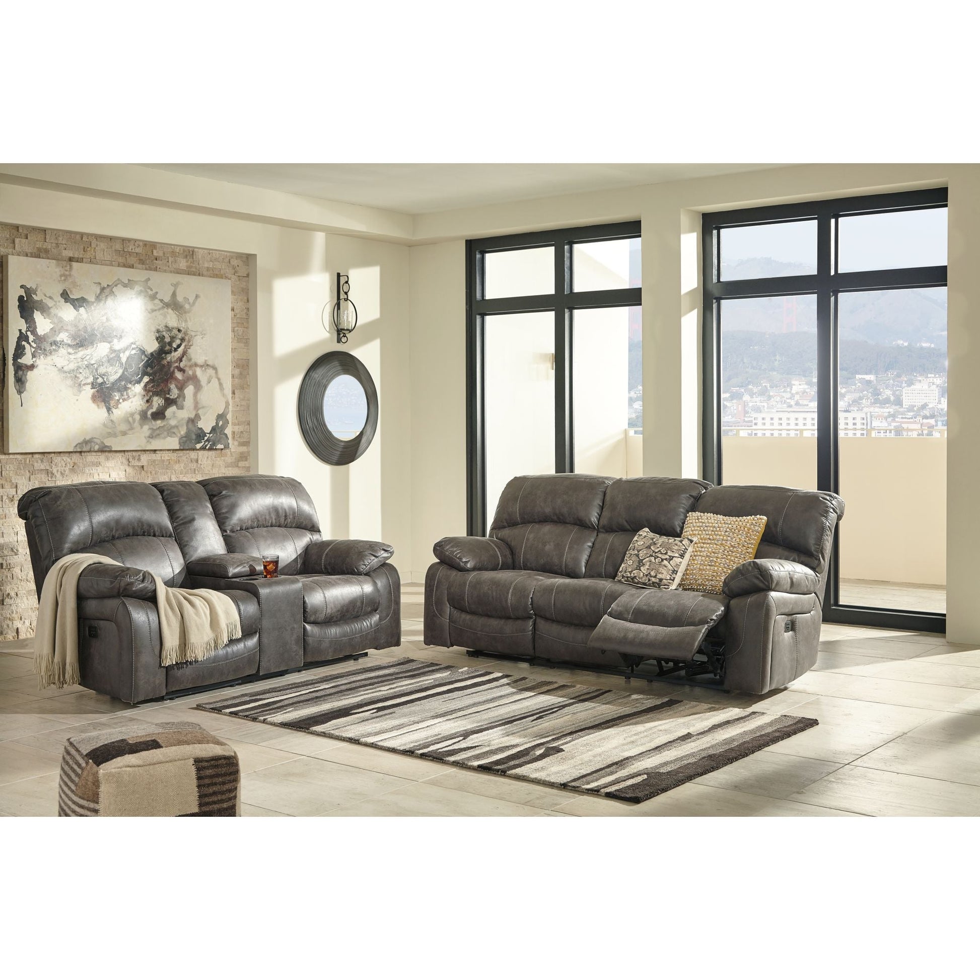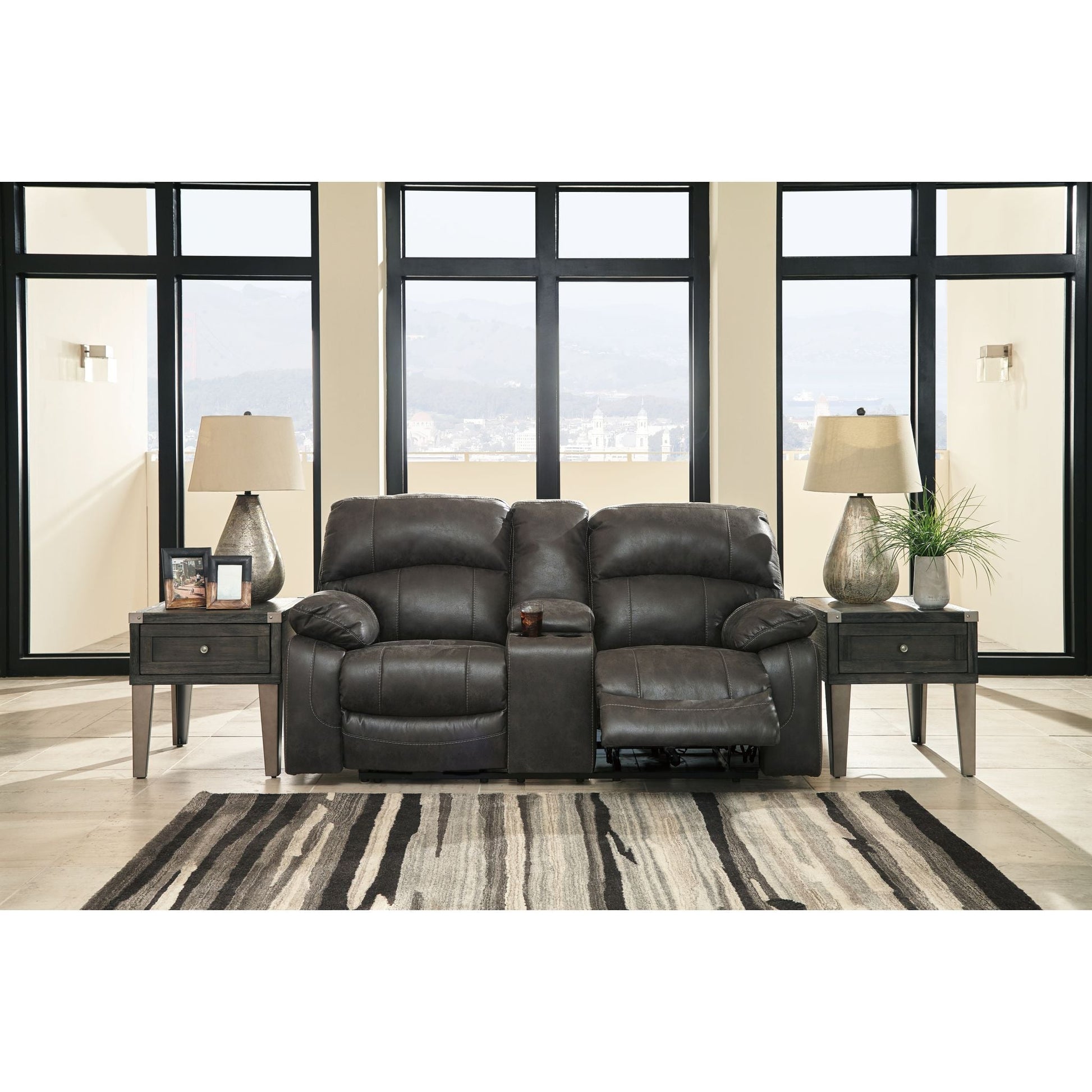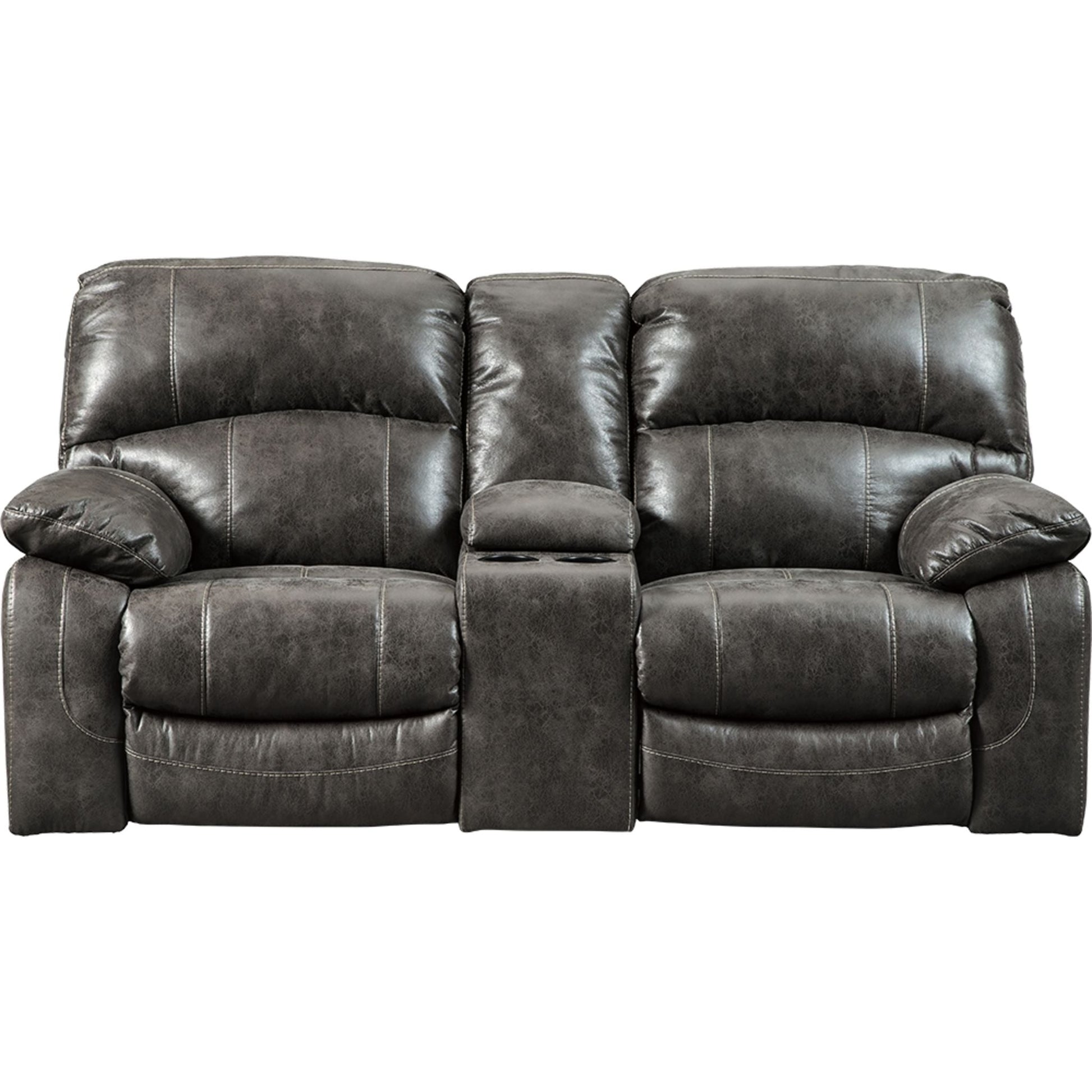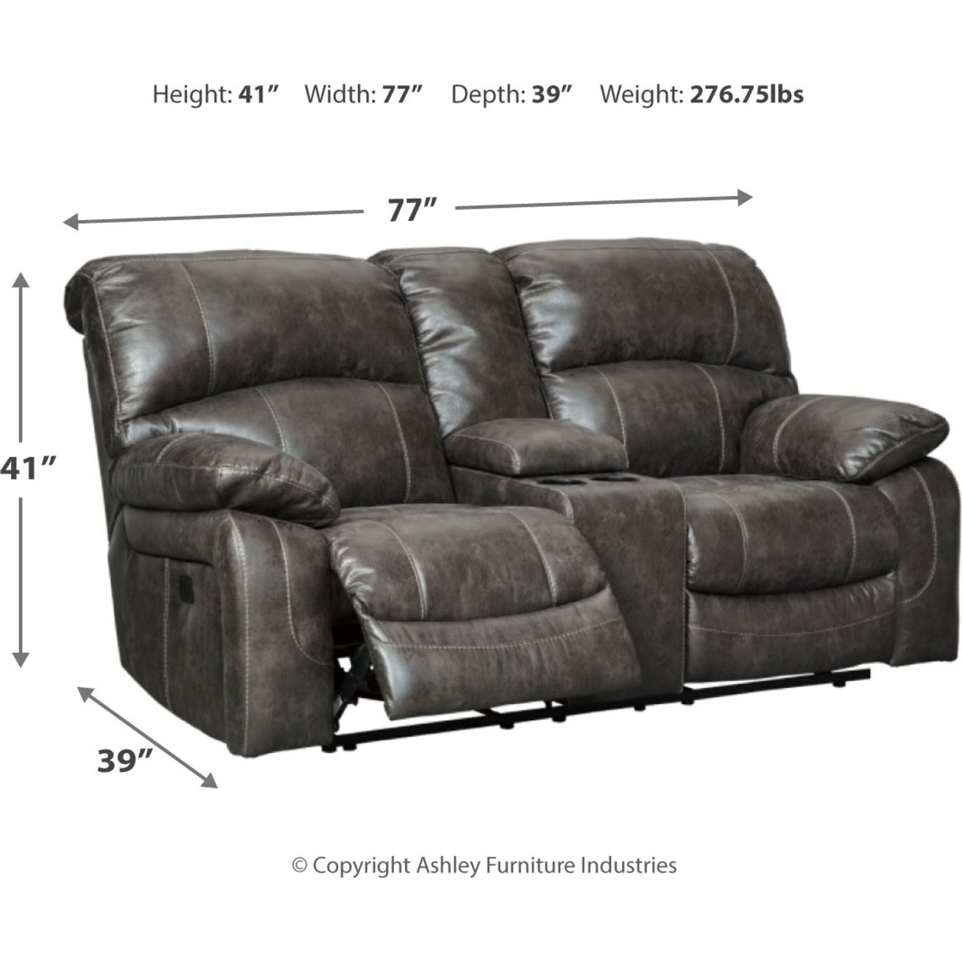 There is power in beauty with this power reclining loveseat. Handsome crackle effect in the upholstery gives the appearance of supple leather but this recliner is all about the warmth of fabric. Contrast jumbo stitching adds a stylish touch. Double stuffed armrests cuff your body in comfort. Adjust your head and recline back with one easy touch. Dual-sided recliner; middle seat remains stationary.
