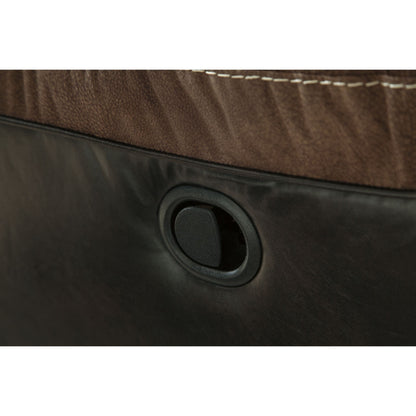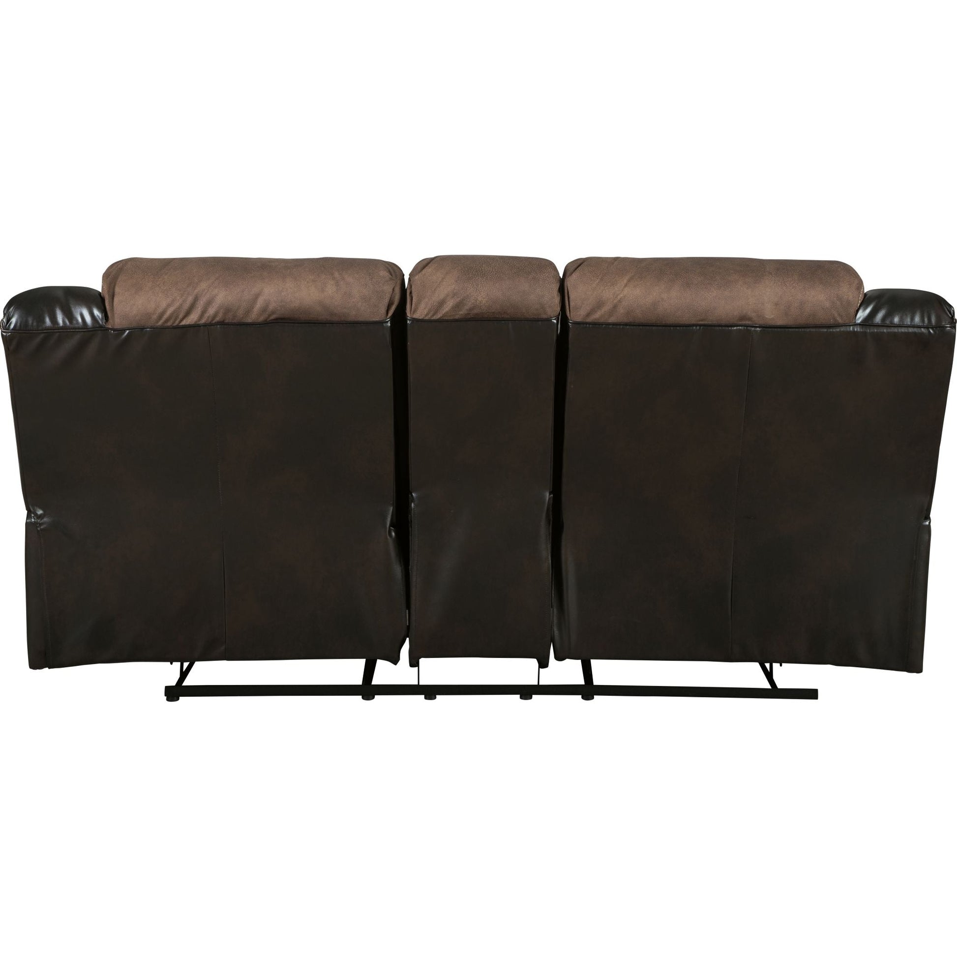 Every day is a good day with this reclining loveseat around. Take a load off and forget your worries as you ease back into the luxurious feel of suede-like fabric. Need more comfort and support for your body? Cue the deep seating and tall back. Contrast jumbo stitching adds an element of style to the cushions. Easily place drinks and small living room essentials in the center storage console with cup holders.